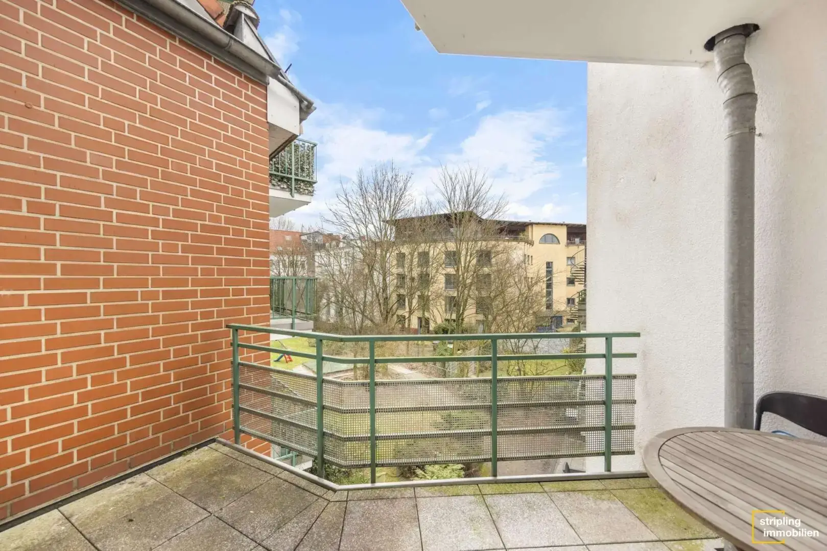 Das größte Zimmer der Wohnung ist das Wohnzimmer. Es befindet sich gegenüber der Eingangstür und hat eine Wohnfläche von etwa 23,44 m². Damit macht das Wohnzimmer fast die Hälfte der gesamten Wohnung aus. Das ist praktisch, denn im Wohnzimmer verbringt man in der Regel die meiste Zeit. Außerdem haben Sie oder Ihre Mieter genug Platz, um Gäste zu empfangen. Bodentiefe Fenster sorgen dafür, dass der Raum vom Tageslicht erhellt wird. Ein Blick aus dem Fenster lohnt sich, denn aus dem zweiten Obergeschoss können Sie wunderbar die Aussicht über den begrünten Innenhof genießen. An das Wohnzimmer schließt sich der Balkon an. Er hat eine Fläche von circa 7,33 m² und ist ebenfalls mit dem Schlafzimmer verbunden. Neben der Möglichkeit, Zeit an der frischen Luft zu verbringen, ist er bei schönem Wetter ideal geeignet, um zum Beispiel die Wäsche zu trocknen. Der darüber liegende Balkon bietet je nach Tageszeit und Witterungsverhältnissen teilweise Schutz vor Sonne und Regen.