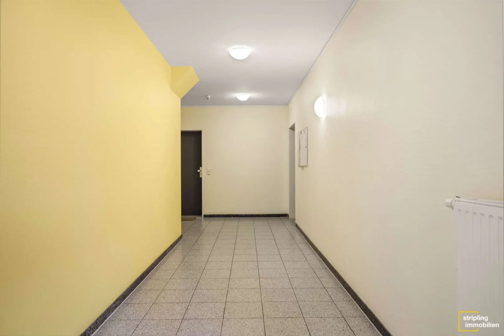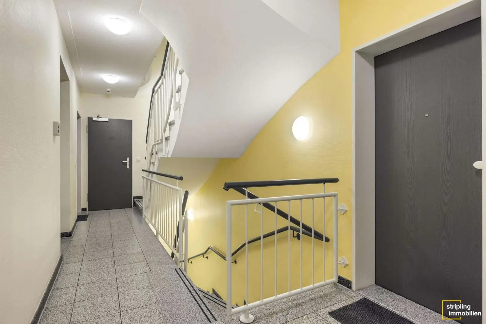 Den Eingangsbereich erreichen Sie oder Ihre Mieter über eine ruhige Nebenstraße abseits der Hauptstraße. Vier Stufen führen hinauf. Aufgrund des darüberliegenden Balkons ist dieser gut vor der Witterung geschützt, sodass Sie die Tür auch bei Regen in Ruhe aufschließen können. Das Treppenhaus ist in einem gepflegten Zustand, gelbe Farbtöne lassen es hell und freundlich wirken.