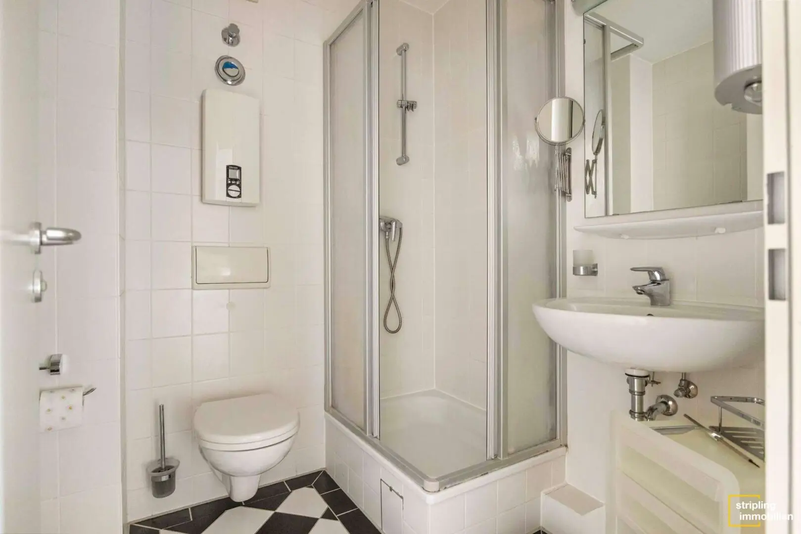 Wenn Sie die Wohnung betreten, gelangen Sie direkt in einen quadratisch geschnittenen Flur, der Platz für eine kleine Garderobe bietet. Rechter Hand befindet sich das innen liegende, etwa 3,55 m² große Badezimmer. Es ist mit einer Toilette, einem Waschbecken und einer Dusche ausgestattet. Weiße Wandfliesen und schwarz-weiße Bodenfliesen verleihen dem kleinen Raum Charakter und bieten die Chance, Farbakzente nach individuellem Wunsch zu setzen.