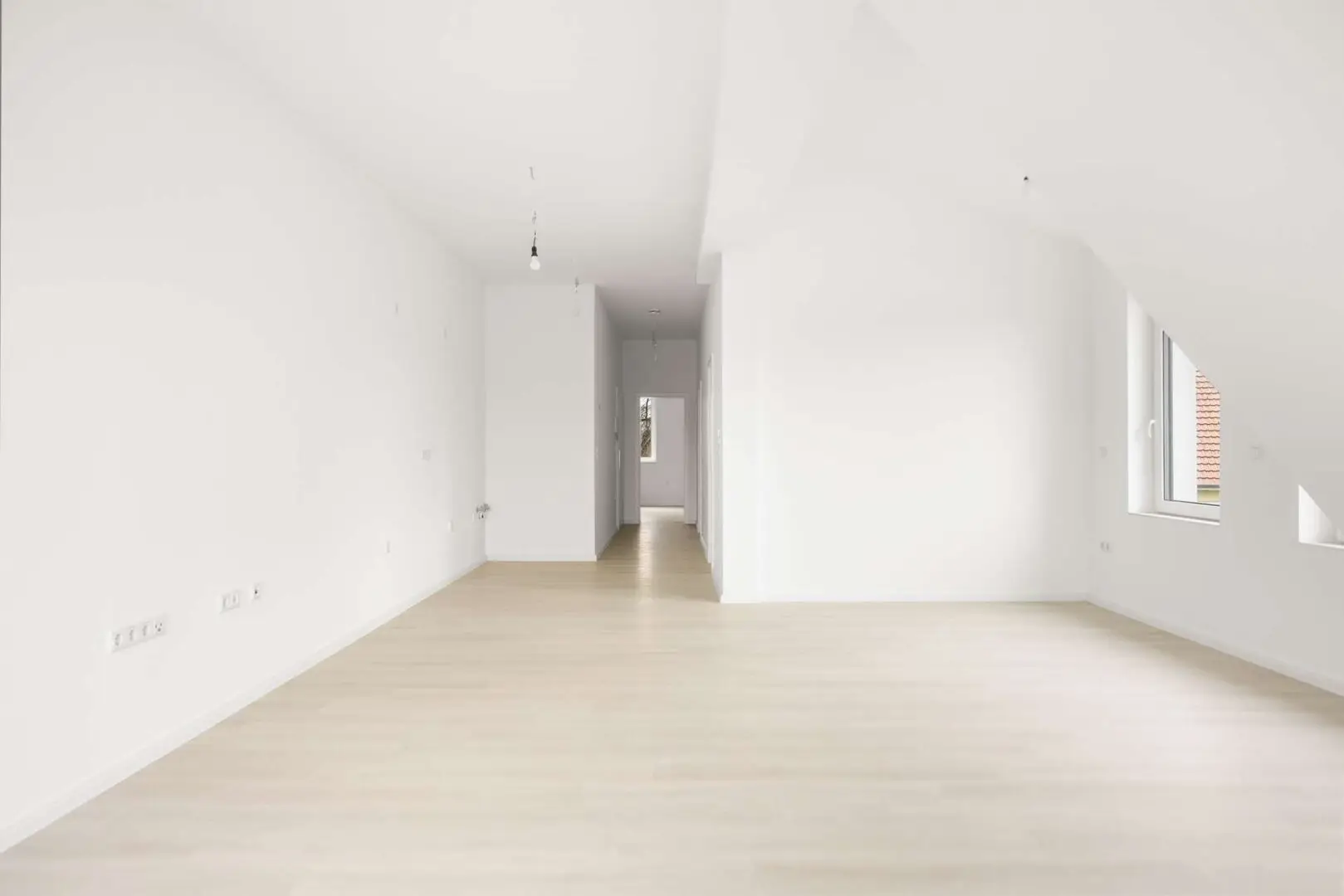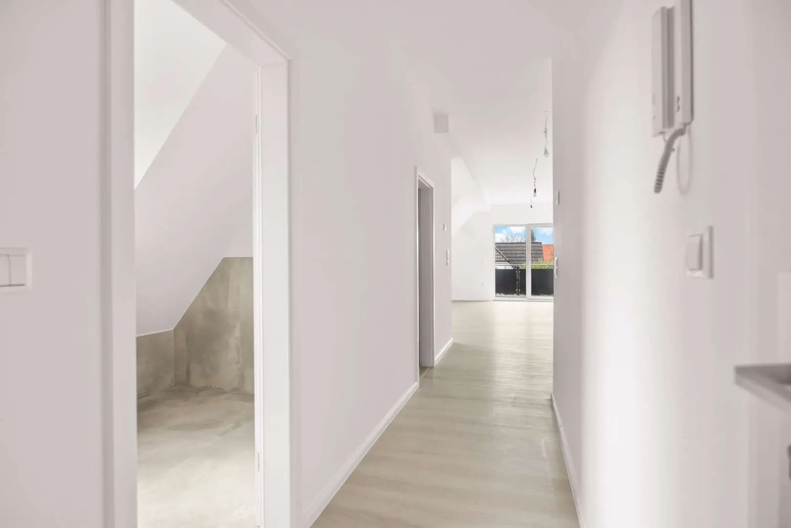 Oben im Dachgeschoss angekommen, öffnet sich hinter der Wohnungstür ein heller, langer Flur mit Vinylboden. Am Ende zieht bereits die bodentiefe Balkontür den Blick nach draußen. Der Wohnbereich ist der größte Raum der Wohnung: zwei Fenster auf der einen Seite, die Balkontür auf der anderen. Der Raum ist den ganzen Tag gut belichtet, und die Dachschräge macht ihn nicht kleiner, sondern gibt ihm seinen eigenen Charakter.