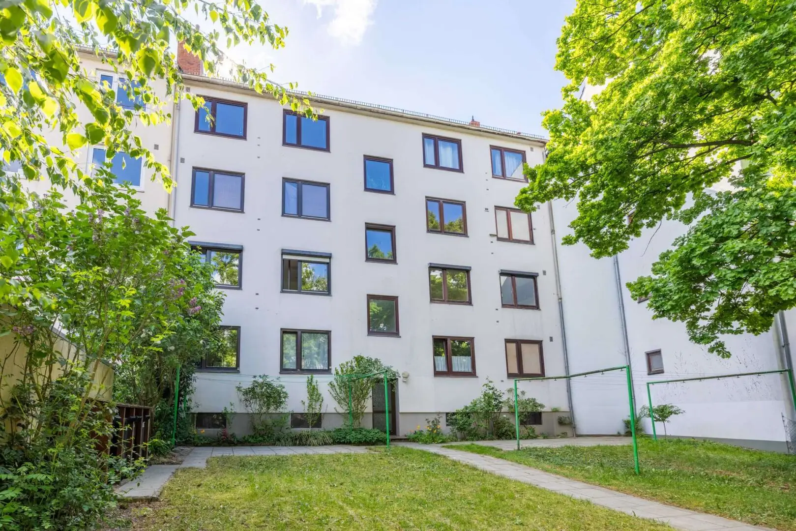 Die Ausstattung wird durch zweifach verglaste Holzfenster (aus 1983 und 2008), eine Gegensprechanlage sowie praktische Nebenräume ergänzt: Ein eigener Kellerraum sowie ein separater Dachbodenabteil bieten wertvollen Stauraum. Die gemeinschaftlich nutzbare Gartenanlage im Hinterhof bringt Natur in den Alltag, während ein Wasch- und Trockenraum sowie ein Fahrradkeller den Wohnkomfort zusätzlich steigern.