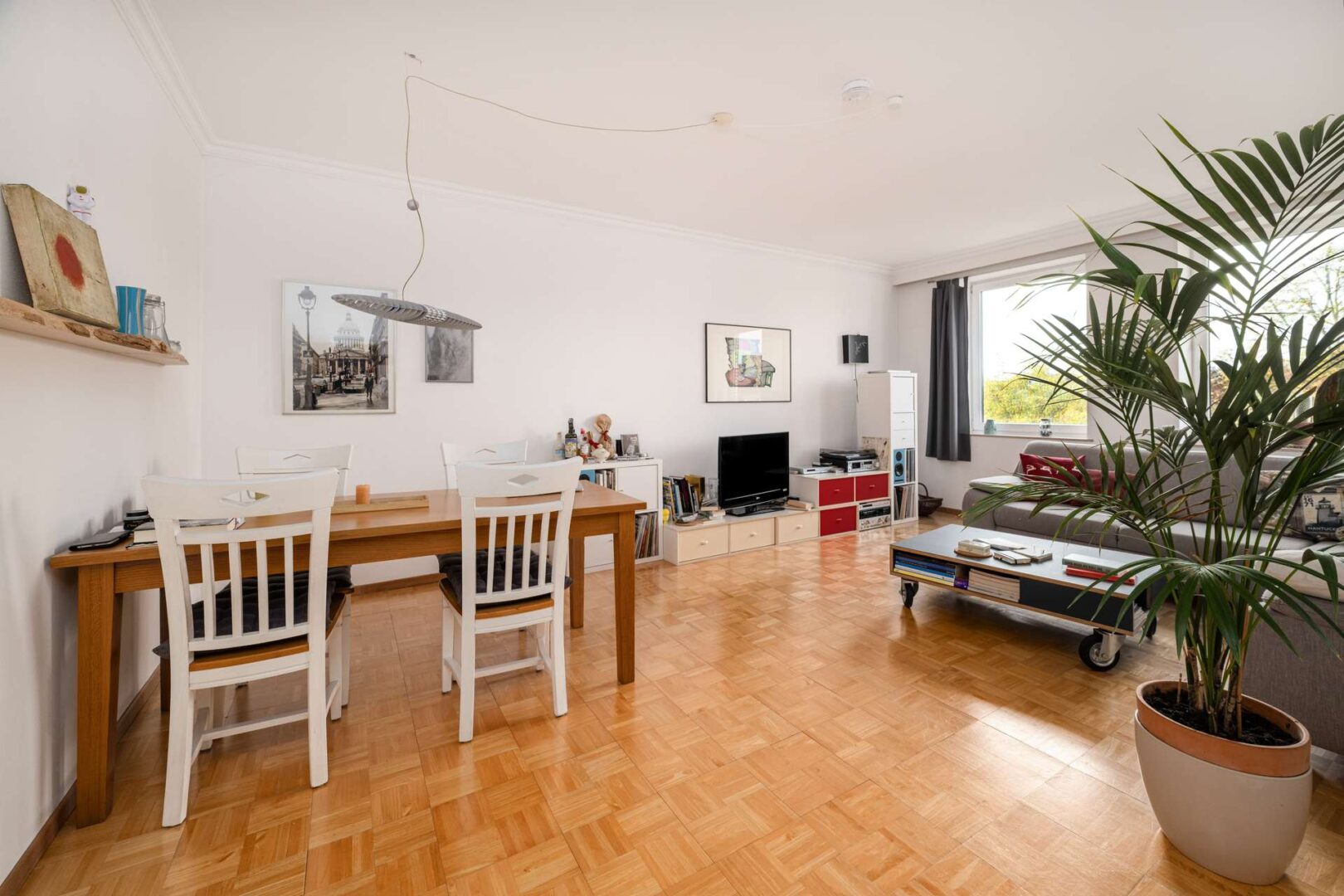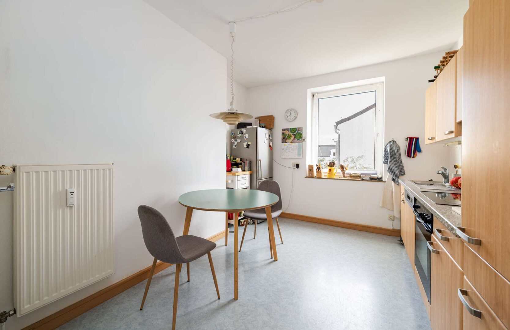 Der Grundriss ist funktional gestaltet und bietet mit drei Zimmern eine flexible Aufteilung für unterschiedliche Wohnbedürfnisse. Zwei separate Schlafzimmer ermöglichen vielfältige Nutzungskonzepte, während der Wohn- und Essbereich ausreichend Raum für ein komfortables Zusammenleben bietet. Die Einbauküche ist bereits vorhanden und wird mit der Wohnung übernommen. Das Badezimmer ist mit einer Duschwanne, WC, Waschbecken und Waschmaschinenanschluss ausgestattet und verfügt über ein Fenster, das für natürliche Belüftung und angenehmes Tageslicht sorgt. Die Bodenbeläge bestehen aus Parkett und Fliesen und verleihen den Räumen eine wohnliche Atmosphäre.