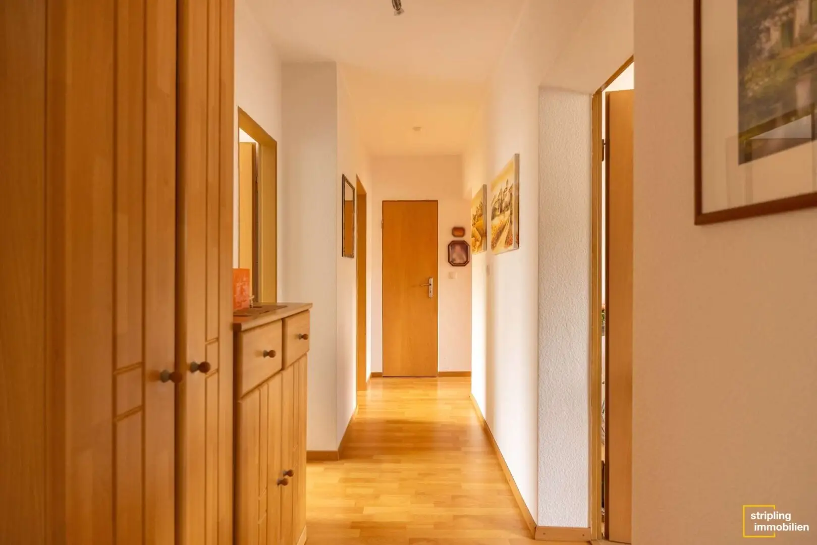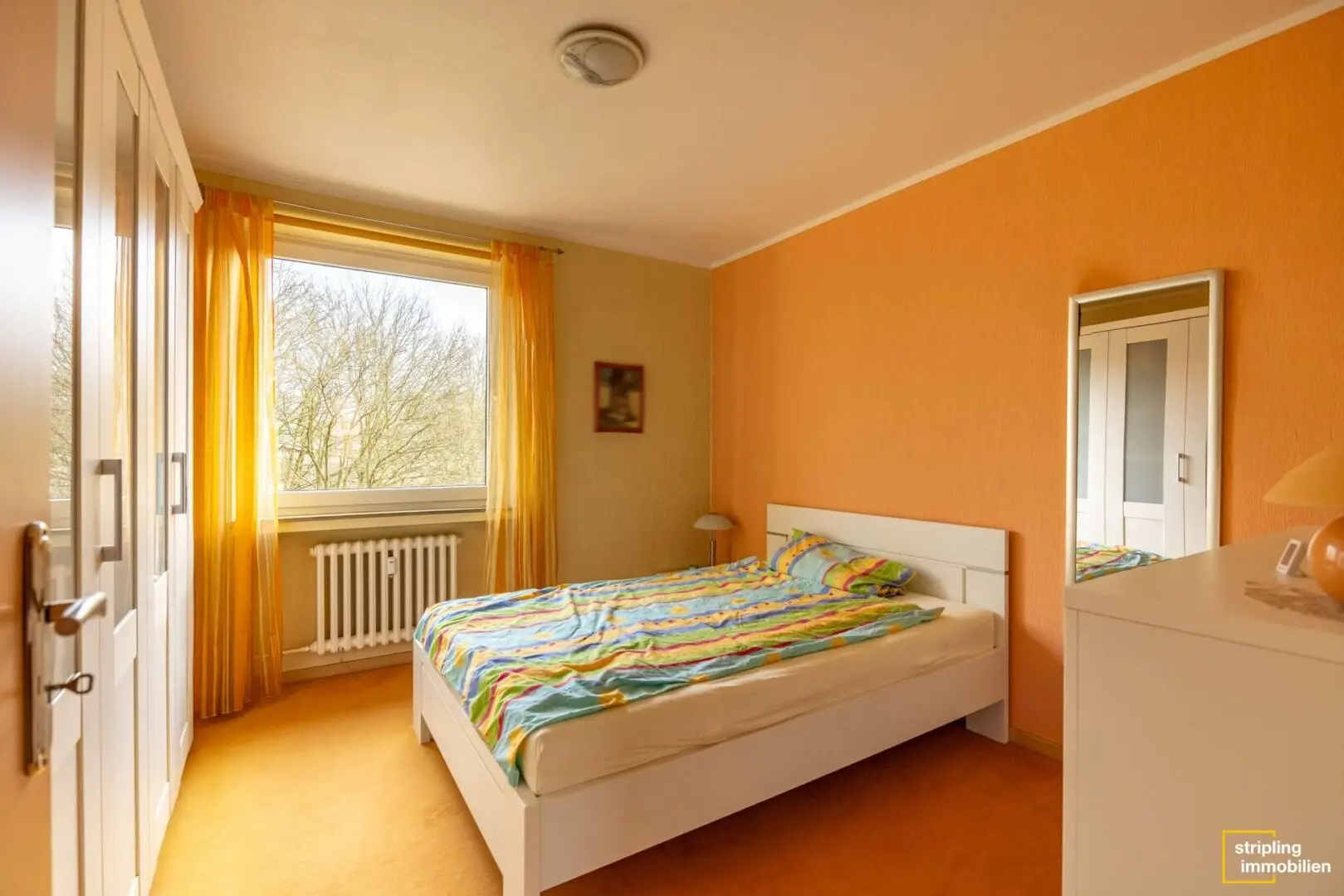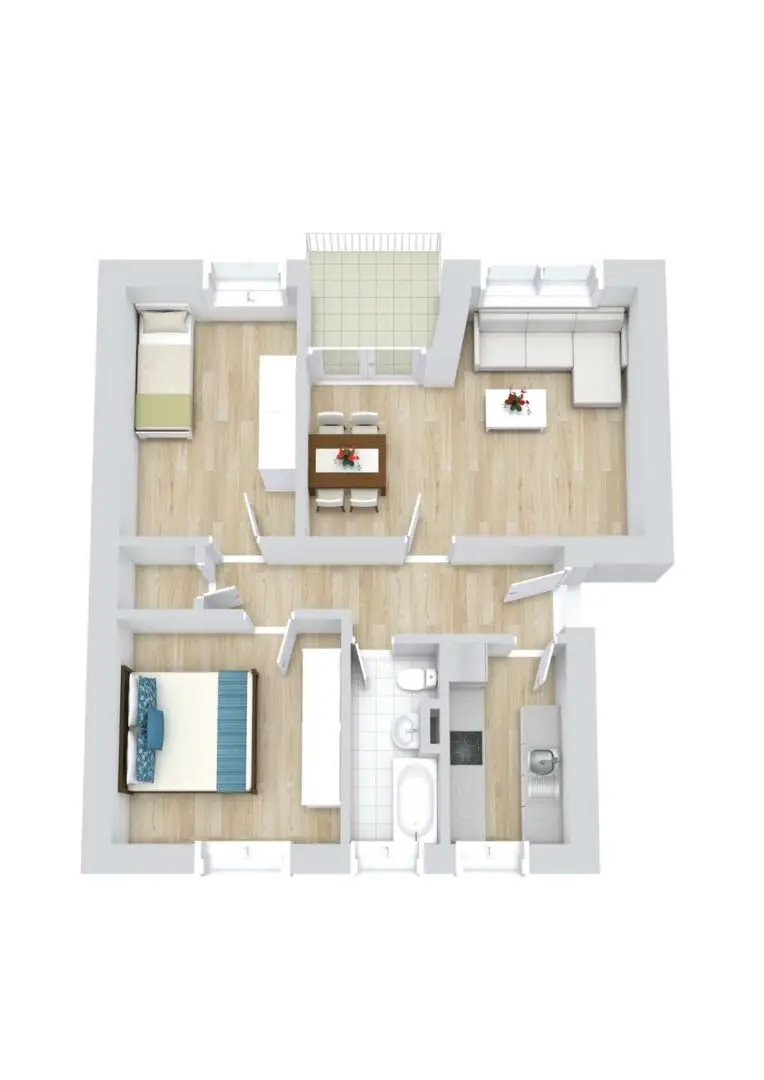 Wenn Sie die Wohnung betreten, gelangen Sie in den lang geschnittenen Flur, der sich durch die komplette Wohnung zieht. Die weißen Wände stehen in einem sehr harmonischen Kontrast zum holzfarbenen Bodenbelag und den Türen und Zargen in Holzoptik gestrichen. Auf der rechten und der linken Seite befinden sich die Türen zu den jeweiligen Zimmern. Es gibt also keine Durchgangszimmer – das erleichtert die Einrichtung. Die letzten Zimmer, an denen Sie vorbeikommen, wenn Sie den Flur entlang gehen, sind die beiden Schlafzimmer. Sie bieten eine Wohnfläche von circa 12,28 m² und circa 11,51 m² und verfügen mittig an der Außenwand über ein Fenster.