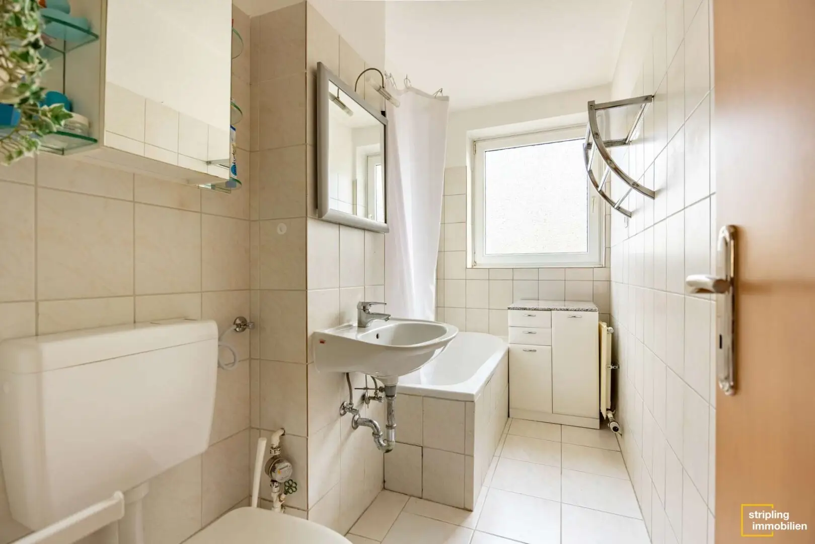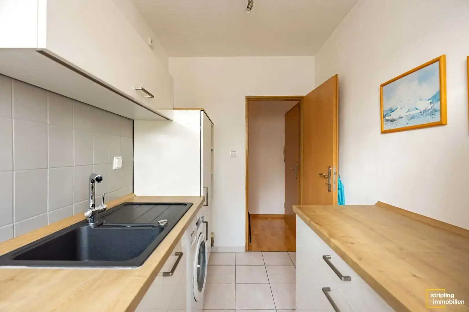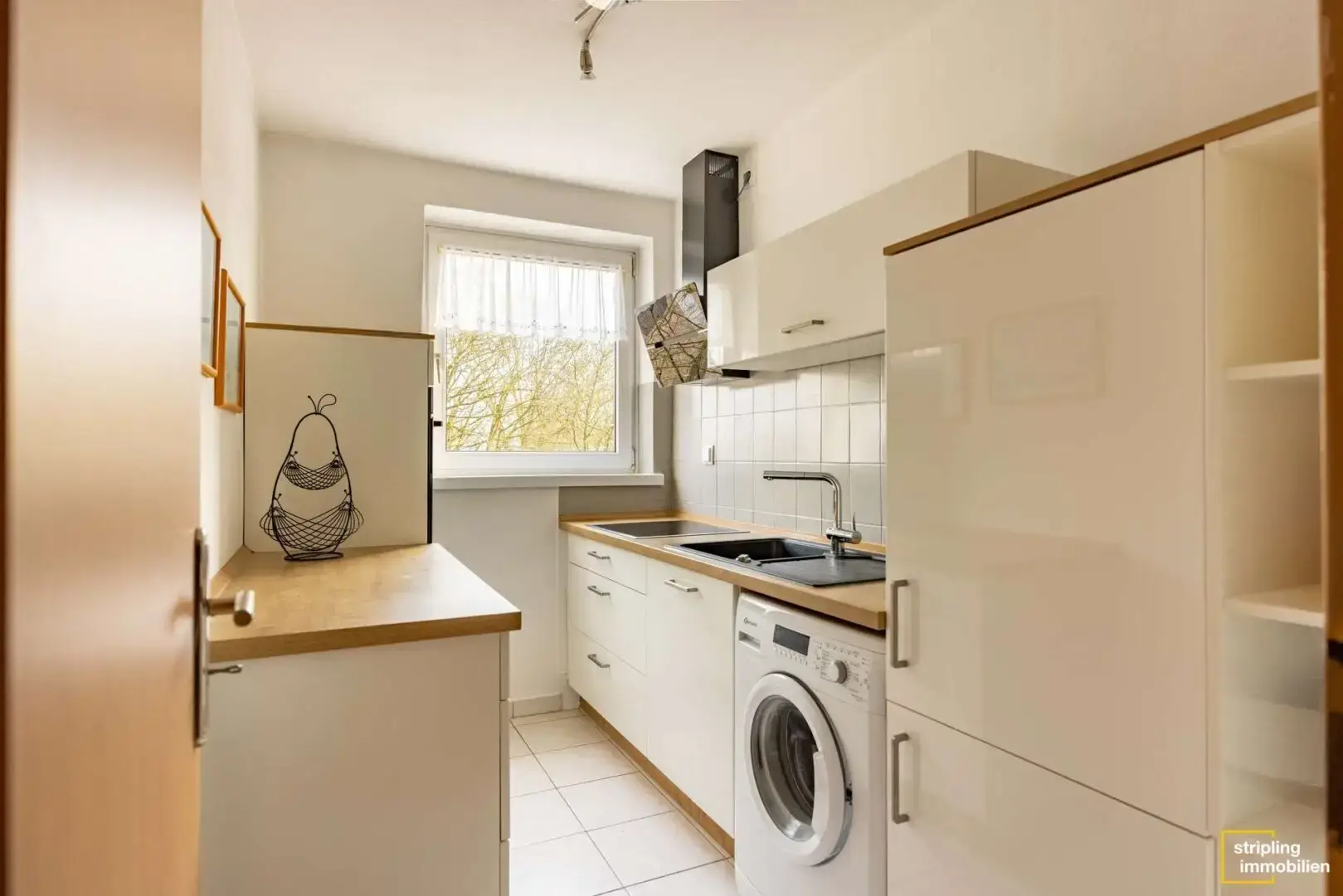 Auf der linken Seite des Flures folgen das etwa 4,13 m² große Badezimmer sowie die Küche, die eine Wohnfläche von circa 5,83 m² umfasst. Das Badezimmer ist hell und neutral gefliest. Neben der Toilette und einem Waschbecken ist ebenfalls eine Duschwanne vorhanden – Sie oder Ihre Mieter können also zur Entspannung ein warmes Bad genießen. Das Fenster sorgt für eine optimale Belüftung und ist für eine optimale Privatsphäre mit einem Sichtschutzglas versehen. Die Küche ist mit einer neuwertigen Einbauküche ausgestattet. Sie stammt aus dem Jahr 2021. Helle Hochglanz-Fronten und Arbeitsplatten in Holzoptik verleihen ihr einen modernen und zugleich zeitlosen Charme. Da sich auch der Waschmaschinenanschluss in der Küche befindet, ist der für Stauraum zur Verfügung stehende Platz sehr begrenzt. Um dies zu lösen, wurden an beiden gegenüberliegenden Wänden Schränke aufgestellt.
