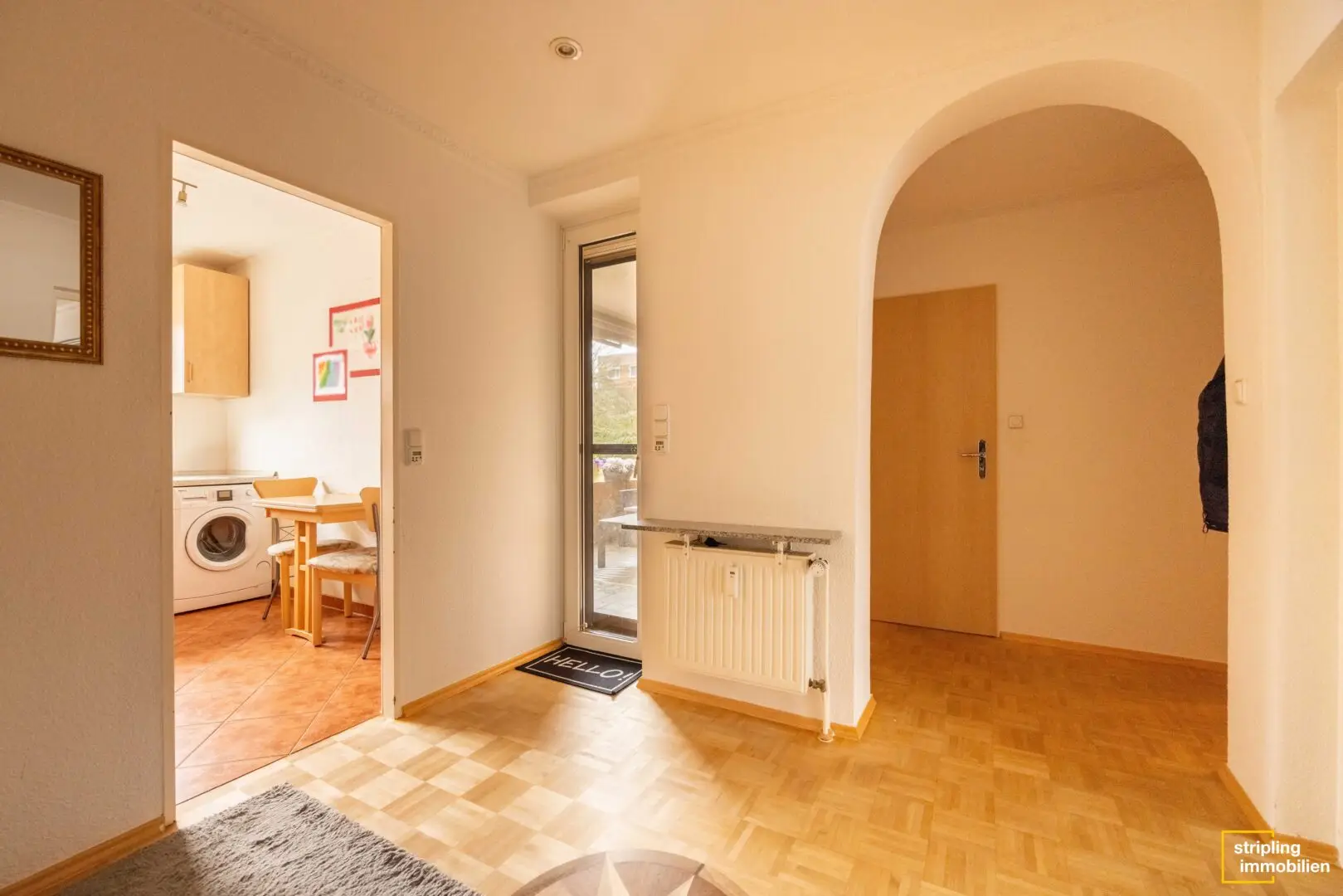 Die erste Loggia hat eine Fläche von circa 8,50 m². Ein perfektes Plätzchen, um die Sonne oder eine schöne Zeit mit den Lieblingsmenschen zu verbringen. Die zweite Loggia ist mit einer Fläche von etwa 3,66 m² kleiner – Platz für einen Wäscheständer bietet sie aber allemal, außerdem befindet sich hier ein weiterer Abstellraum. Oder Sie genießen einfach die wunderschöne grüne Aussicht, die sich durch das große Wohnzimmerfenster ergibt. Apropos Wohnzimmer: Dieses ist mit einer Wohnfläche von etwa 25,1 m² im Verhältnis zur Gesamtwohnfläche sehr groß. Das ist wunderbar, denn dort verbringt man in der Regel die meiste Zeit – allein oder in netter Gesellschaft.