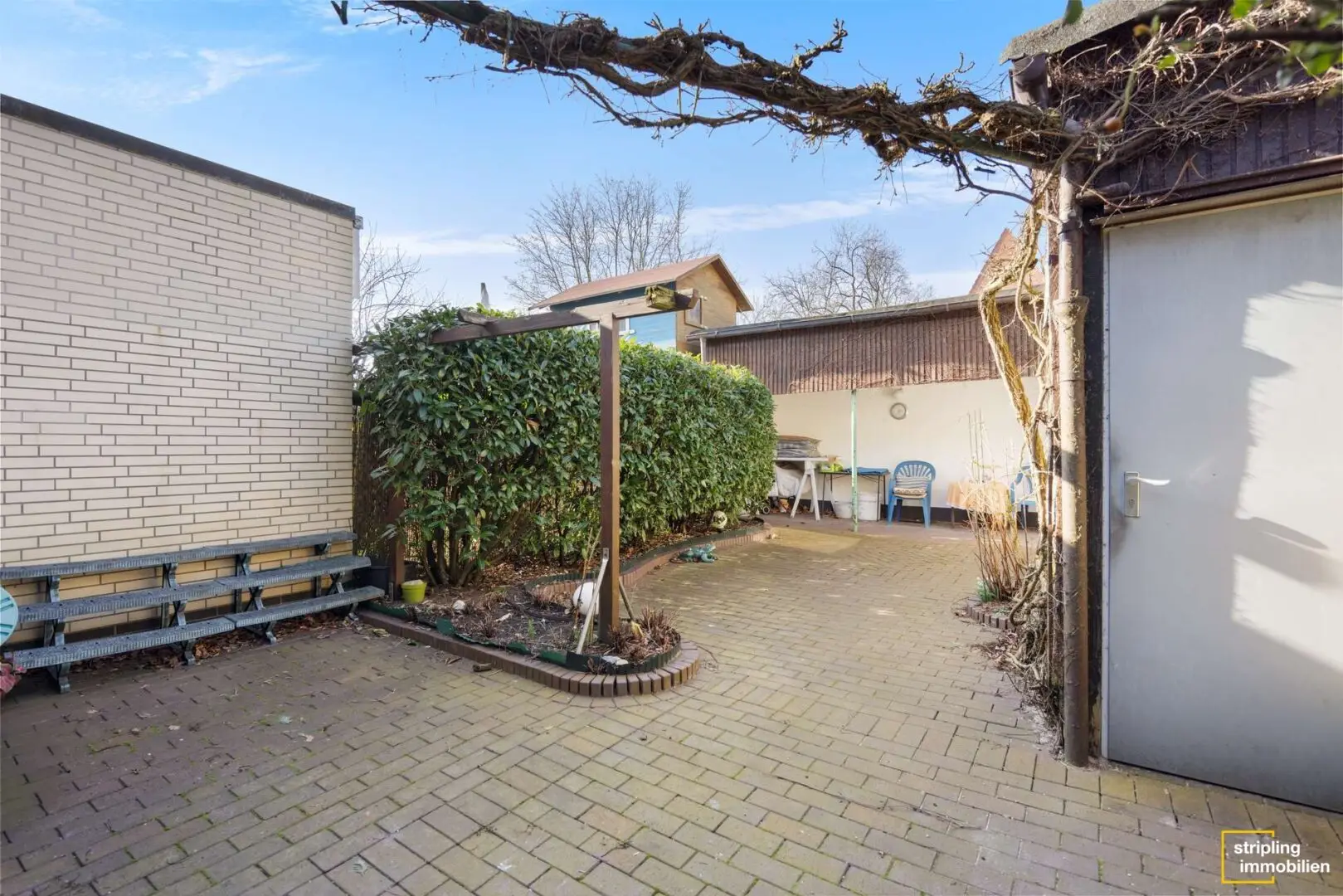 Kommen wir nun noch kurz zum Garten. Er liegt in Nordwestausrichtung und kann wie bereits erwähnt von beiden Parteien genutzt werden. Die Fläche ist gepflastert. Zwei Schuppen bieten eine komfortable Stellfläche, eine teilüberdachte Terrasse lädt zum Verweilen ein. Eine dichte Hecke bietet Sichtschutz zum Nachbargrundstück.