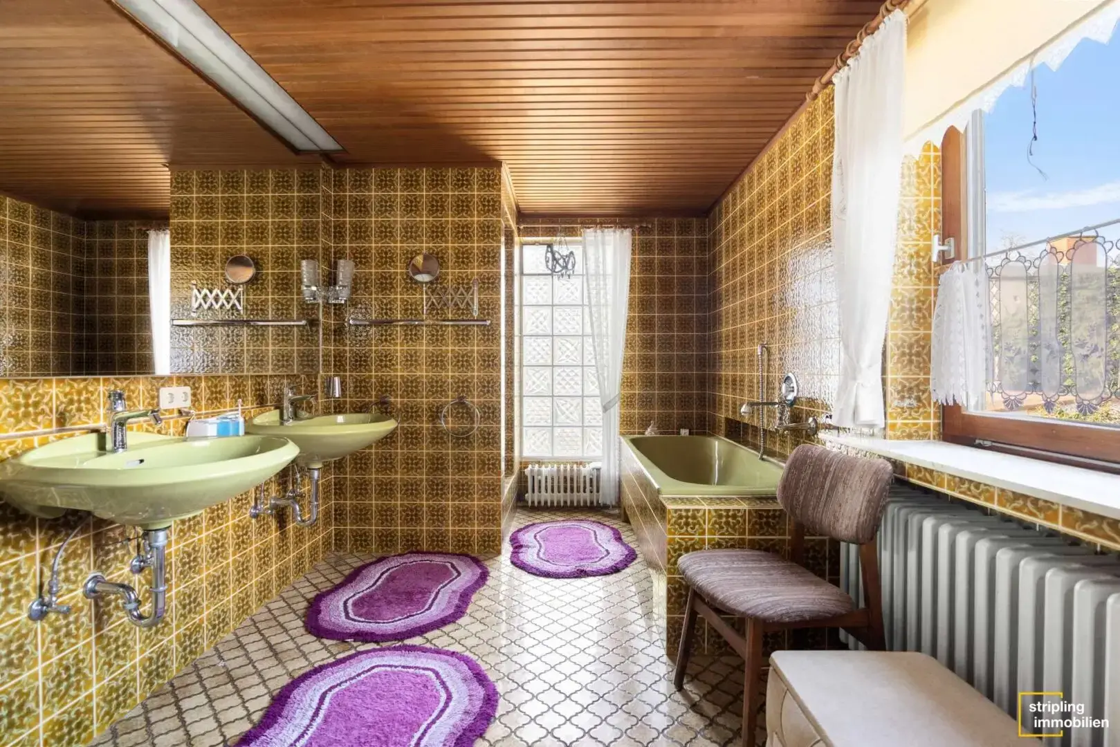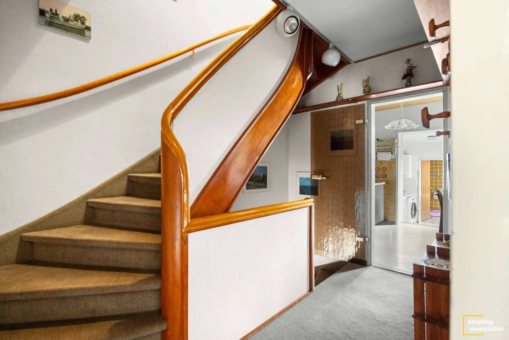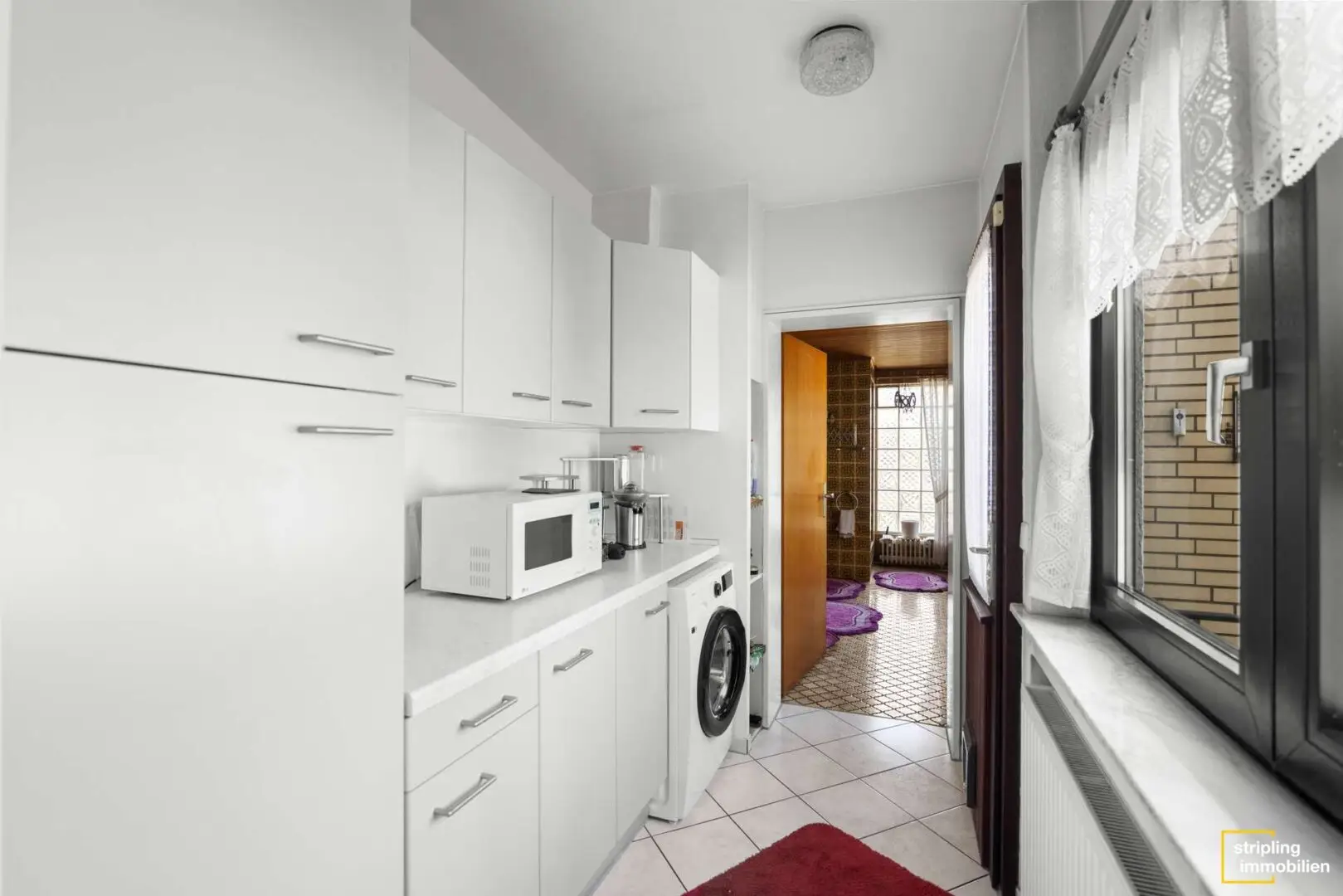 Die Küche ist ebenso wie in der Wohnung ein Durchgangszimmer und mit einer rustikalen Einbauküche ausgestattet. Dahinter gelangen Sie in einen Hauswirtschaftsraum mit Waschmaschinenanschluss und auch das Badezimmer mit Waschbecken, WC, Badewanne, Dusche und Fenster befindet sich in diesem Bereich.