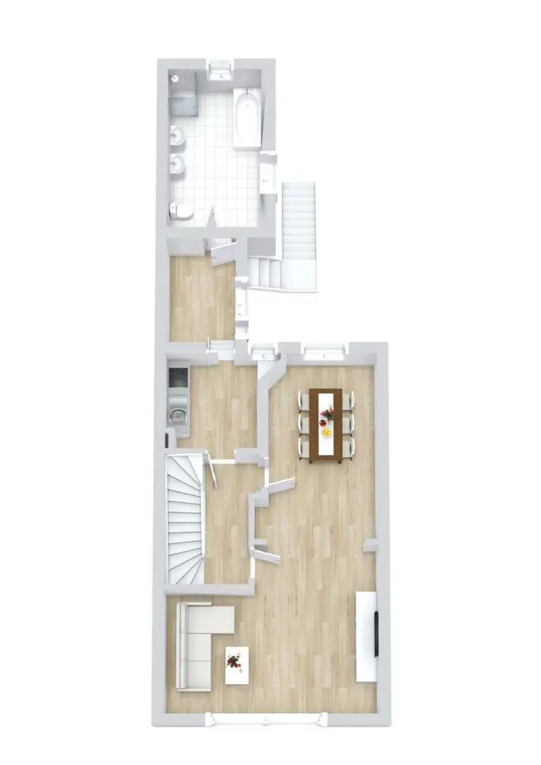 Die 2-Zimmer-Wohnung im Erdgeschoss ist wie folgt aufgeteilt: Das circa 17,12 m² große Wohn- und Esszimmer, das etwa 11,79 m² große Schlafzimmer und die circa 6,44 m² große Küche sind allesamt mit dem Flur verbunden. Hinter der Küche befinden sich ein weiterer kleiner Flur, ein separates WC und das Badezimmer mit Waschbecken, Dusche, Badewanne und Fenster. Die Küche ist also ein Durchgangszimmer. Des Weiteren gibt es in dem zweiten Flur eine Tür zum gepflasterten Garten und zur Terrasse. Zur Erdgeschosswohnung gehört ebenfalls ein etwa 8,98 m² großer Kellerraum.