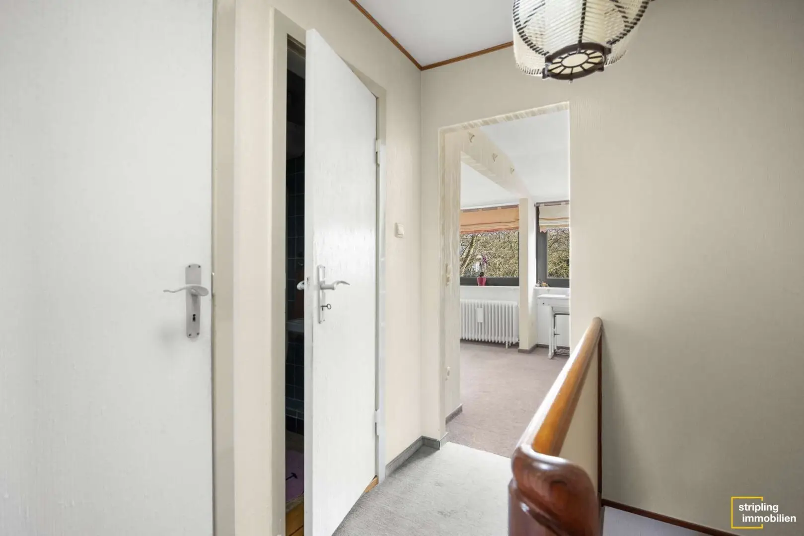 Bei der Wohnung im Obergeschoss handelt es sich um eine 3-Zimmer-Wohnung. Sie erstreckt sich über zwei Ebenen und hat über eine Außentreppe ebenfalls einen Zugang zum Garten und zur Terrasse. Im Obergeschoss befindet sich ein offenes Wohn- und Esszimmer. Die ehemals vorhandene Zwischenwand wurde entfernt, um einen großzügigeren Raum zu schaffen. Ein Rundbogen markiert formschön den Übergang. Aus diesem Grund hat der Raum auch zwei Zimmertüren. Das erweist sich als großer Vorteil, denn die Küche liegt direkt neben dem Essbereich. So haben Sie kurze Wege, um Geschirr und Speisen zu transportieren. Dank der gegenüber liegenden Fenster wird der gesamte Raum von Tageslicht durchflutet.