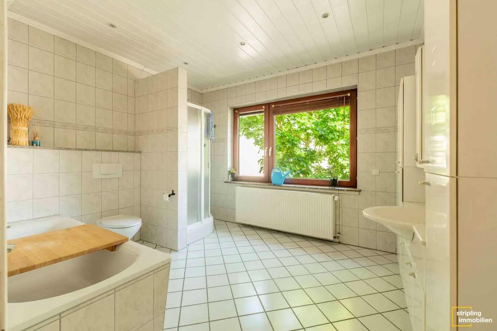 • 1 Badezimmer mit Fenster, Dusche, Badewanne und Waschmaschinenanschluss