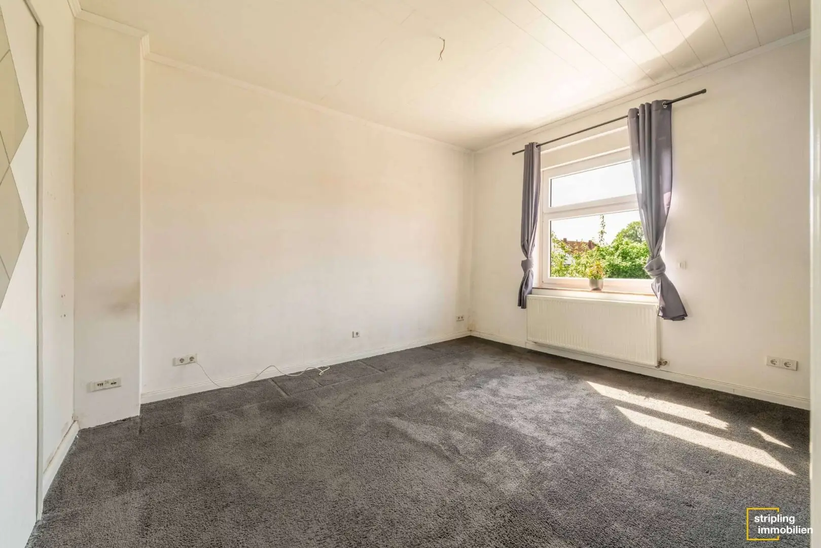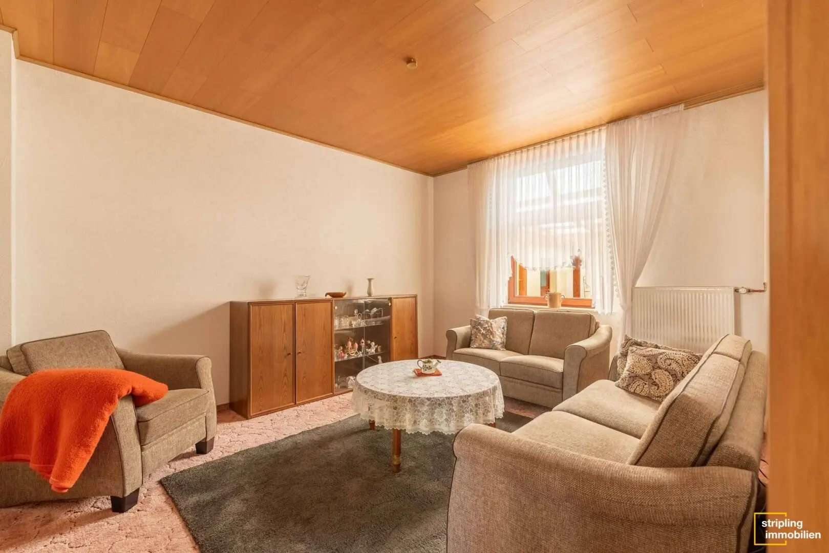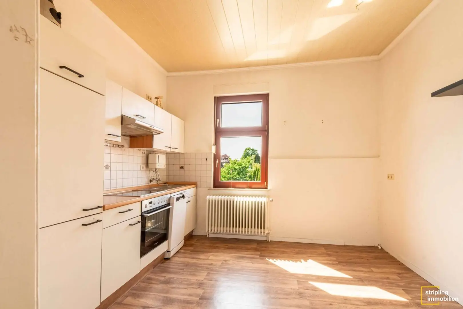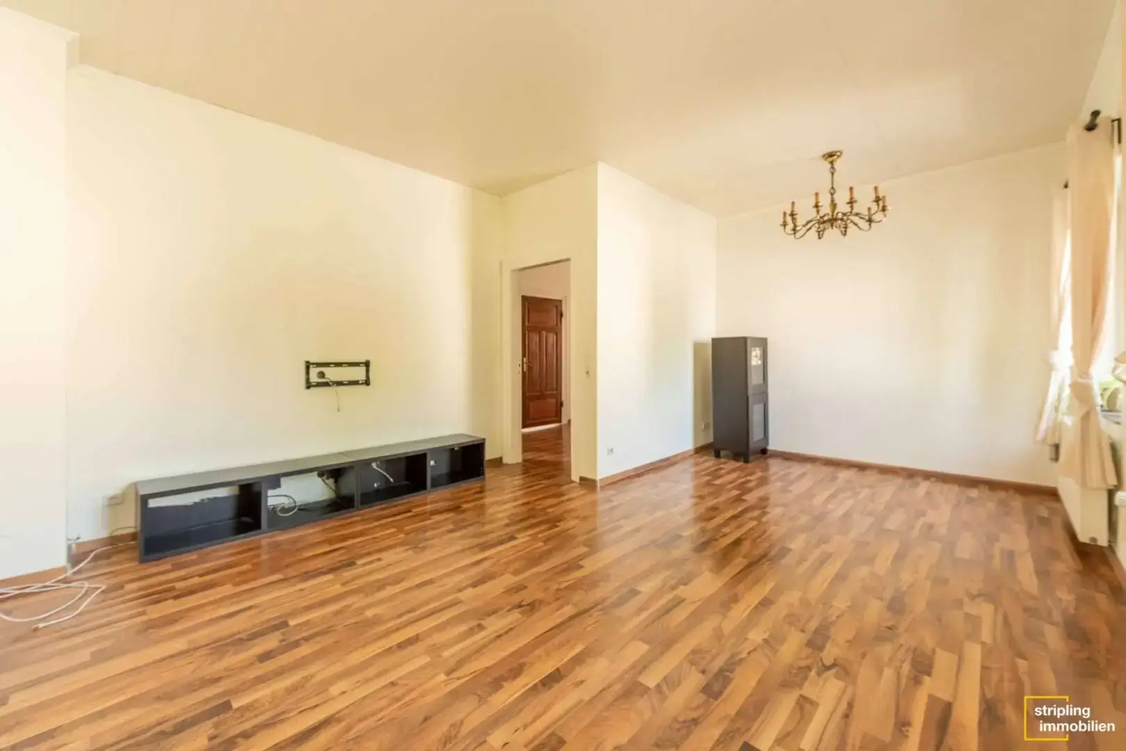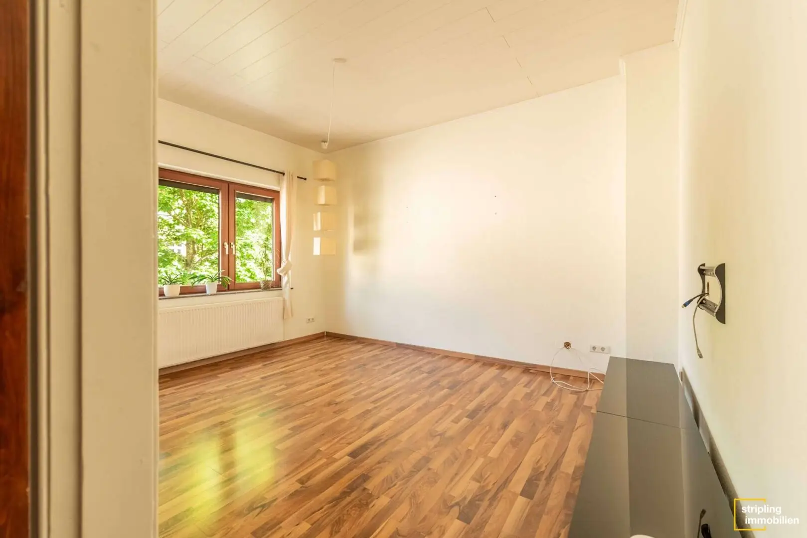 Auf der gegenüberliegenden Seite des Flures befindet sich der Zugang zum offenen Wohn- und Essbereich, der mittels eines Durchbruchs verbunden ist. Dank einer eingebauten Zwischentür kann bei Bedarf zusätzliche Privatsphäre geschaffen werden. Das Wohn- und Esszimmer sowie das vordere Schlafzimmer sind im Übrigen mit einer Holzdecke verkleidet.