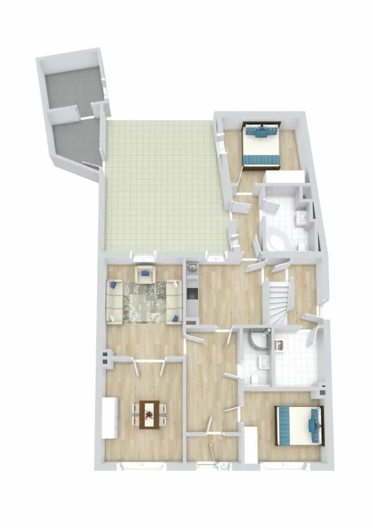Die Wohnung besteht aus 3,5 Zimmern: zwei Schlafzimmer, ein Badezimmer, eine Küche, zwei Abstellräume sowie ein ausgebautes Dachgeschoss. Das Hauptbadezimmer mit Fenster befindet sich auf der unteren Ebene und hat eine Größe von etwa 10,10 m² – es bietet Platz für eine Dusche, eine Badewanne, Waschbecken und WC und hat einen Waschmaschinenanschluss. Das zweite WC im Dachgeschoss ist etwa 2,66 m² groß und mit Dusche, WC, Waschbecken und Handtuchheizkörper ausgestattet. Die beiden Schlafzimmer sind mit etwa 21,94 m² und 16,24 m² sehr großzügig geschnitten, ebenso wie die Küche mit ihren circa 11,88 m² - die Einrichtungsmöglichkeiten sind vielfältig. Die Nutzfläche auf dem Dachboden lässt sich zum Beispiel als Wohnbereich oder Hobbyzimmer nutzen – lassen Sie Ihrer Kreativität freien Lauf.