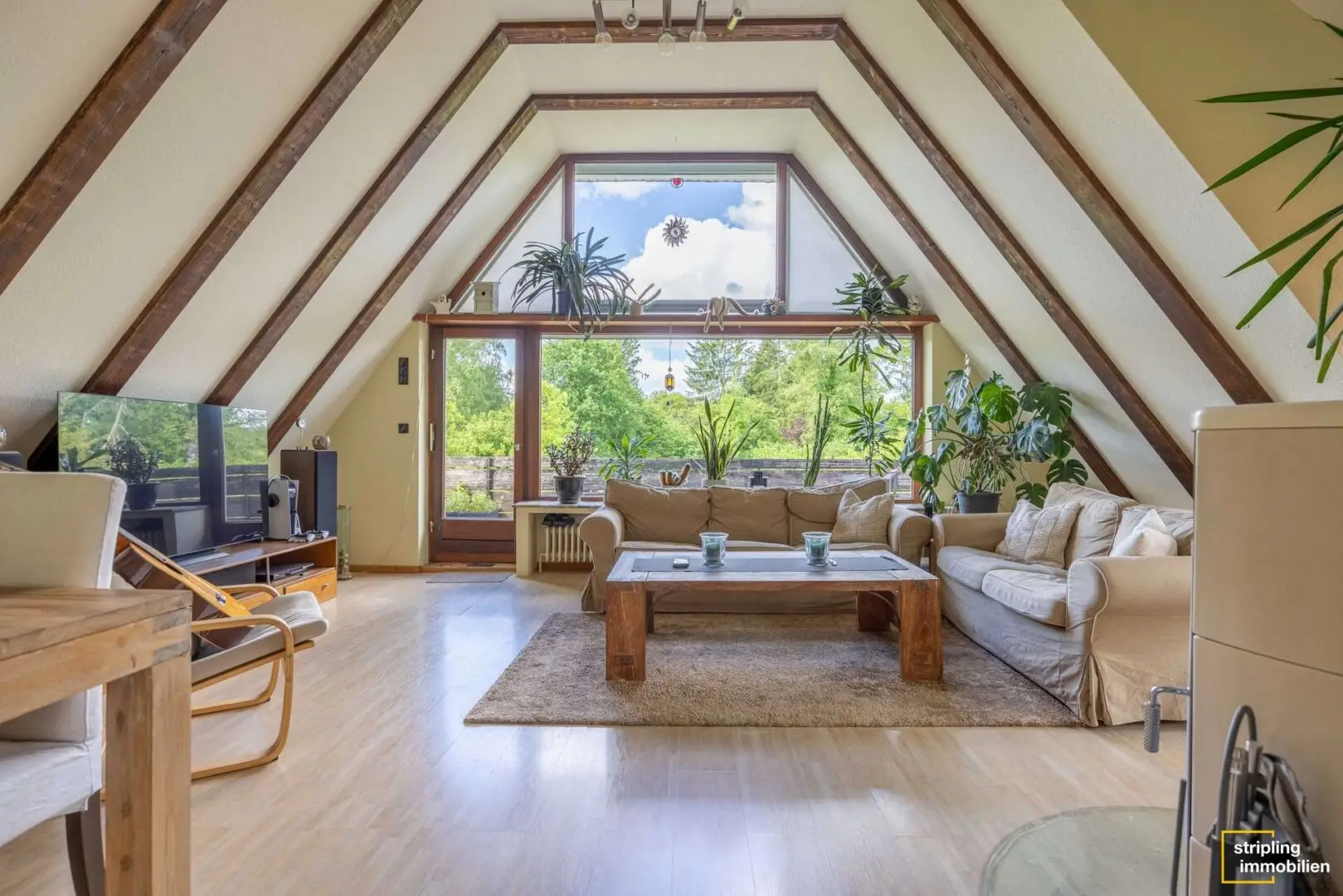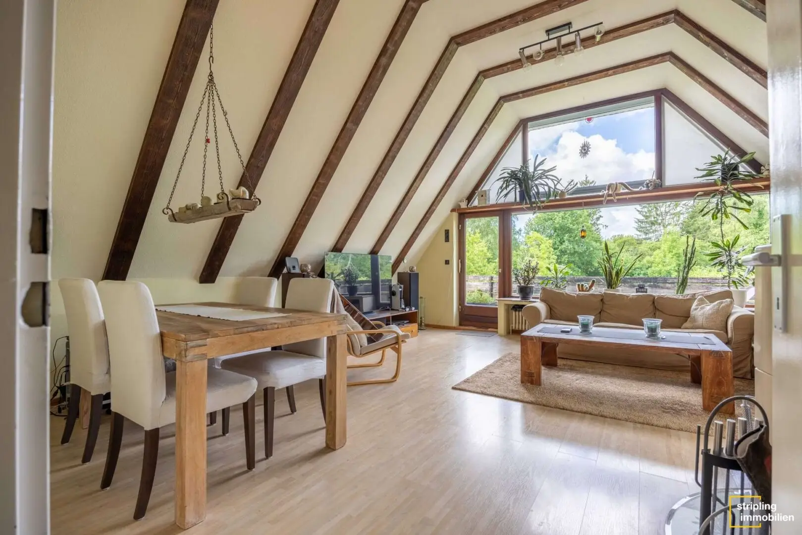 Auf rund 102,05 m² Wohnfläche entfaltet sich ein durchdachtes Raumkonzept, das sowohl funktional als auch atmosphärisch überzeugt. Mittelpunkt der Wohnung ist der großzügige Wohn- und Essbereich mit Kamin und Klimaanlage – ein lichtdurchfluteter Raum, der zu jeder Jahreszeit höchsten Wohnkomfort bietet. Während der Kamin an kühlen Tagen für wohlige Wärme sorgt, schafft die Klimatisierung im Sommer angenehme Frische. Der angrenzende Balkon eröffnet den Blick in den grünen Gartenbereich und lädt zum Entspannen im Freien ein.
