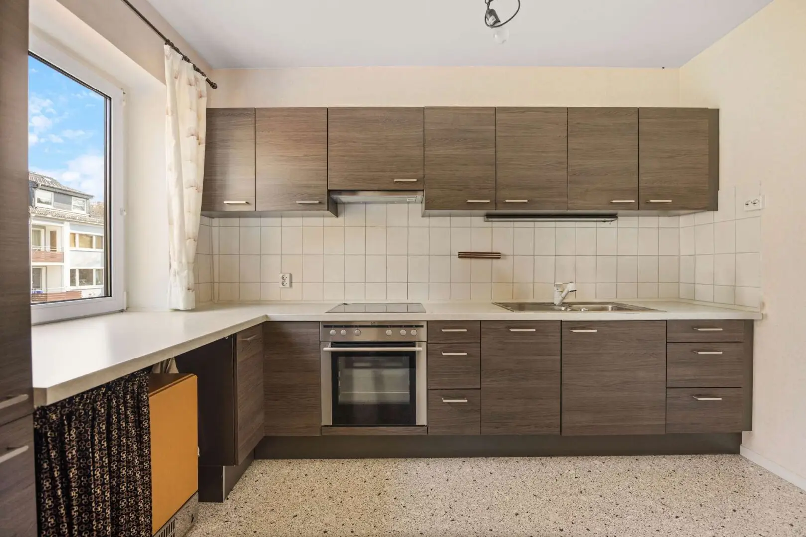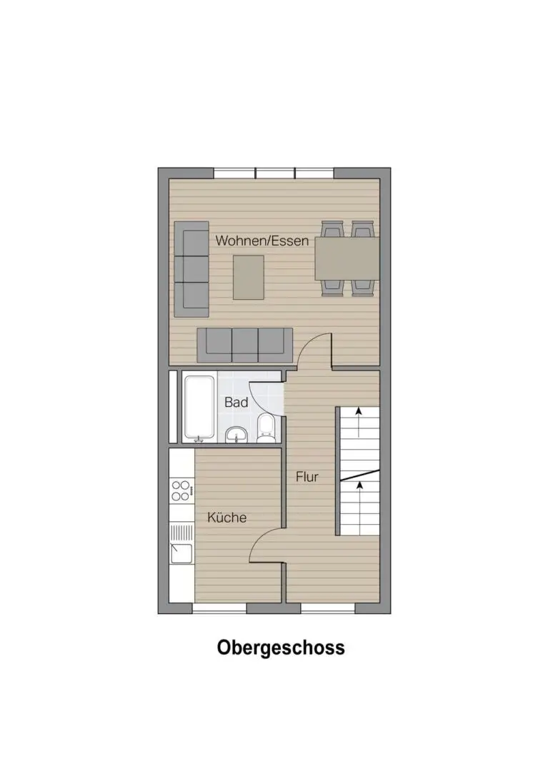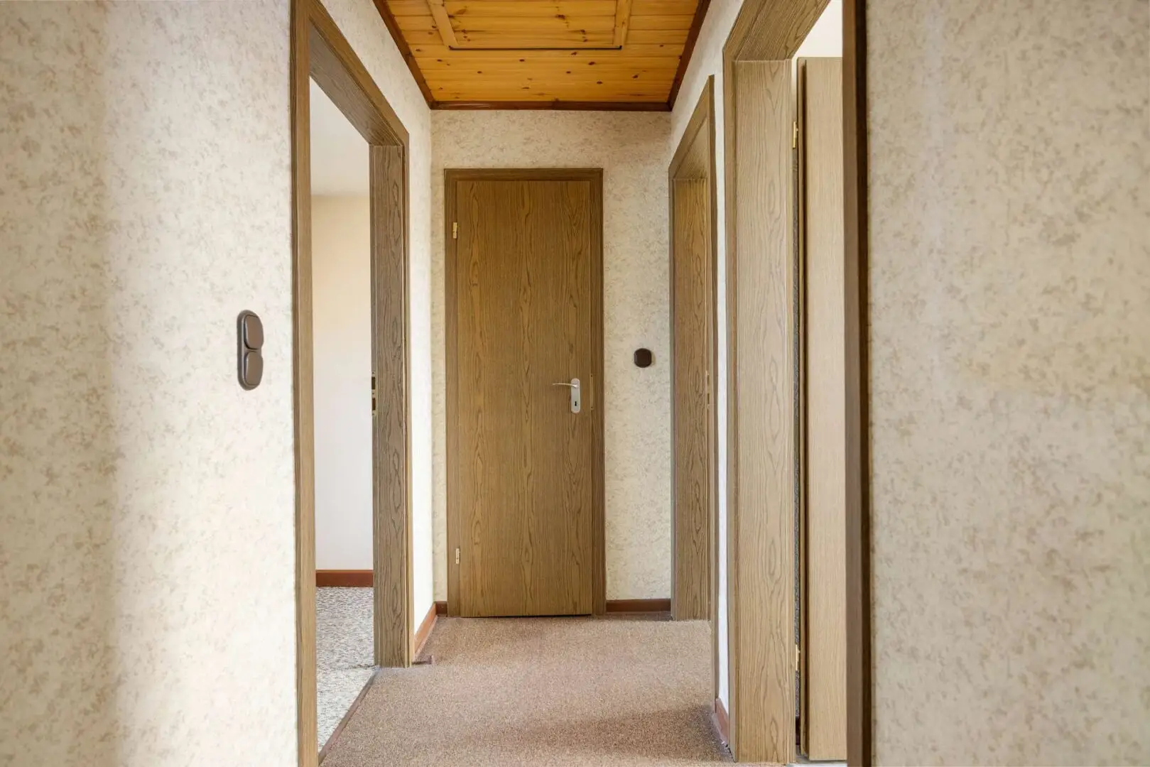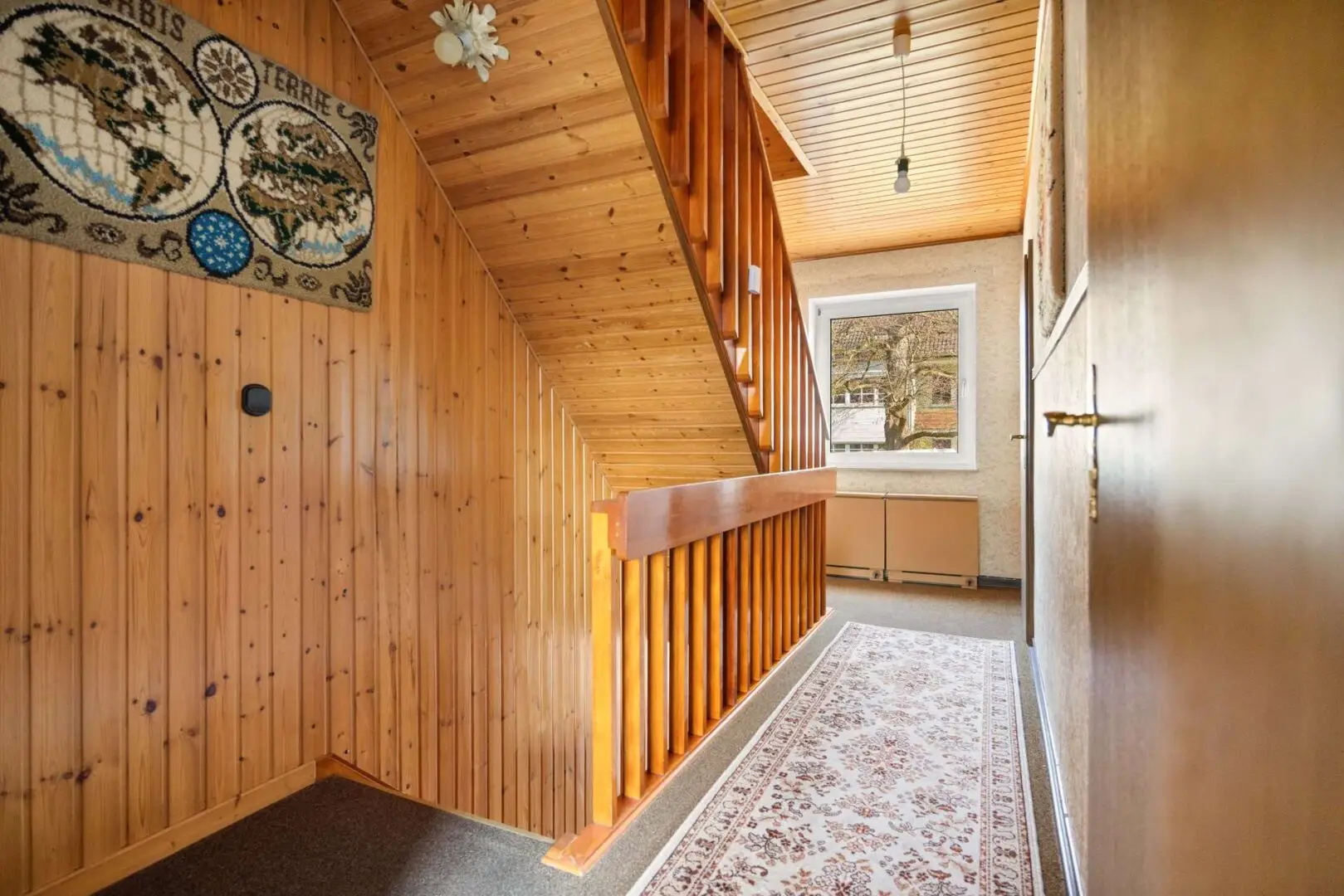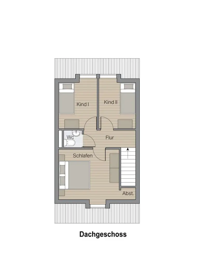 Eine Treppe führt ins Obergeschoss, wo der eigentliche Wohnalltag beginnt. Ein geräumiger Wohnbereich gibt Platz für einen Essbereich, und die angrenzende Küche, welche bereits mit Einbauküche ausgestattet ist, wäre sofort nutzbar. Ein zweites Badezimmer mit Duschwanne und Toilette gibt dieser Etage eine eigene Infrastruktur, die Morgen und Abend entspannter werden lässt. Das Dachgeschoss gehört den privaten Räumen: Drei Schlafzimmer verteilen sich auf diese Ebene – für Eltern, Kinder oder ein ruhiges Arbeitszimmer – ergänzt durch ein separates Gäste-WC. Wer auch oben noch Stauraum sucht, findet ihn im gedämmten Spitzboden, der sich für Gepäck, Saisonales und alles andere anbietet, was selten gebraucht wird, aber einen festen Platz verdient.