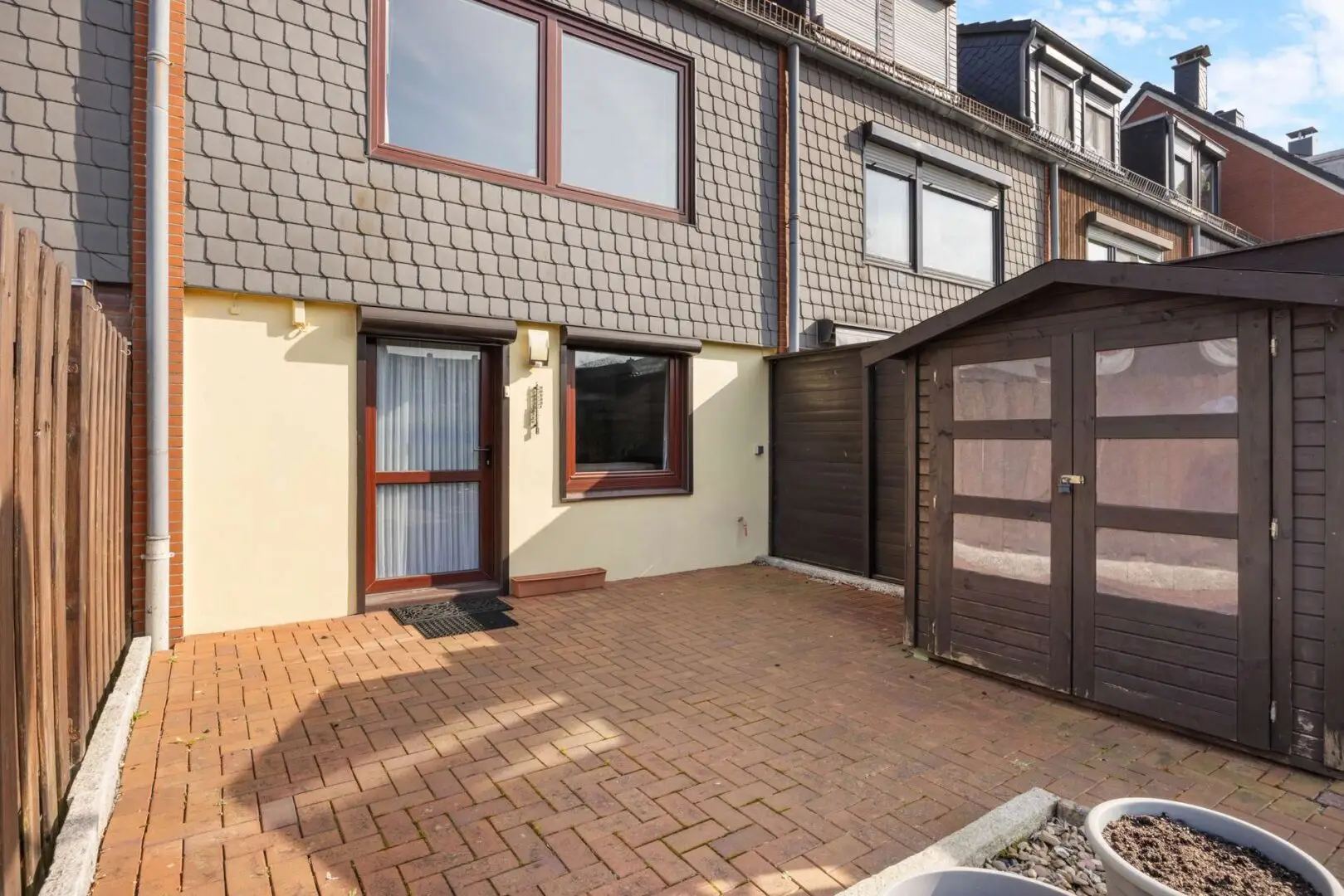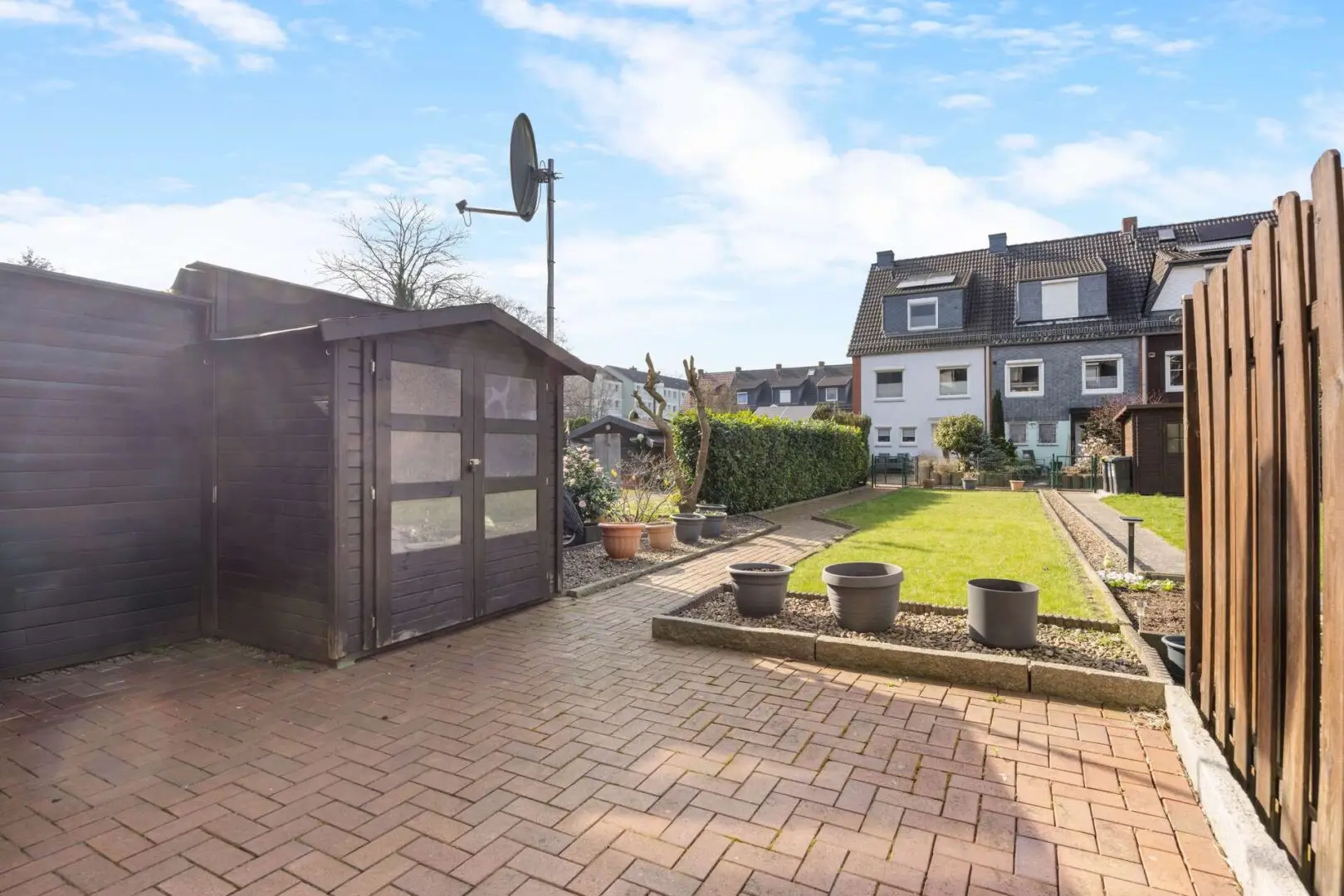 Draußen zeigt das Haus, was den Alltag hier angenehm machen wird: Die Terrasse in Südwestausrichtung misst rund 20,65 m² – groß genug für einen Esstisch mit Stühlen, und die Ausrichtung sorgt dafür, dass die Abendsonne lange bleibt. Der anschließende Garten ist gepflegt, ebenfalls nach Südwesten ausgerichtet und sofort genießbar – eine Außensteckdose und ein Wasseranschluss sind bereits vorhanden. Ein Geräteschuppen nimmt Rasenmäher, Schaufel und Gartenstühle auf, ohne dass der Freiraum selbst darunter leidet.