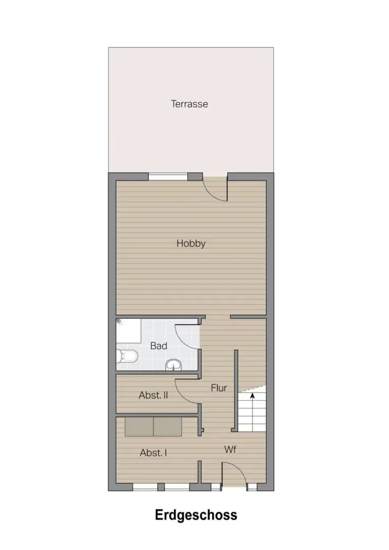 Sie betreten das Haus durch einen Windfang, der Witterung zuverlässig draußen hält. Der Flur des Erdgeschosses öffnet sich direkt in einen Hobbyraum mit eigenem Zugang zur Terrasse – ein Raum, der je nach Bedarf auch als Wohnzimmer genutzt werden kann, weil der Übergang nach draußen das Raumgefühl deutlich weitet. Hauswirtschaftsraum und Abstellraum schließen sich praktisch an und nehmen dem Alltag seinen Platz weg: Werkzeug, Reinigungsmittel und Vorräte verschwinden hinter geschlossenen Türen. Ein vollwertiges Badezimmer mit Toilette, Waschbecken und Dusche rundet diese Ebene ab.