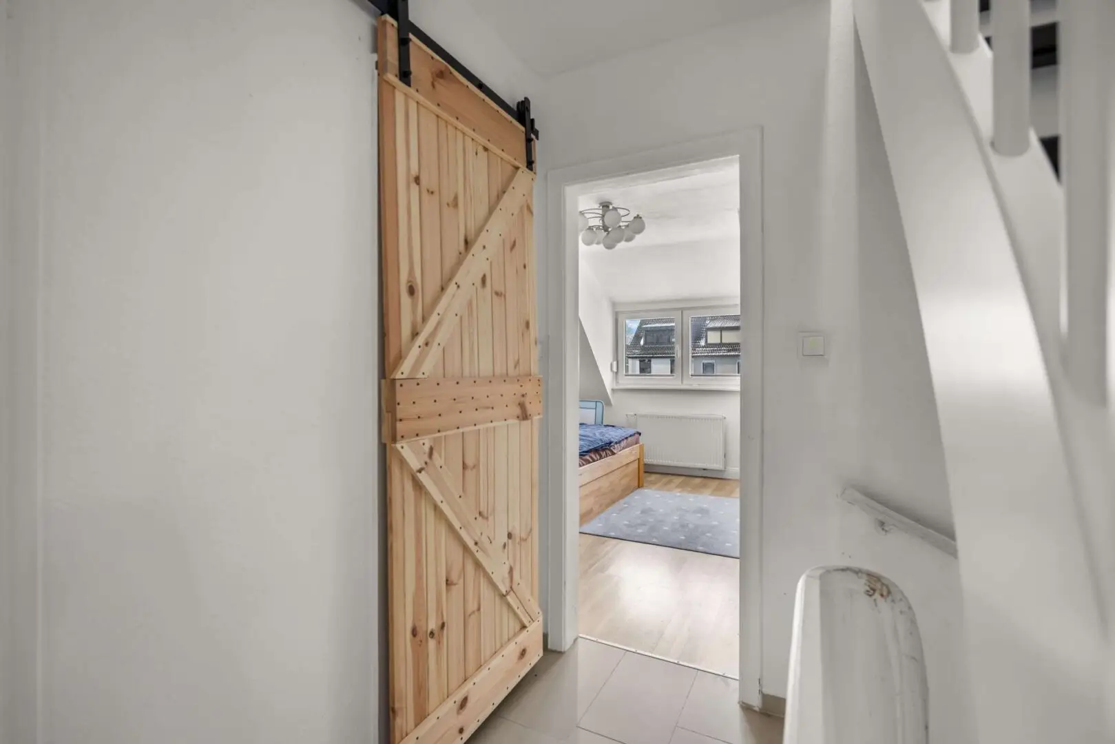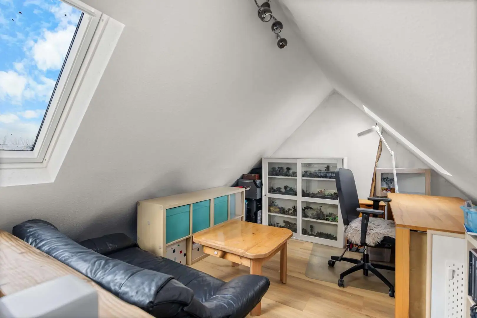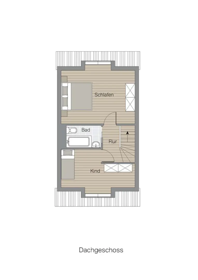 Nach oben führt der Weg ins Dachgeschoss, wo das ruhige Schlafzimmer liegt. Das zweite Zimmer eignet sich ideal als Arbeitszimmer, Hobbyraum oder einfach als Rückzugsort. Besonders angenehm für Paare: Je ein Bad im Erdgeschoss und im Dachgeschoss, sodass morgens niemand warten muss. Ganz oben schafft der ausgebaute Spitzboden eine weitere Ebene für konzentriertes Arbeiten oder ruhige Stunden.