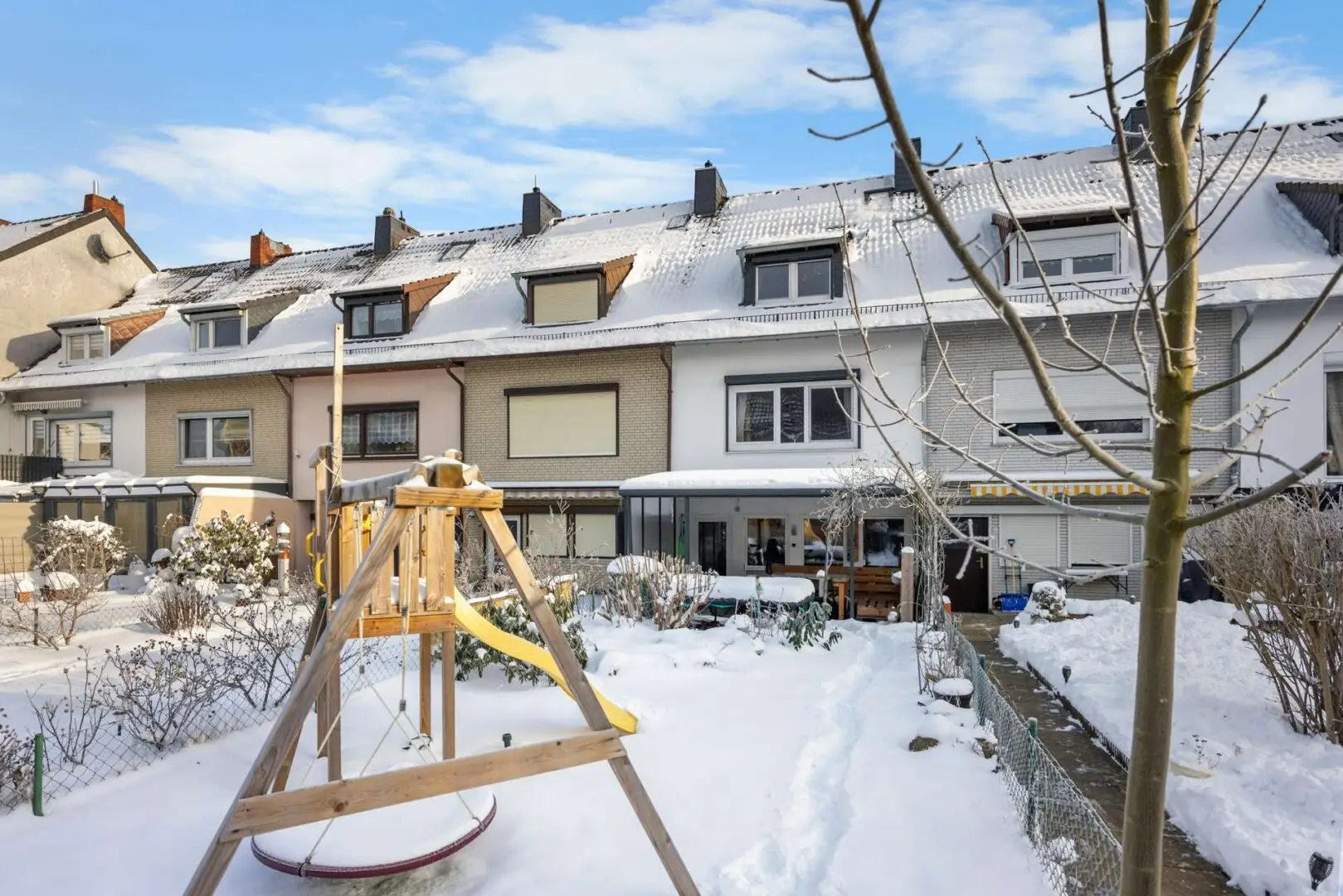 Der Garten ist überschaubar und damit angenehm pflegeleicht. Die überdachte, nach Westen ausgerichtete Terrasse ist direkt von der Küche aus erreichbar und macht es leicht, den Tag im Freien zu beginnen oder am Abend gemütlich ausklingen zu lassen. Ein kleiner Geräteschuppen hält Gartenutensilien griffbereit, ohne Platz im Haus zu beanspruchen.