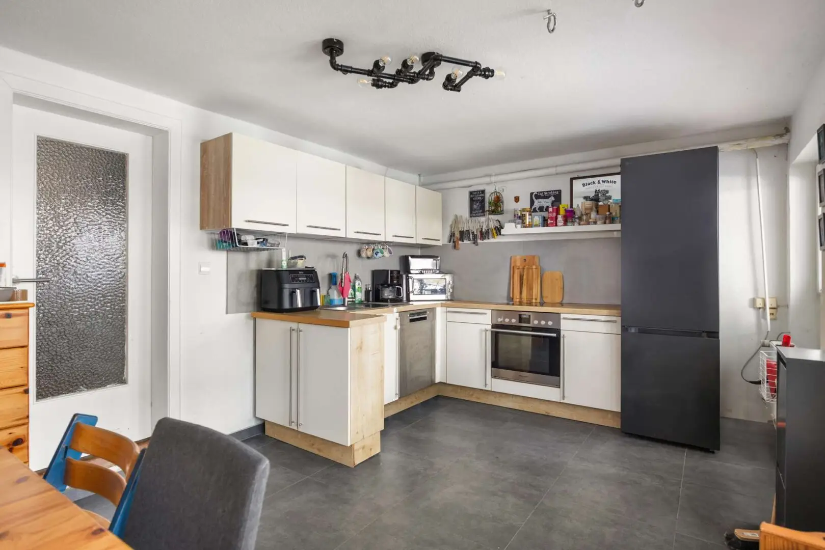 Im Erdgeschoss empfängt Sie ein Wohnbereich, der durch das breite Fenster viel Tageslicht bekommt. Der Kaminofen bringt an kühlen Abenden eine angenehme Wärme ins Haus. Die Küche liegt im Souterrain – eine Lösung, die im Alltag überraschend gut funktioniert: Kochgerüche bleiben unten, der Wohnbereich oben bleibt ungestört. Die großzügige Fläche bietet Platz für gemeinsames Kochen, und von hier gelangen Sie direkt auf die überdachte Terrasse.
