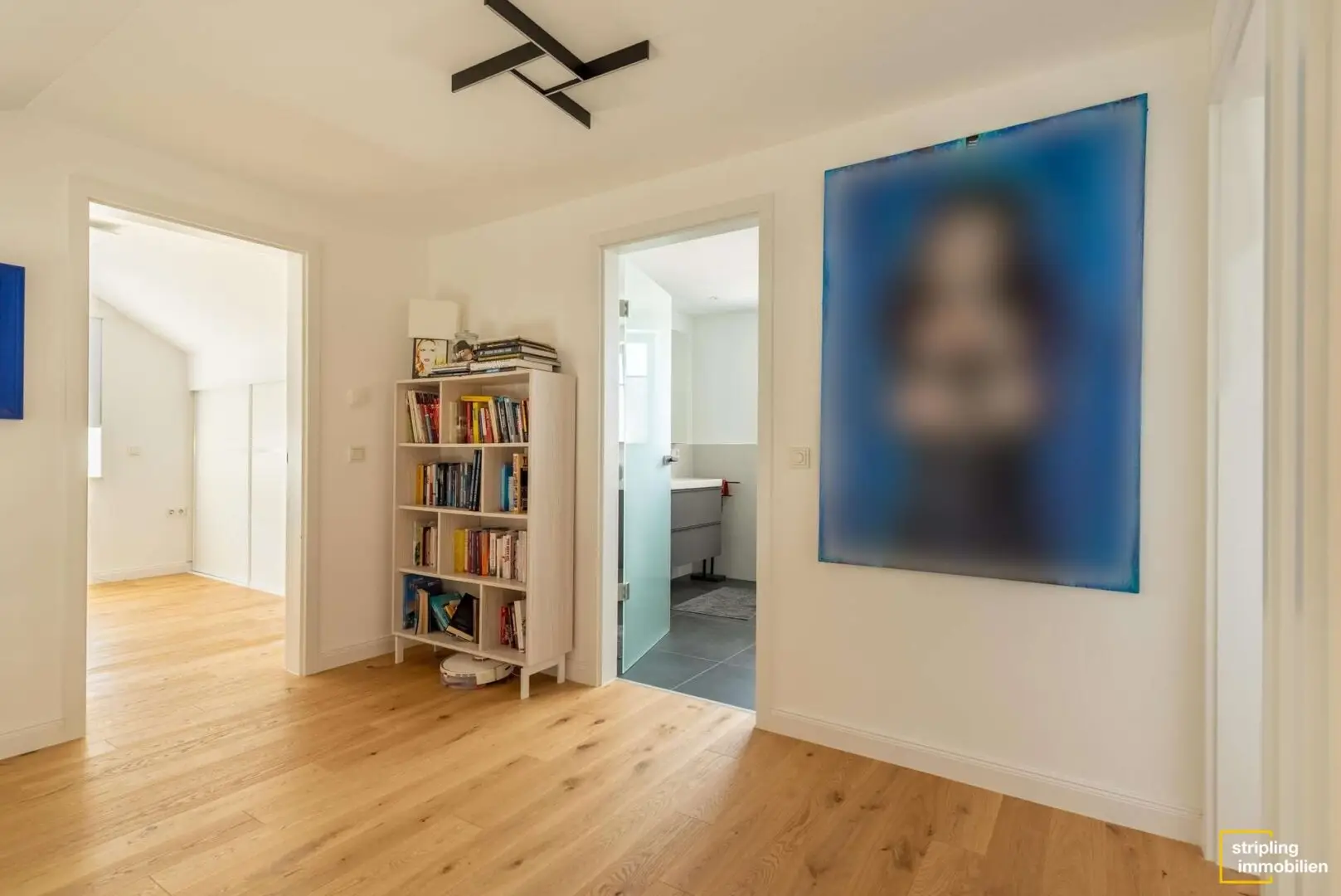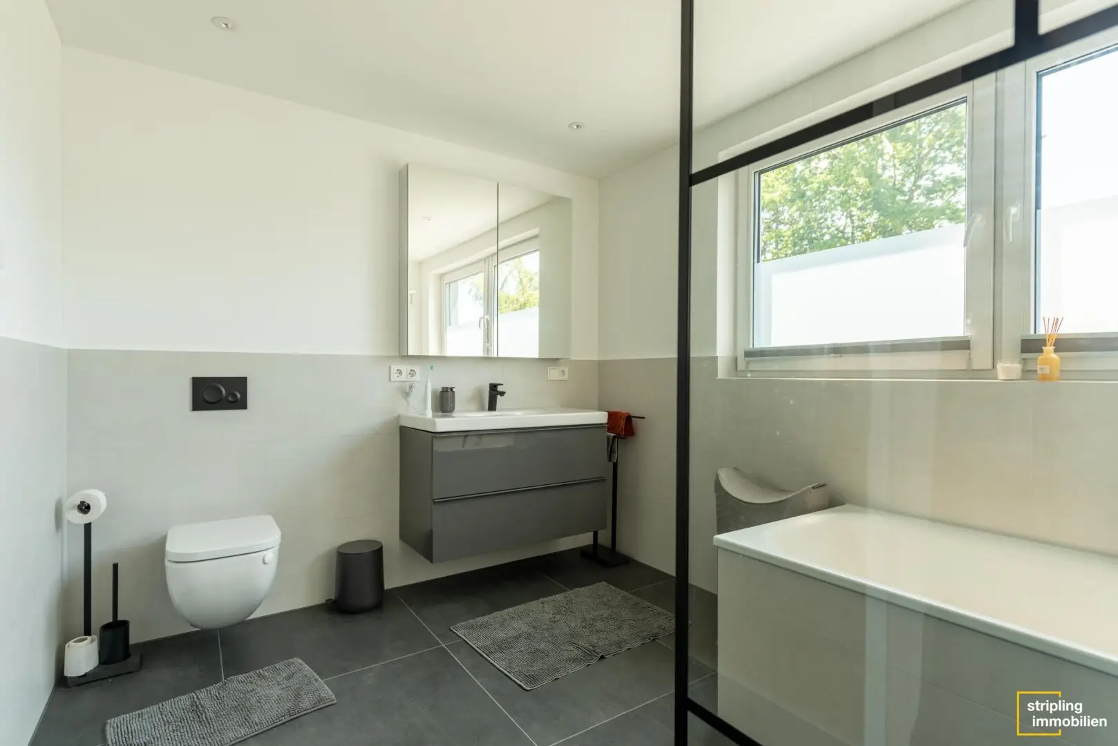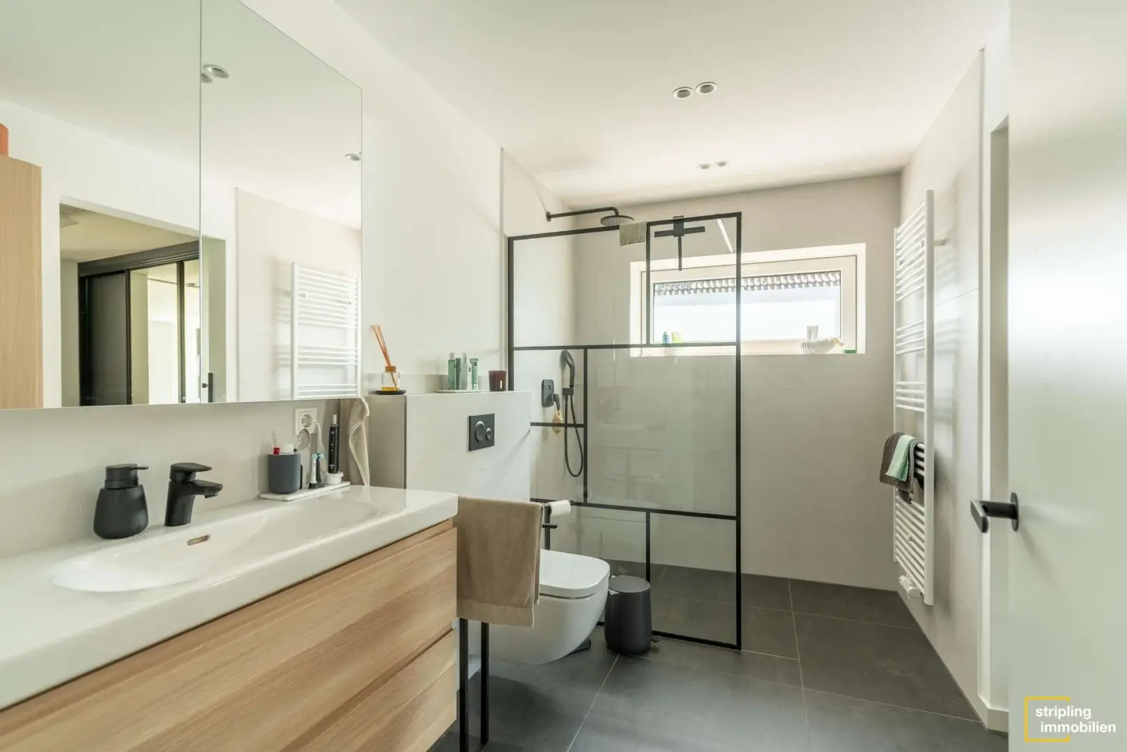 Rechts neben der Diele befindet sich ein modernes Gäste-WC. Daneben liegen ein hochwertig ausgestattetes Badezimmer mit ebenerdiger Dusche und ein etwa 19,38 m² großes Zimmer, das zum Beispiel als Arbeitszimmer oder Gästezimmer genutzt werden kann. Baulich wäre es auch möglich, eine Einliegerwohnung mit separatem Zugang aus diesen beiden Räumen zu erschaffen. Alle drei Badezimmer in diesem Haus erstrahlen im Übrigen im gleichen Stil – modern, hochwertig und in Grau, Schwarz und Weiß gehalten, sodass Sie nach Lust und Laune Farbakzente durch Ihre Dekoration setzen können.