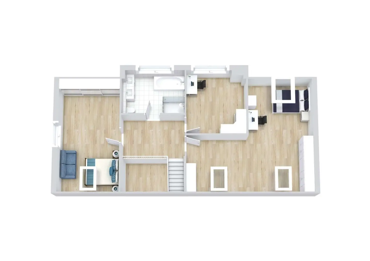 Im Dachgeschoss befindet sich ebenfalls ein Badezimmer. Dieses ist zusätzlich zur ebenerdigen Dusche mit einer Badewanne ausgestattet – traumhaft für kalte Wintertage. Zusätzlich finden Sie hier drei weitere Zimmer mit etwa 17,13 m², 12,77 m² und 26,71 m², die je nach Bedarf als Kinderzimmer, Schlafzimmer, Arbeits- oder Hobbyzimmer genutzt werden können. Ein absolutes Highlight im Dachgeschoss sind die Einbauschränke, die den Platz unter den Dachschrägen perfekt ausnutzen.
