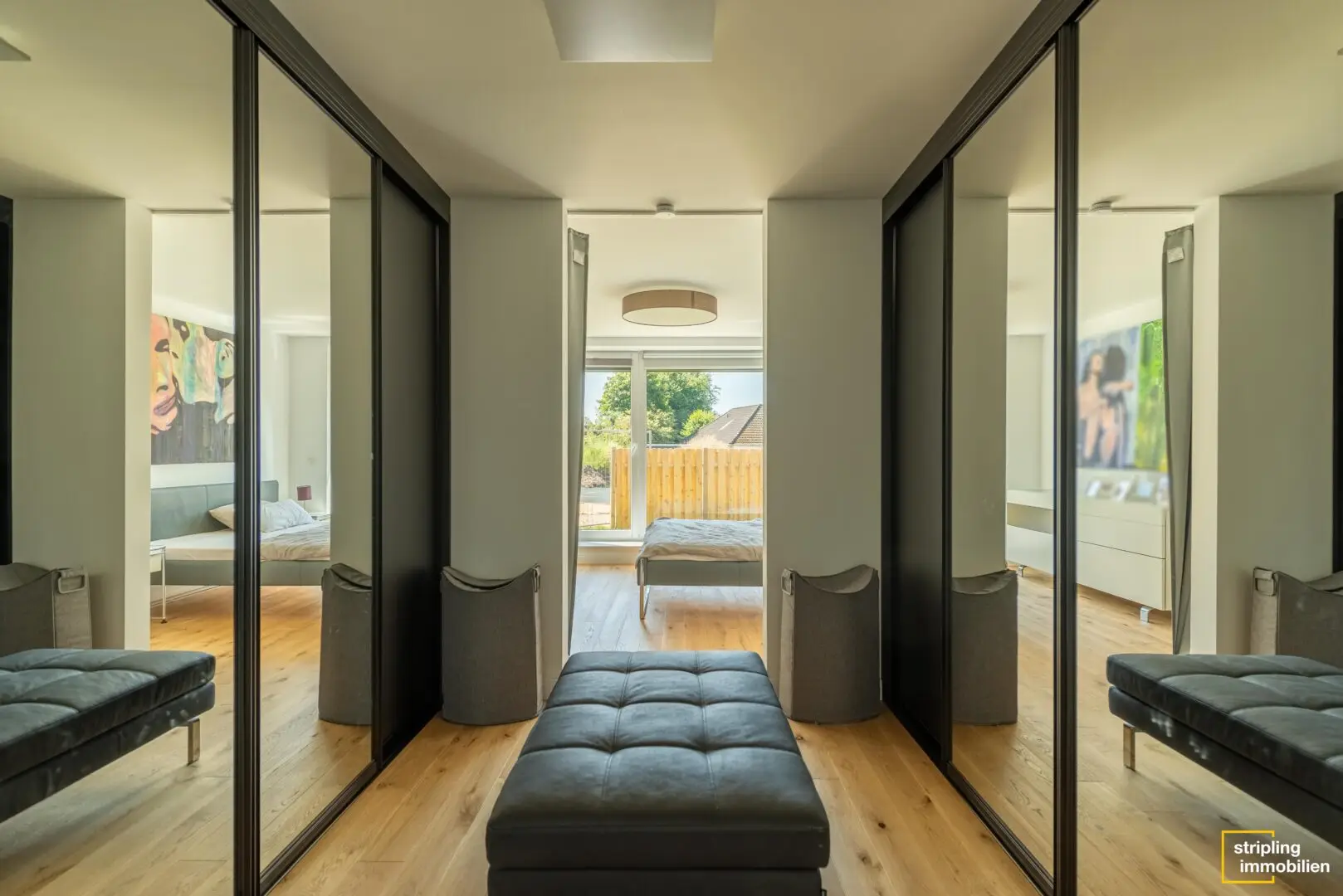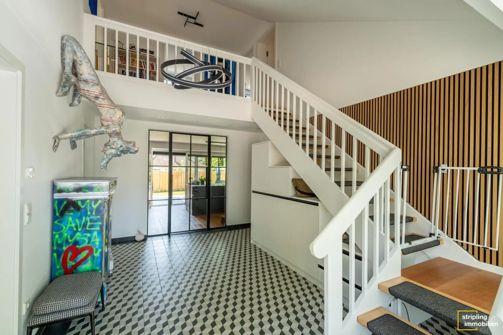 Doch Technik allein ist nicht alles; die Wohnqualität hängt ebenso von der Architektur und der Ausstattung ab. Auch in diesen Kategorien überzeugt das Haus. Wenn Sie durch die Eingangstür eintreten, befinden Sie sich in einer geräumigen Diele, die eine überwältigende Wirkung hat. Sie ist nämlich nach oben offen gebaut, sodass Sie Ihren Blick bis ins Obergeschoss schweifen lassen können. In der Diele dominiert der Kontrast von Schwarz und Weiß. Die hochwertigen Fliesen haben einen optischen Effekt, der sich je nach Betrachtungswinkel verändert. Außerdem bietet die Diele komfortablen Platz für Garderobe und Schränke. Eine offene Holztreppe in Weiß führt ins Obergeschoss. Dank einer breiten Glastür können Sie von der Diele durch das Wohnzimmer hindurch bis in den Garten schauen – eine beeindruckende Weite.