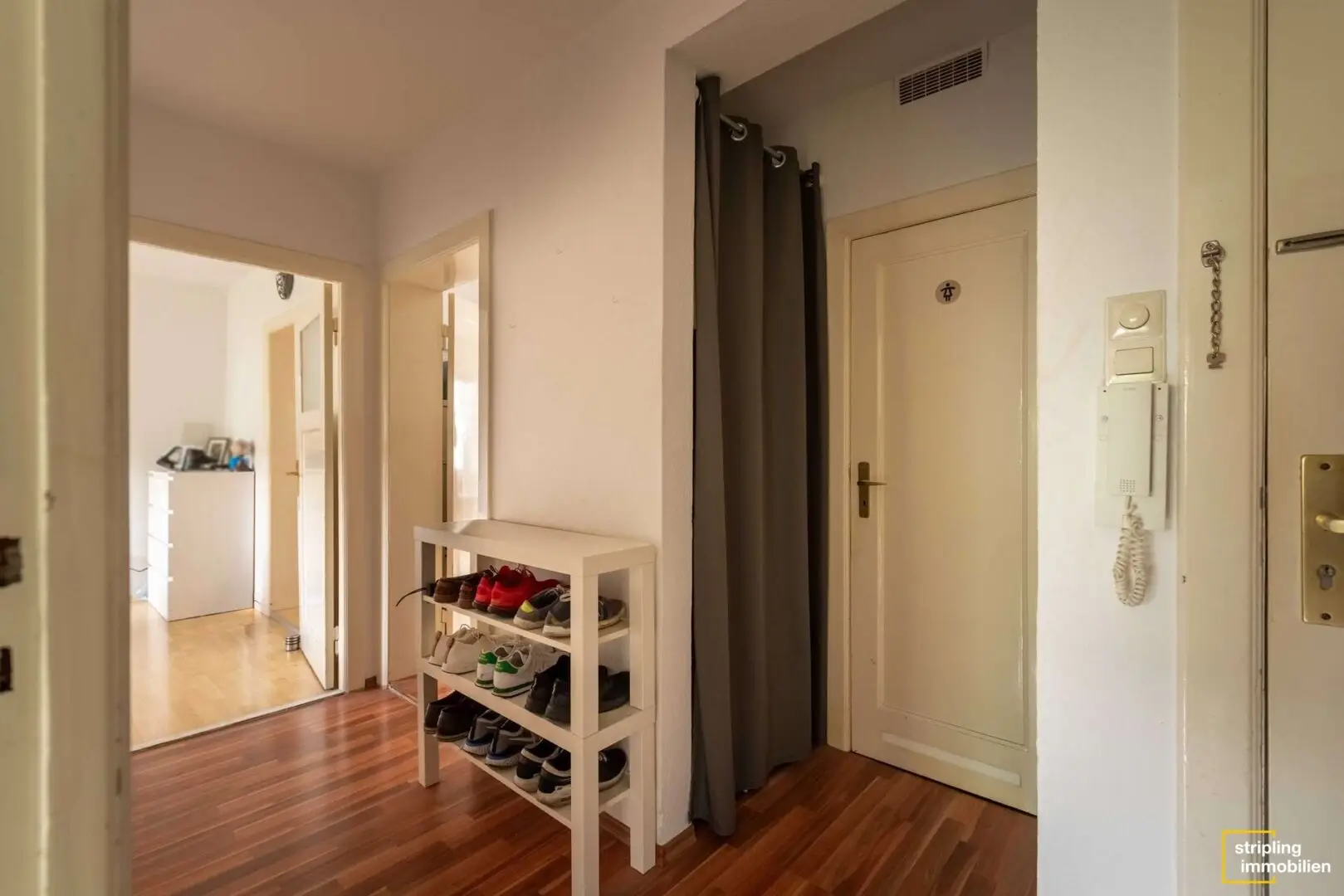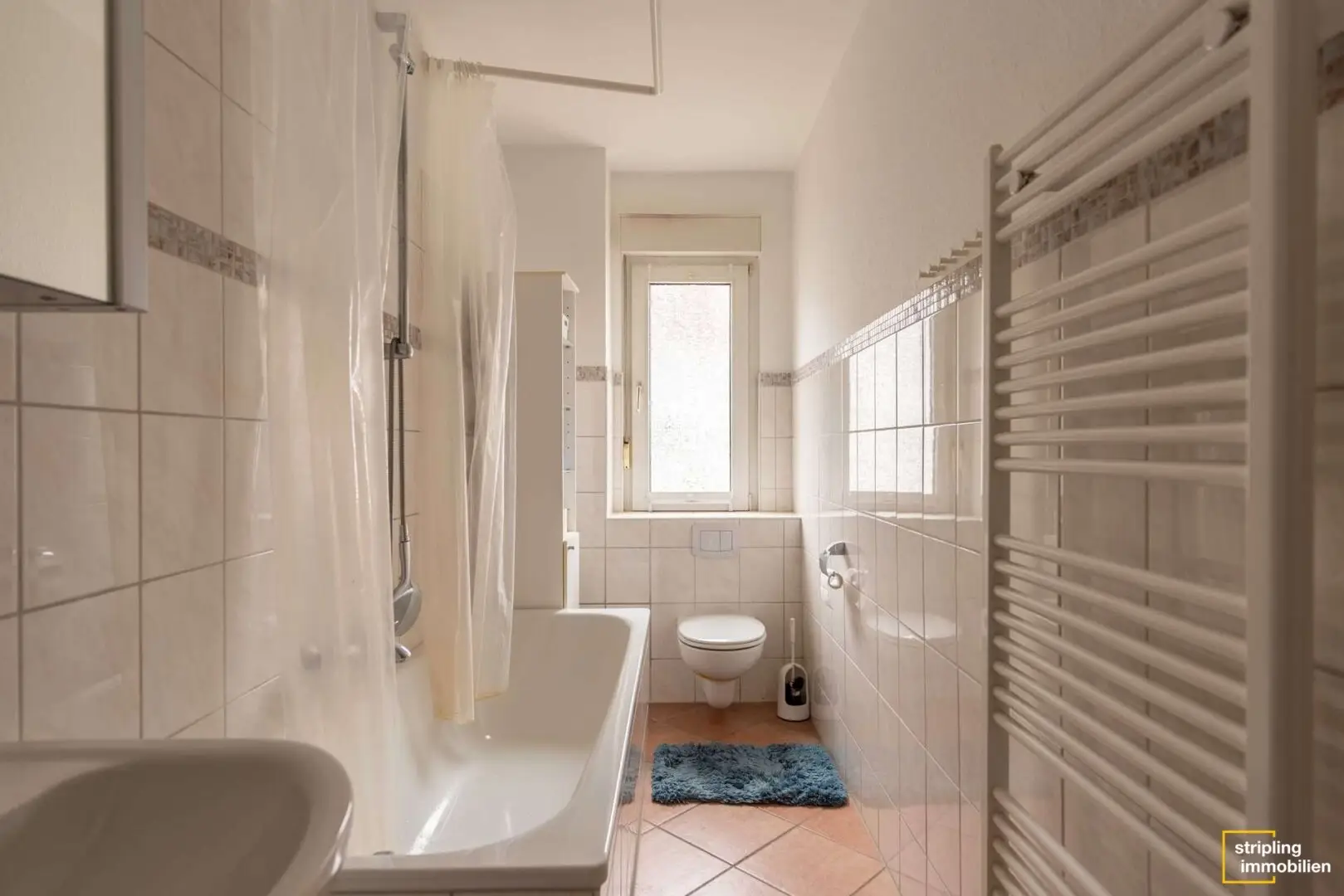 Die 2,5 Zimmer-Wohnung ist sehr vorteilhaft geschnitten. Der Flur ist ausreichend breit, sodass eine Schuhbank und eine Garderobe aufgestellt werden können. Eine kleine Nische bietet zusätzlichen Stauraum. Rechts neben der Eingangstür befindet sich das Badezimmer. Es hat eine Größe von etwa 4,76 m² und ist länglich geschnitten. Es gibt aber Platz für einen Schrank, in dem die wichtigsten Kosmetika und Utensilien verstaut werden können. Außerdem gibt es einen Handtuchheizkörper. Das Fenster sorgt für eine optimale Belüftungsmöglichkeit.