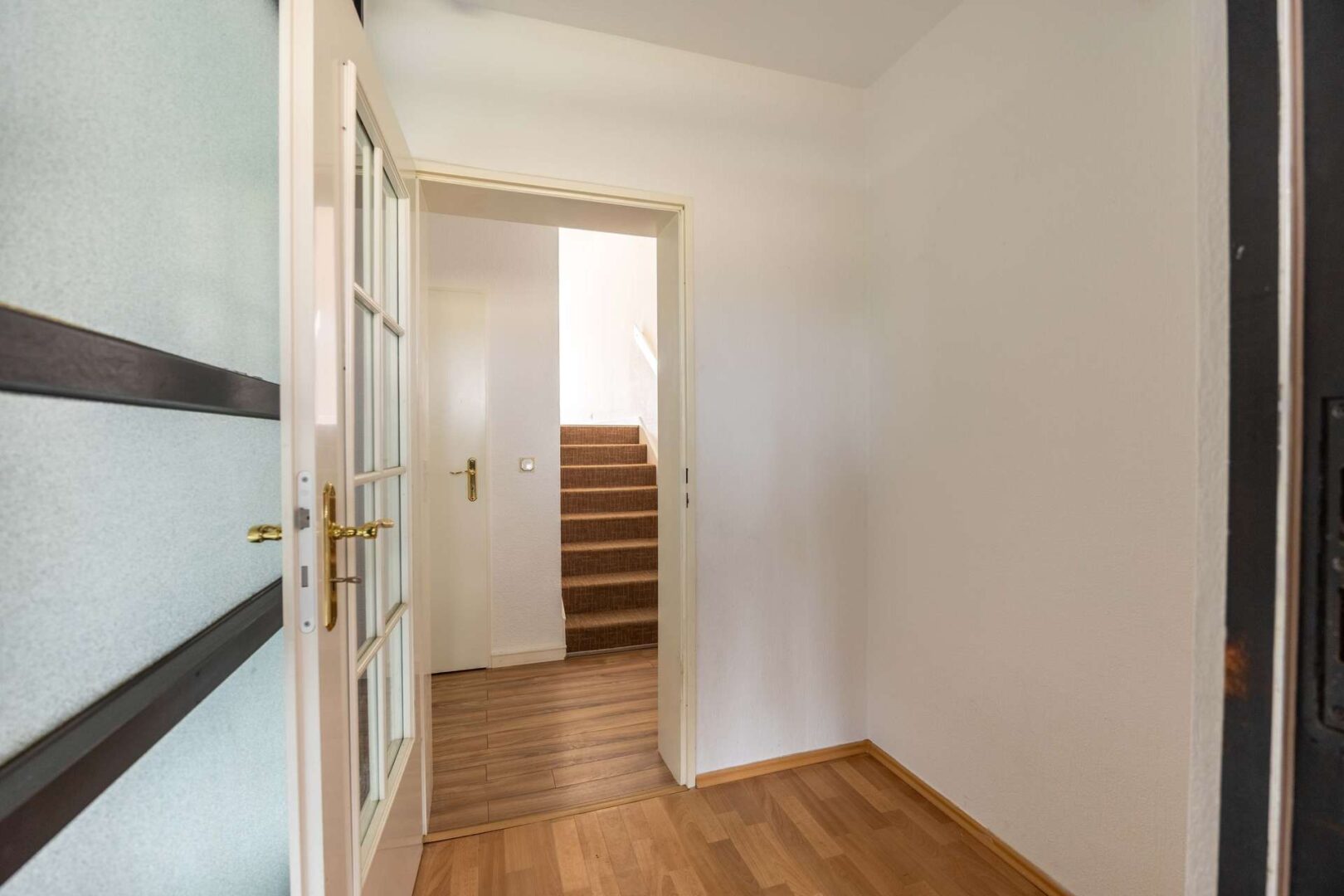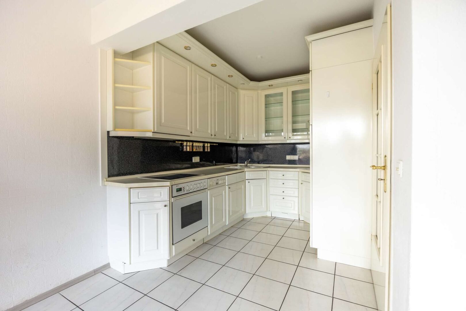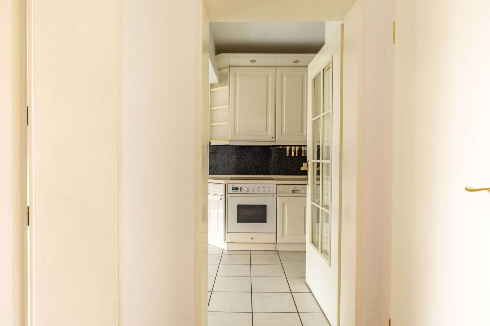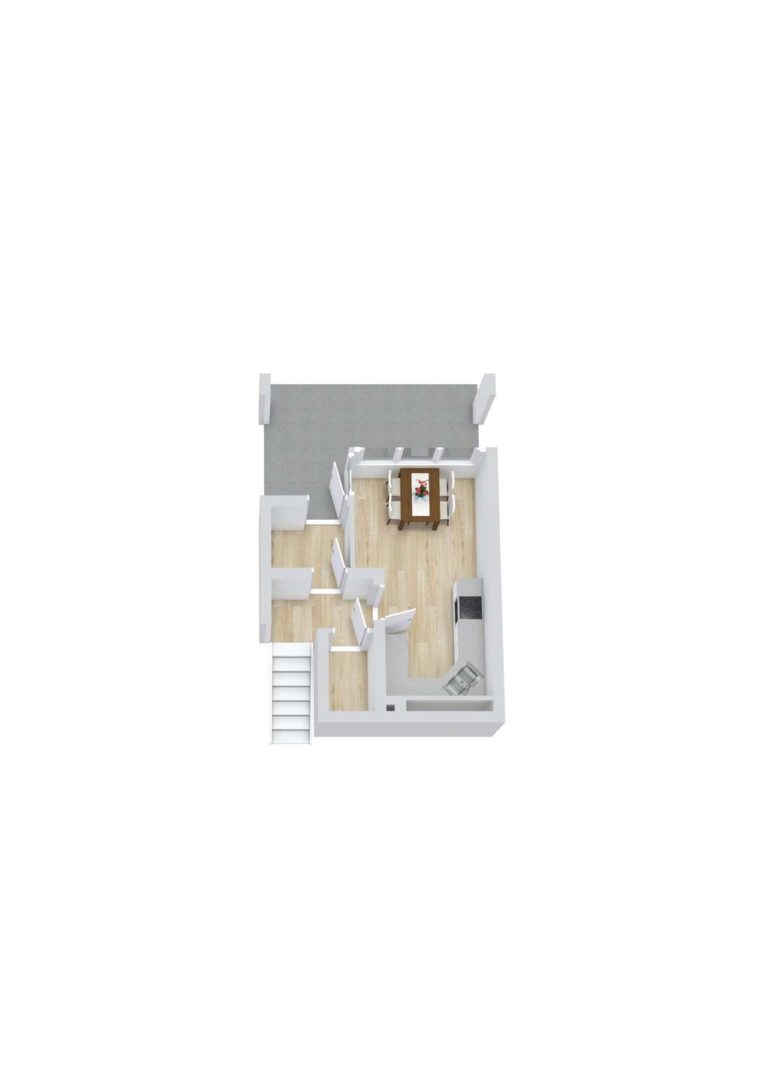 Der Eingangsbereich ist komplett überdacht, das ist vor allem in den Herbst- und Wintermonaten sehr komfortabel. Die Eingangstür zur Wohnung befindet sich auf der untersten der drei Ebenen. Sie gelangen zunächst in einen kleinen Windfang. Anschließend befindet sich ein etwa 3,10 m² großer Flur, von dem eine Treppe mit lediglich acht Stufen ins Erdgeschoss führt. Der Hauptraum auf der unteren Ebene ist die etwa 15,08 m² große Küche. Sie ist mit einer weißen Einbauküche ausgestattet, die den zur Verfügung stehenden Platz perfekt ausnutzt. Im vorderen Bereich ist zudem ausreichend Fläche vorhanden, um einen Essbereich einzurichten. Dank großer bodentiefer Fenster ist er sehr hell und freundlich. Neben der Küche gibt es einen kleinen Abstellraum, der zum Beispiel ideal geeignet ist, um Vorräte griffbereit zu lagern.