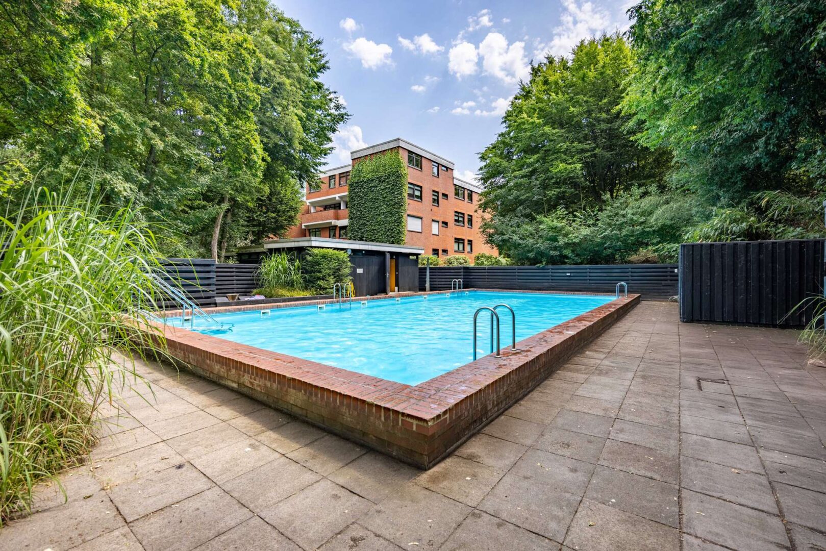 Die Wohnung ist Teil einer gepflegten Wohnanlage mit separaten Eingängen für 46 Wohneinheiten. Luxuriöses Highlight der Anlage: Es gibt einen gemeinschaftlichen Außenpool mit Saunabereich und einen eigenen Spielplatz.