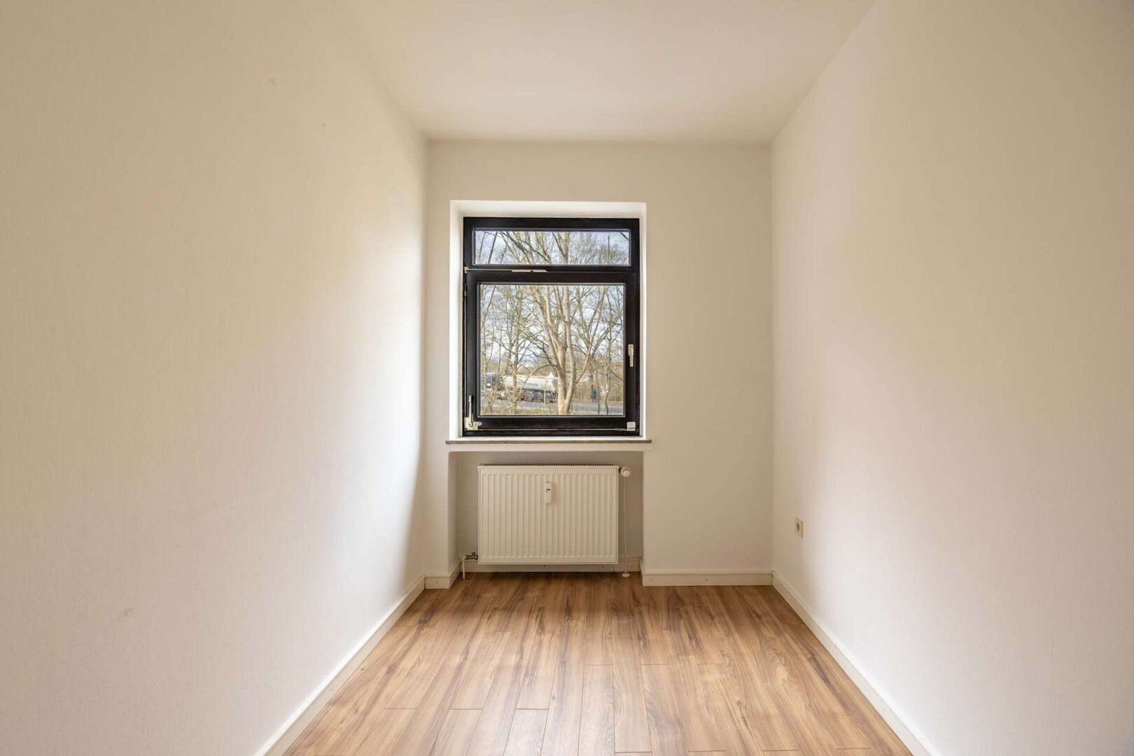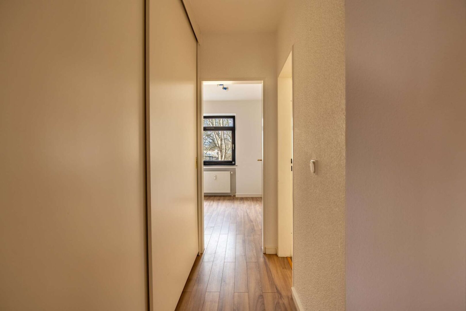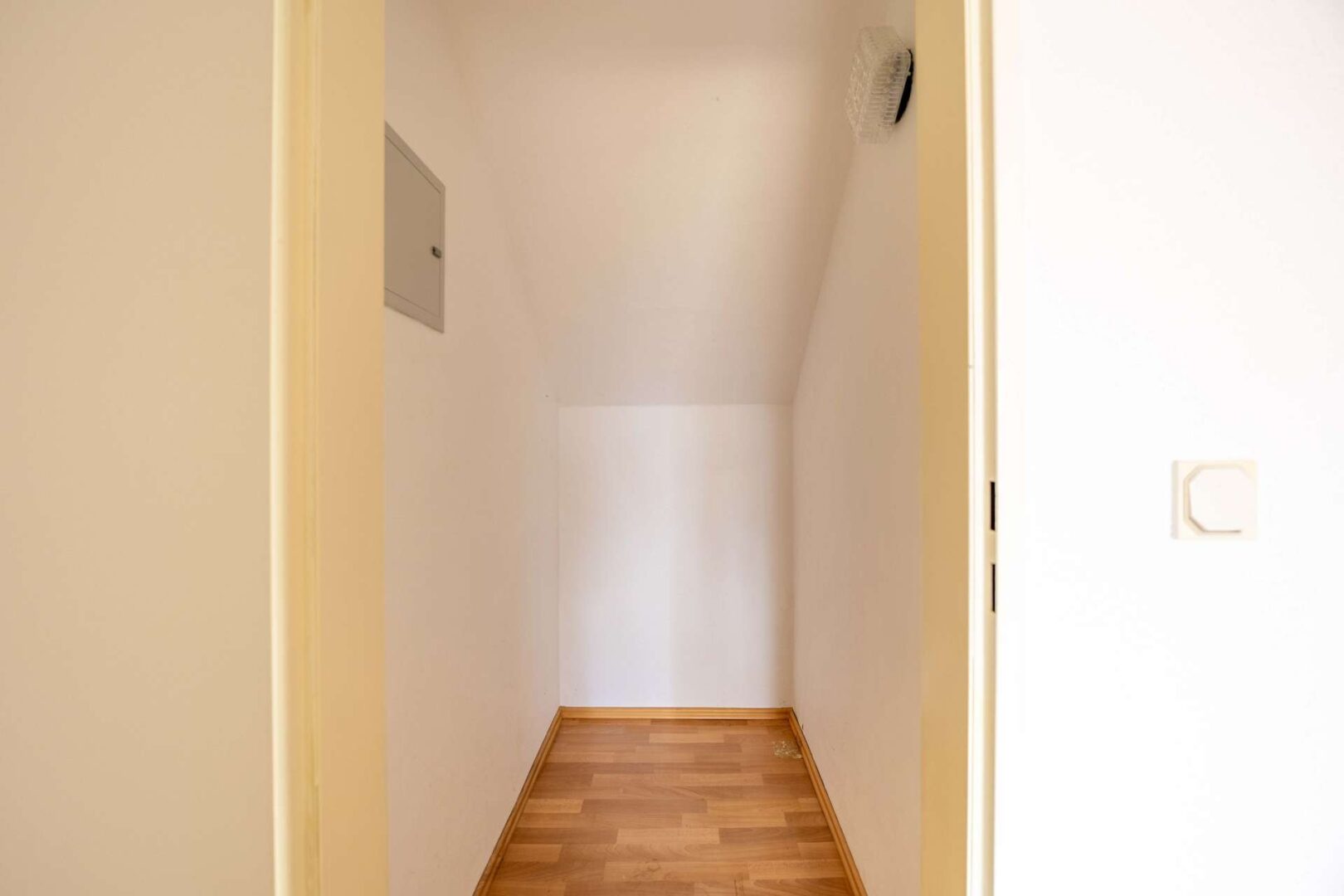 Auf der dritten Ebene sind das innen liegende Badezimmer sowie zwei Schlafzimmer zu finden. Das Badezimmer ist weiß gefliest und mit einer Badewanne, einer Dusche sowie Waschbecken und WC ausgestattet. Hier können Sie sich eine kleine Wohlfühloase einrichten. Das Schlafzimmer hat eine Wohnfläche von etwa 13,85 m², sodass Bett, Kleiderschrank und Kommoden bequem platziert werden können. Das zweite Zimmer ist mit einer Wohnfläche von circa 7,07 m² etwas kleiner und eignet sich zum Beispiel als Arbeits- oder Gästezimmer.