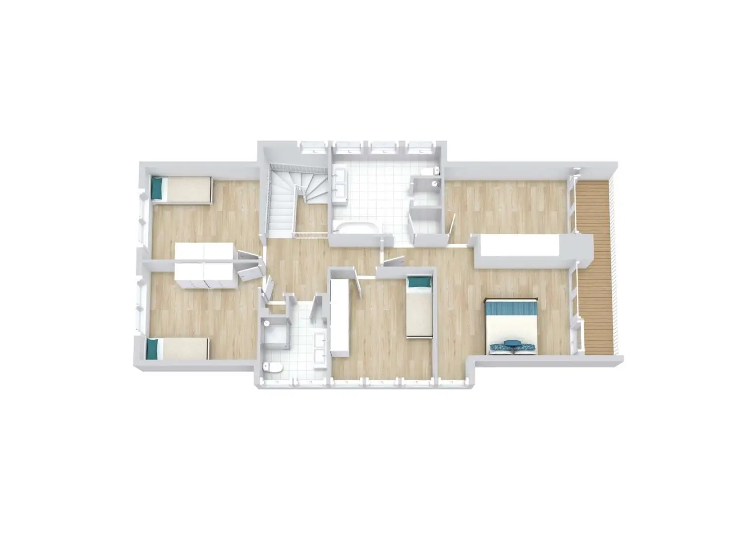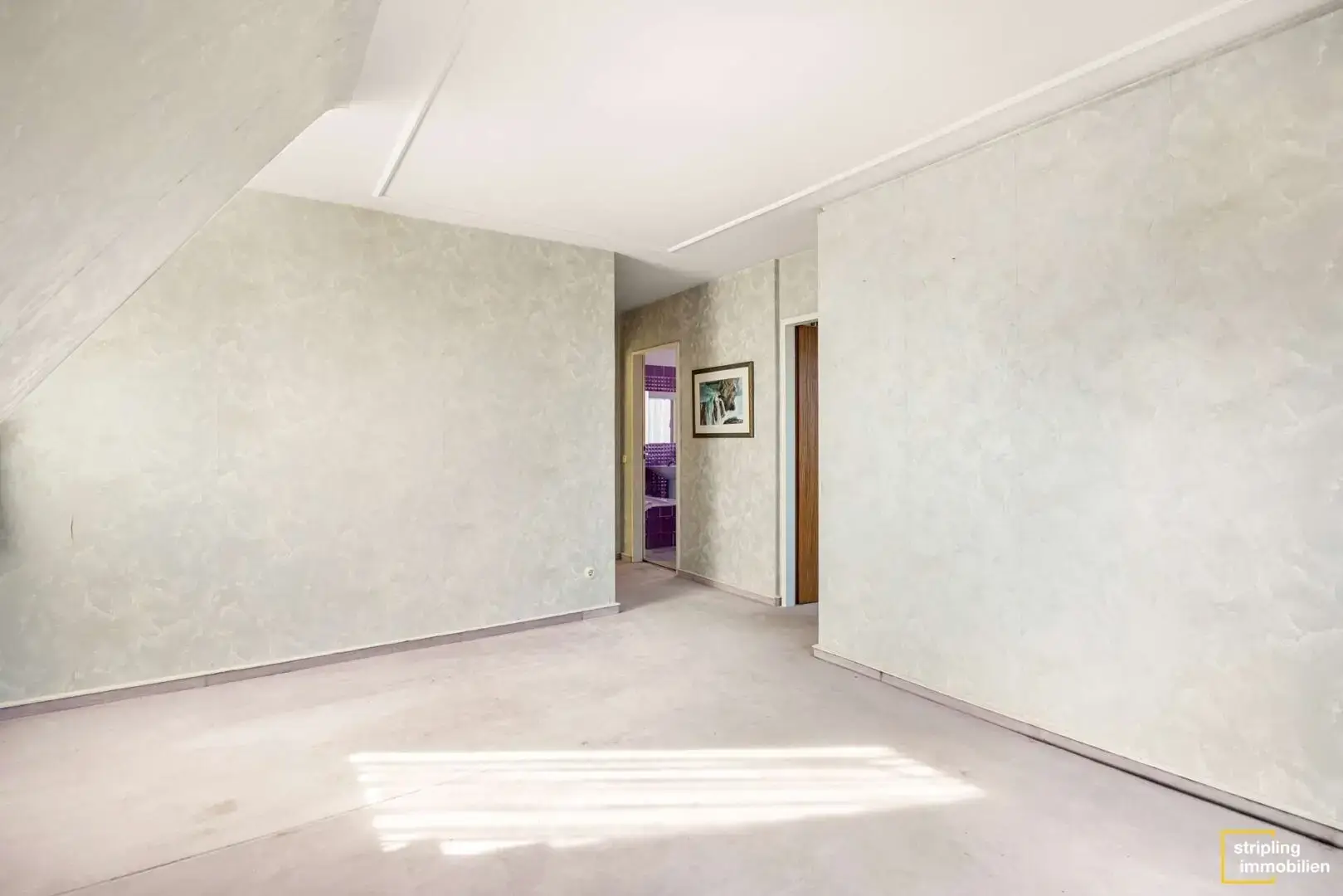 Im Obergeschoss befinden sich ein Schlafzimmer mit Ankleidebereich und Badezimmer en-Suite sowie drei weitere Zimmer, die als Schlafzimmer, Kinderzimmer, Arbeits- oder Gästezimmer genutzt werden können. Außerdem gibt es ein weiteres Badezimmer mit Badewanne, Dusche und Fenster. Das Highlight des Obergeschosses ist das Schlafzimmer. Es hat eine Wohnfläche von etwa 17,68 m² und bietet dank Ankleidebereich und Badezimmer en-suite alle Annehmlichkeiten, die man sich nach dem Aufstehen wünscht. Außerdem grenzt eine Loggia an das Schlafzimmer, sodass Sie auch frische Luft und einen Ausblick in die Natur nach dem Aufstehen genießen können. Ein herrlicher Gedanke, oder?