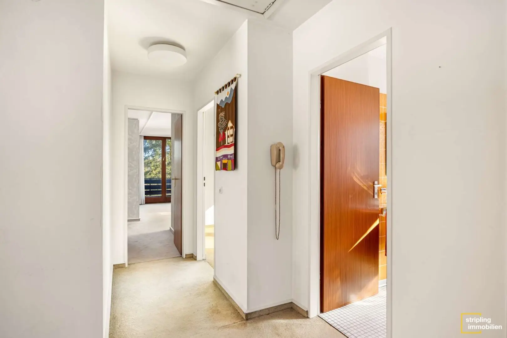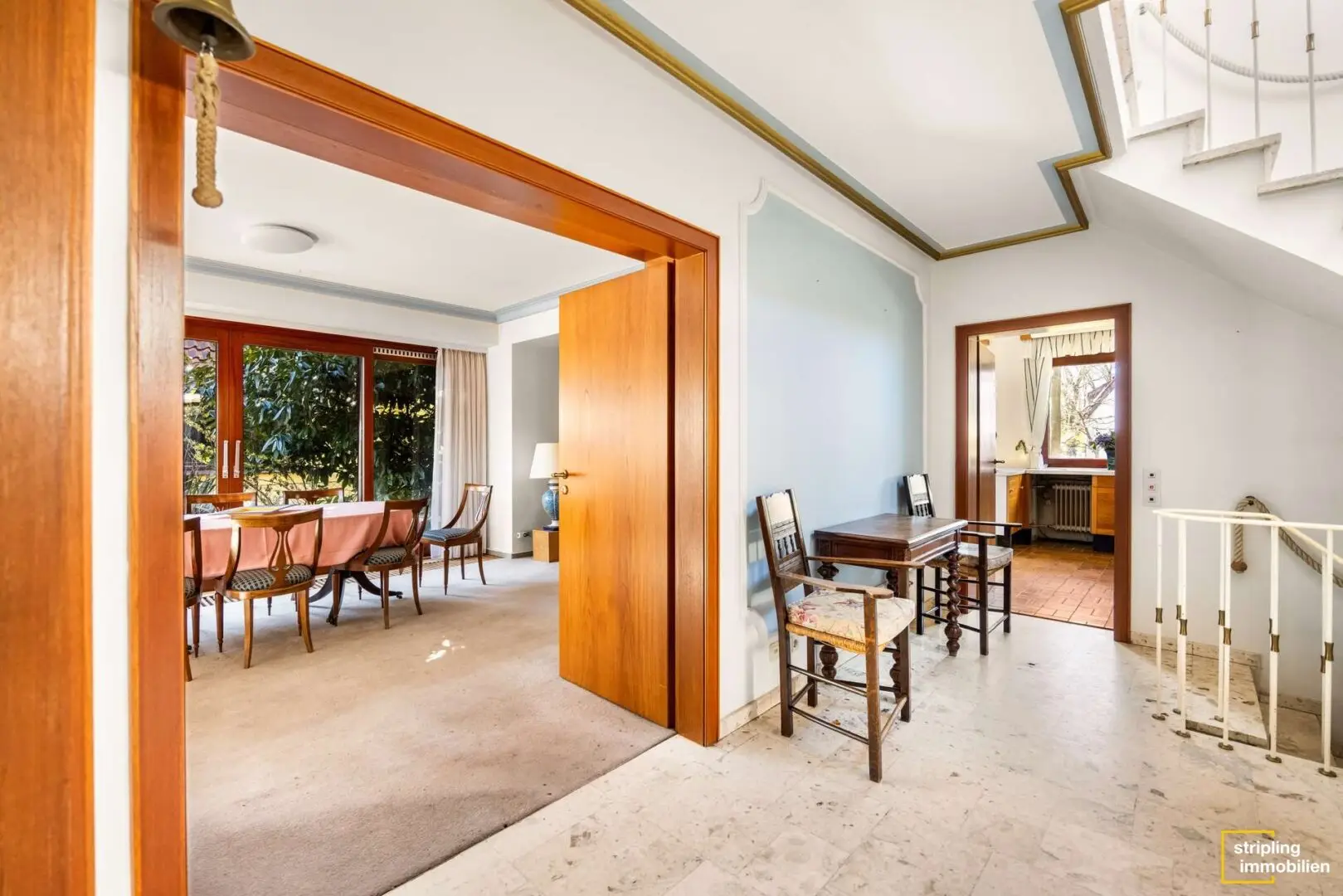 Wenn Sie das Grundstück betreten, gelangen Sie geradeaus direkt zur Garage. Rechts daneben befindet sich der Hauseingang. Sobald Sie das Haus betreten, gelangen Sie in eine geräumige Diele mit halb offener Decke und separatem Garderobenbereich. Sie hat eine Wohnfläche von etwa 15,80 m², wird von Tageslicht durchflutet und bietet verschiedenste Einrichtungsmöglichkeiten. Können Sie vor Ihrem inneren Auge sehen, wie Sie dort Ihre Gäste empfangen? Ein perfekter erster Eindruck. Linker Hand befindet sich ein kleines Gäste-WC, das ebenso wie die beiden Badezimmer des Hauses gepflegt, aber renovierungsbedürftig ist, da die Fliesen und die sanitären Anlagen ein wenig in die Jahre gekommen sind. Rechter Hand führt eine Treppe in den Keller und ins Obergeschoss.