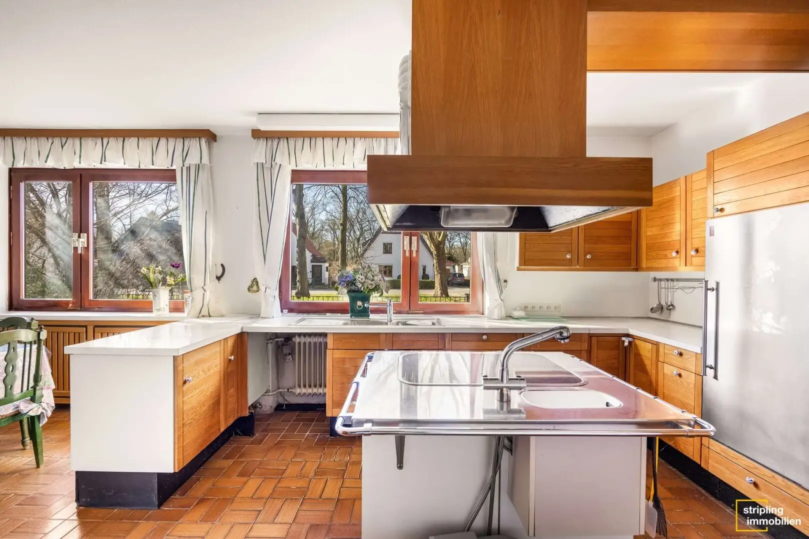 Bei den weiteren Räumen im Erdgeschoss handelt es sich um eine Küche mit angrenzendem Abstellraum und ein L-förmig geschnittenes Wohnzimmer mit Wohn- und Essbereich sowie einer gemütlichen Kaminecke. Die Küche ist mit einer Wohnfläche von etwa 20,73 m² so geräumig, dass sie Platz für eine Einbauküche mit Kochinsel sowie einen separaten Essbereich bietet. Besonders komfortabel ist der angrenzende Hauswirtschaftsraum, so haben Sie alle Vorräte in unmittelbarer Nähe griffbereit. Einbauschränke bieten in der Küche zusätzlichen Stauraum.