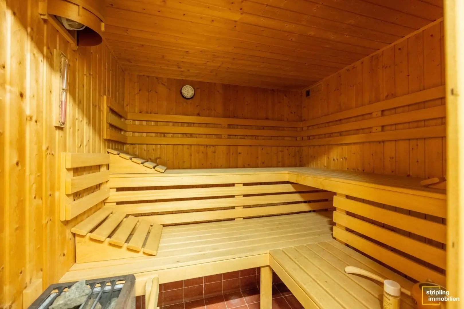 Kommen wir nun zum Keller des Hauses. Es handelt sich um einen Vollkeller. Neben den Dingen, die man in einem Keller erwartet wie einen Heizungsraum, einen Trockenraum und weitere Stellfläche ist dort ein etwa 40,84 m² großer Partyraum sowie im Flur eine Bar eingerichtet – perfekt für gesellige Abende mit Freunden und der Familie. Außerdem sind im Keller eine Sauna und eine Dusche eingebaut, die für Entspannung sorgt. Für kurze Wege gelangen Sie direkt über den Keller in die Garage.