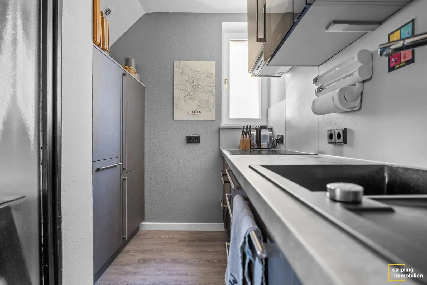 Die Küche ist im Übrigen mit einer Einbauküche aus dem Jahr 2021 ausgestattet, welche hochwertige Geräte von Miele enthält. Die Fronten der Schränke sind dunkelgrau und bilden einen harmonischen Kontrast zur Arbeitsplatte in Hellgrau und den Griffen in Edelstahl. Dank der passgenauen Planung wird der vorhandene Platz optimal ausgenutzt.