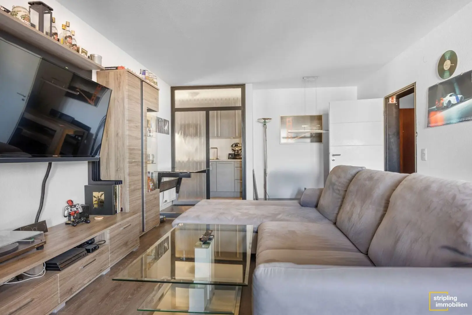 Auf der gegenüberliegenden Seite befindet sich das Wohnzimmer. Es ist mit etwa 26,51 m² Wohnfläche das größte Zimmer der Wohnung und bietet Platz für einen Wohn- und einen Essbereich. Richten Sie zum Beispiel im vorderen Bereich eine Essecke ein – dies wäre vorteilhaft, da sich die circa 4,98 m² große Küche auf der rechten Seite an das Wohnzimmer anschließt. So hätten Sie kurze Wege. Außerdem bliebe so genug Platz für eine Sofaecke auf der linken Seite des Raums, die mit einer Loggia verbunden ist. Dank der bodentiefen Fenster kann hier viel Tageslicht einfallen. Da sich an der langen Wand keine weiteren Fenster befinden, haben Sie genug Platz, um Möbel aufzustellen.