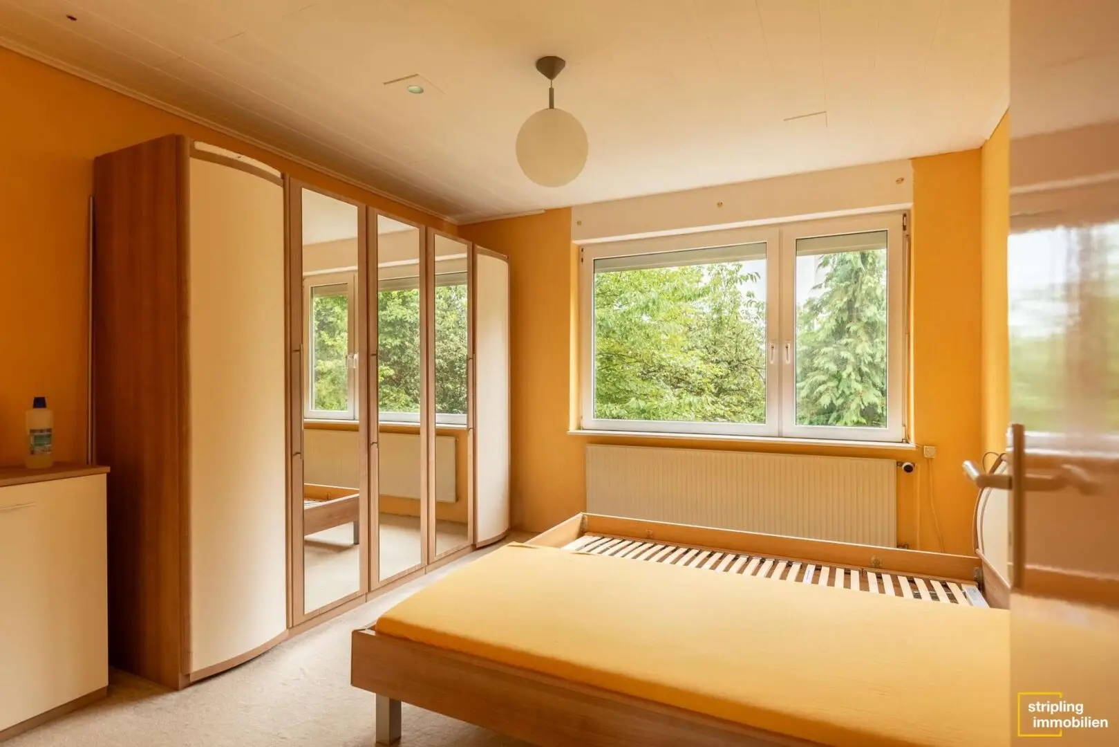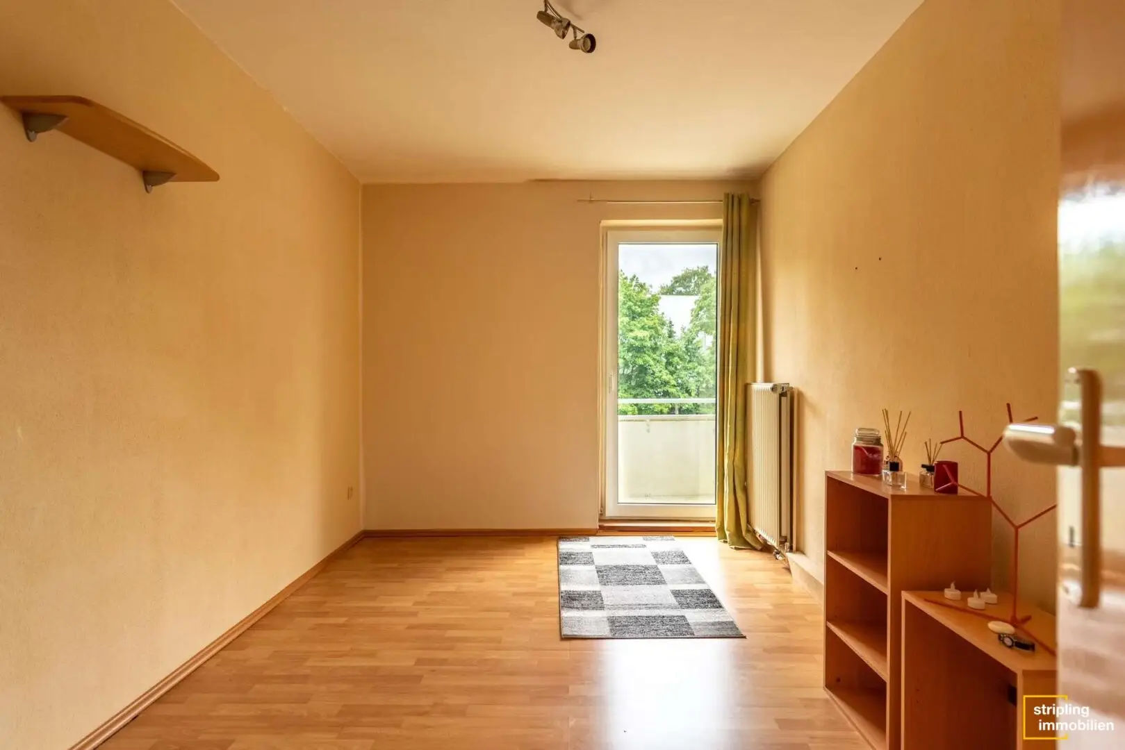 Auf der anderen Seite des Flurs befindet sich ein Schlafzimmer, das zum Beispiel als Arbeits-, Kinder- oder Gästezimmer genutzt werden kann. Das Highlight dieses Zimmers ist der Zugang zum überdachten Balkon mit Westausrichtung – dieser kann nämlich von dort und vom Wohnzimmer betreten werden. Himmel und Baumwipfel: Die Aussicht aus dem zweiten Stock spricht für sich.