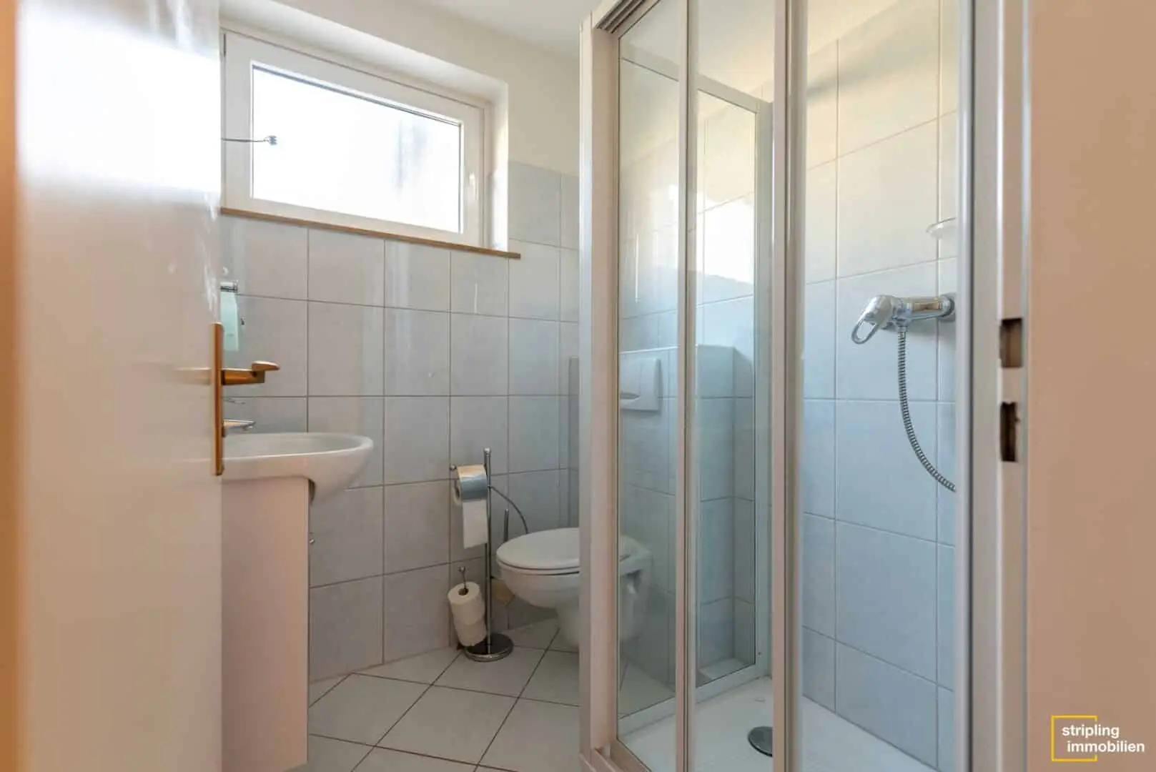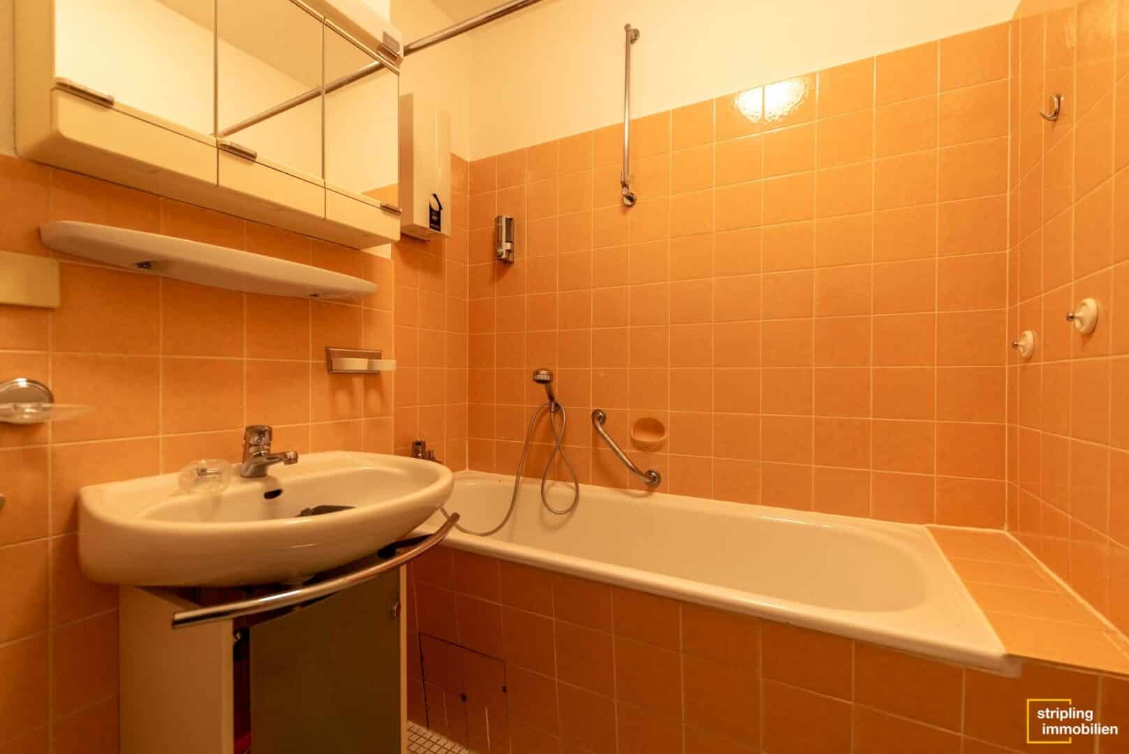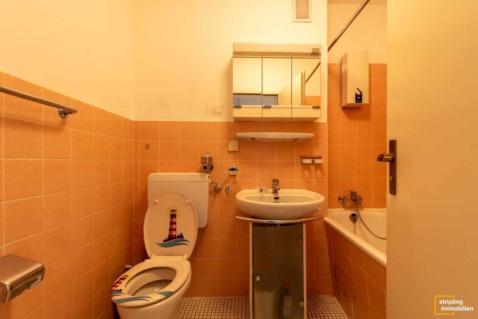 Links neben der Küche befindet sich ein knapp 10 m² großes Schlafzimmer, das zum Beispiel als Kinderzimmer, Arbeitszimmer oder Gästezimmer genutzt werden kann. Auch dies ist quadratisch geschnitten – für beste Einrichtungsmöglichkeiten. Die beiden Badezimmer – Hauptbadezimmer und modernisiertes Gäste-WC mit Dusche – befinden sich direkt nebeneinander. Gegenüber ist ein kleiner Abstellraum integriert, der Platz für Vorräte und Haushaltsgeräte bietet.