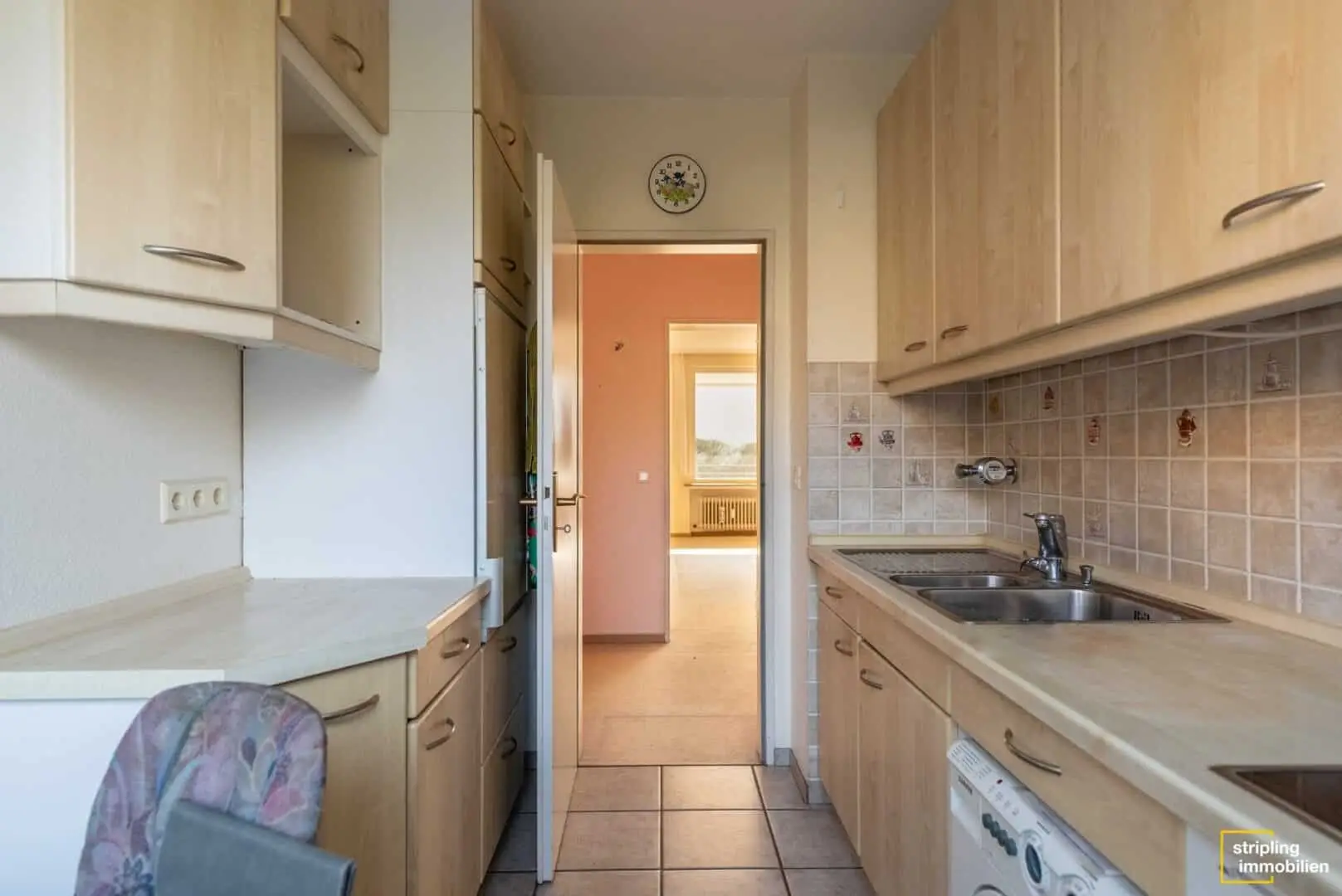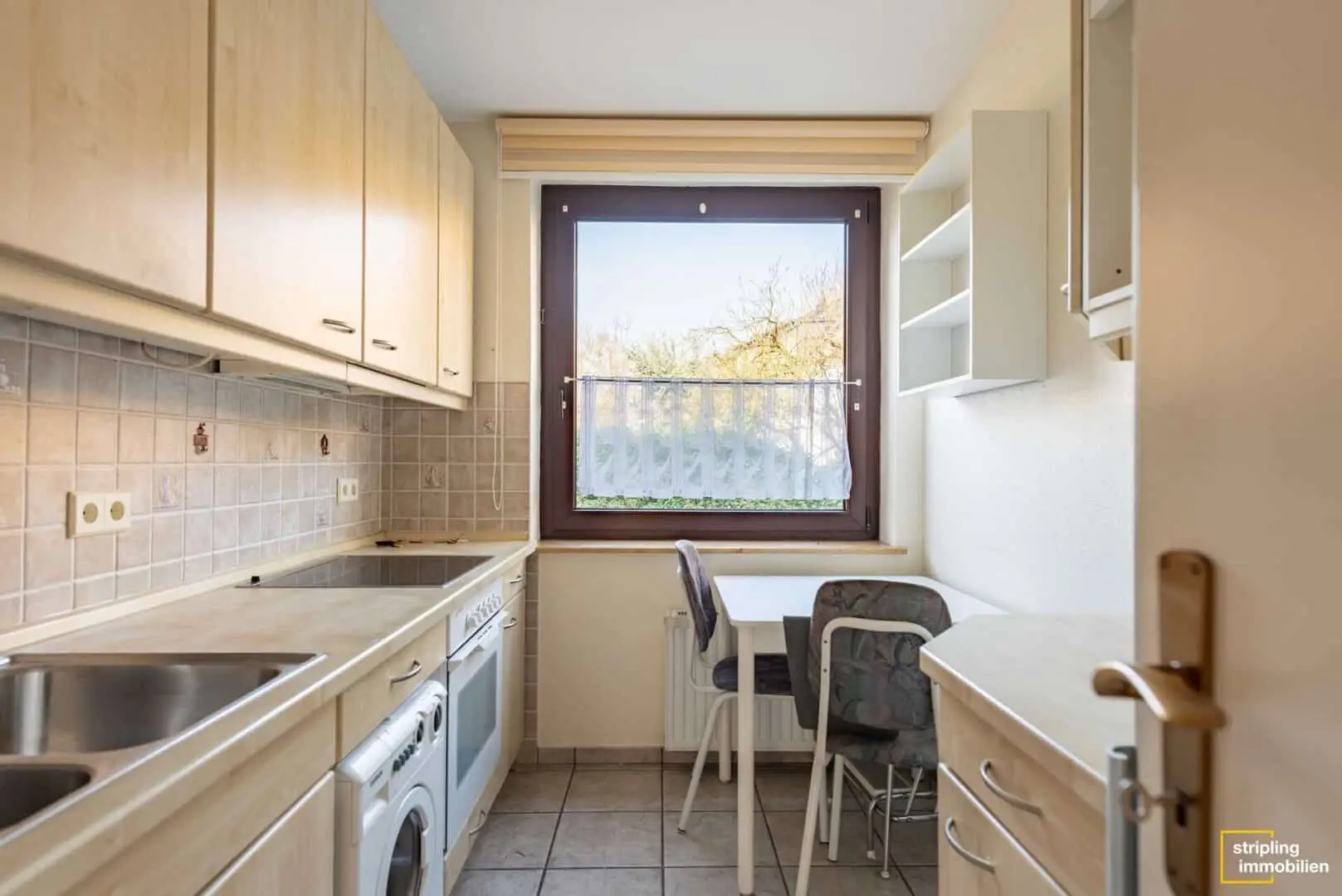 Gegenüber vom Wohnzimmer befindet sich die kleine, aber feine Küche. Sie ist etwa 6,27 m² groß und mit einer Einbauküche ausgestattet, die den vorhandenen Platz optimal nutzt. Auf der linken Seite befinden sich die Elektrogeräte sowie Schränke. Auf der rechten Seite bietet ein weiterer Schrank zusätzlichen Stauraum. Vor dem großzügigen Fenster ist ein kleiner Tisch aufgestellt - ein perfekter Platz, um den Kaffee zu genießen oder kleine Mahlzeiten zu sich zu nehmen.