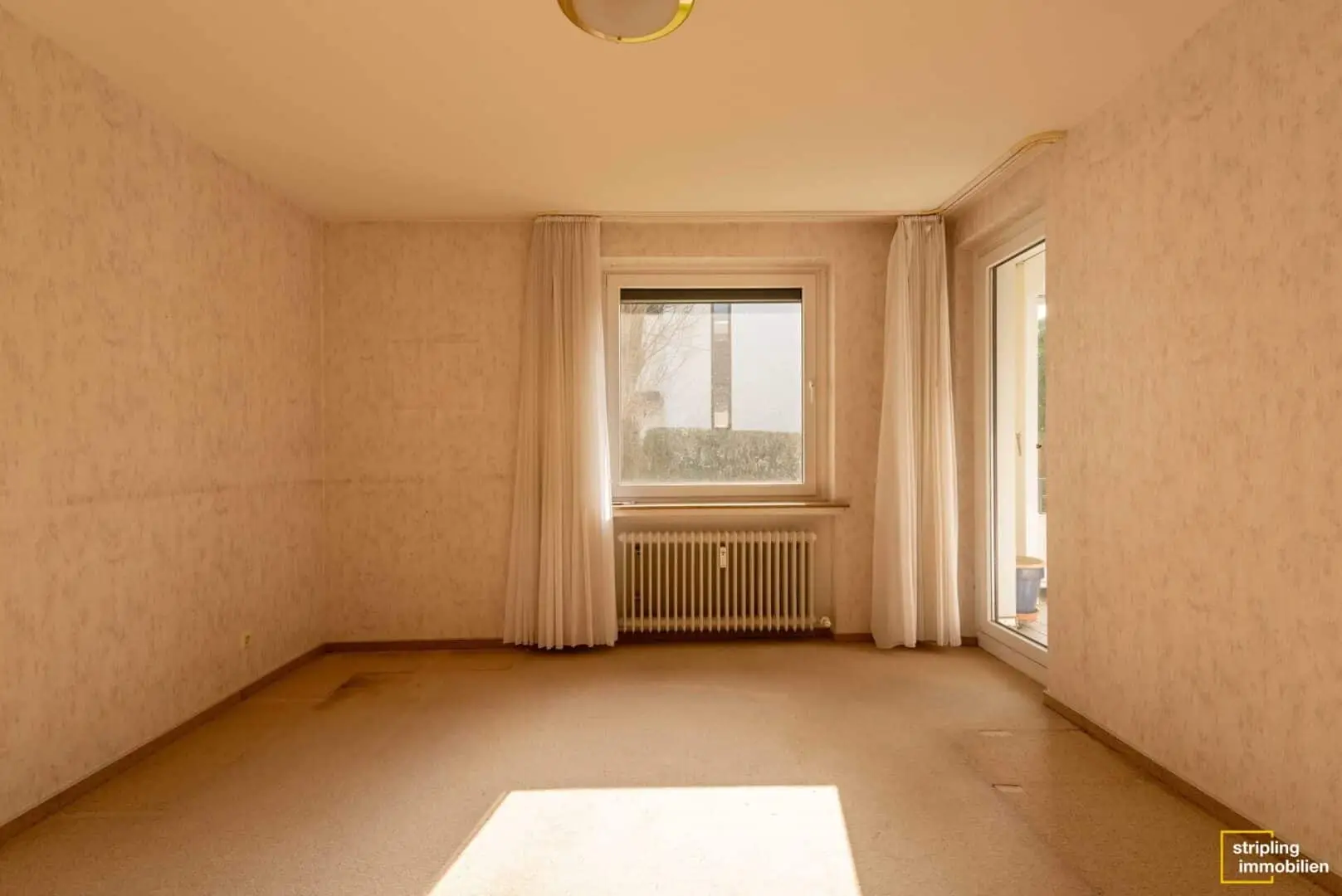Das größte Zimmer der Wohnung ist das Wohnzimmer mit etwa 23,33 m². Es befindet sich rechts neben dem Eingangsbereich und liegt in südlicher Richtung. Ein Blick aus dem Fenster lohnt sich, denn auf dem dahinterliegenden Außengelände befindet sich die gemeinschaftliche Gartenanlage. Elektrische Außenrollläden bieten bei Bedarf einen hervorragenden Sicht- und Sonnenschutz. Das Wohnzimmer ist quadratisch geschnitten und bietet großzügige Stellflächen für unterschiedliche Einrichtungsmöglichkeiten. Auch ein Essbereich lässt sich bei Bedarf wunderbar integrieren. Ein weiteres Highlight ist die Loggia, die sowohl vom Wohnzimmer als auch vom circa 15,08 m² großen Schlafzimmer zu erreichen ist. Sie ist mit einer Markise und Stromanschluss ausgestattet. Können Sie sich vorstellen, wie Sie dort morgens nach dem Aufstehen die ersten Sonnenstrahlen genießen?