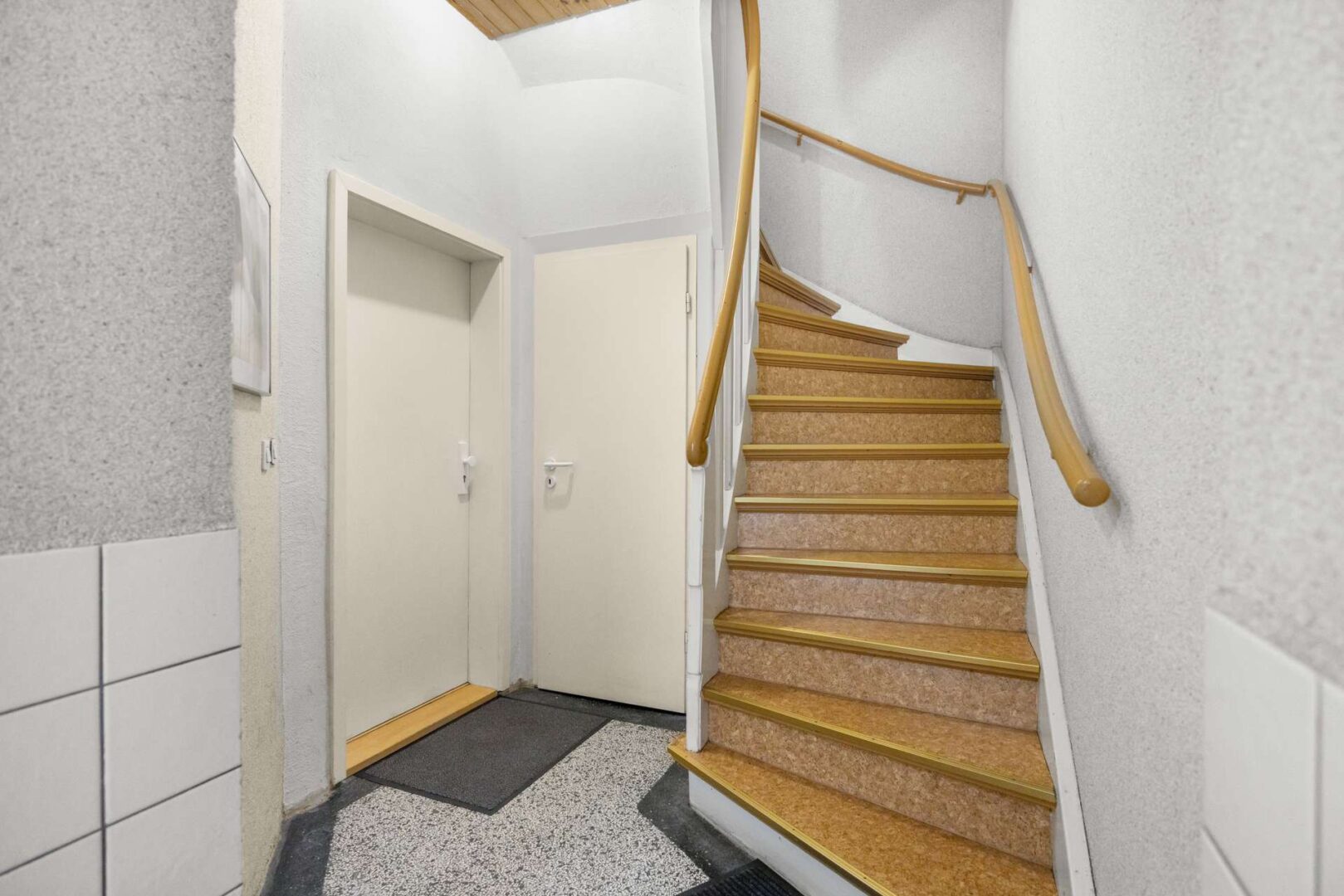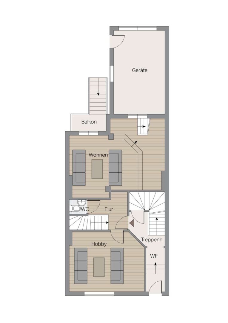 Das Erdgeschoss ist in zwei getrennte Bereiche gegliedert. Straßenseitig befindet sich eine Wohnung mit Zugang über den Hausflur. Von hier aus führt eine interne Treppe in den darunterliegenden, ausgebauten Keller, der als zusätzliche Nutzfläche dient. Der gartenseitige Raum des Erdgeschosses gehört zur darüberliegenden Wohnung und ist über eine Treppe im ersten Obergeschoss erreichbar. Somit entsteht dort eine Maisonette-Struktur, bei der ein weiterer Raum im Erdgeschoss in die Nutzung der oberen Etage einbezogen wird.