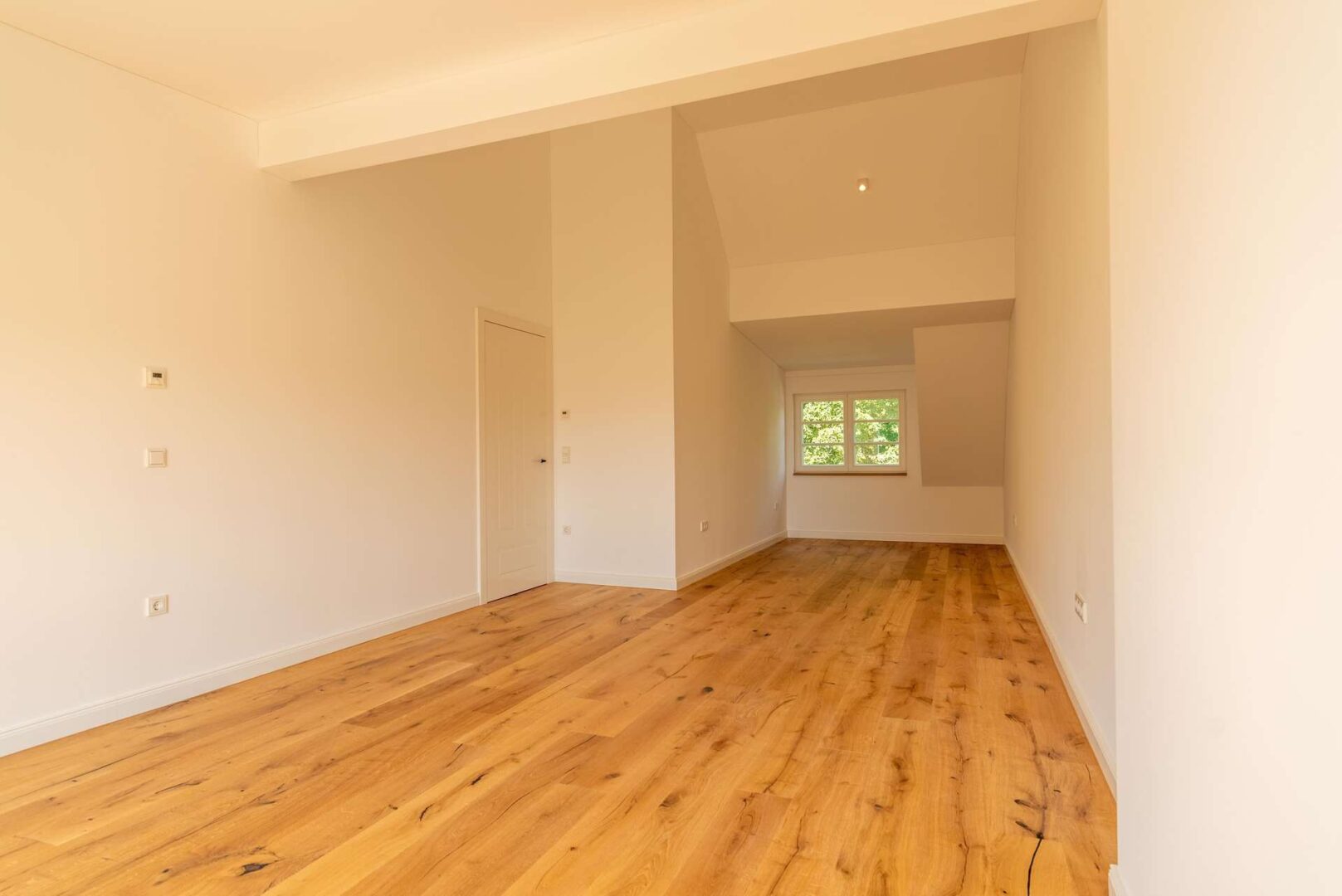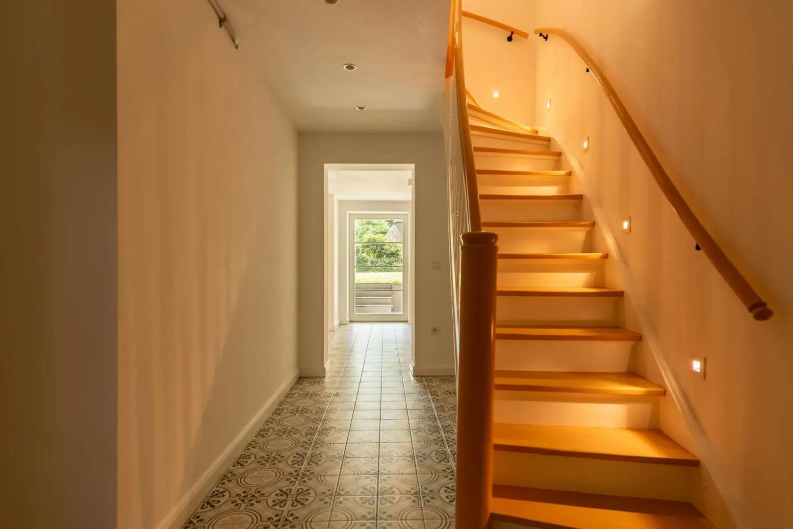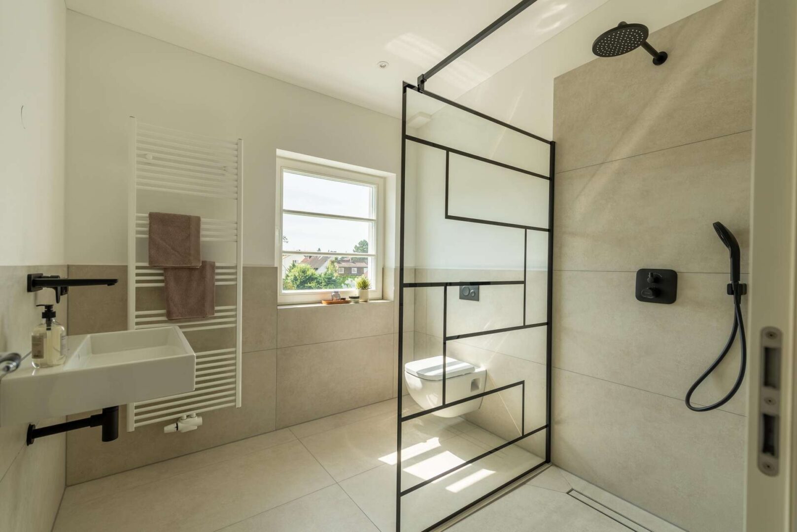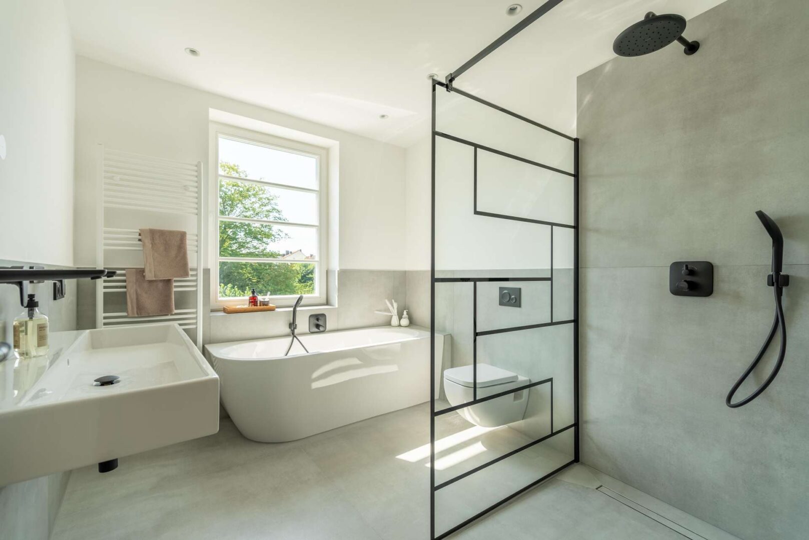 Die Massivholztreppe mit integrierter Spotbeleuchtung verbindet die Etagen und ist ein schönes Beispiel dafür, wie hier alte Substanz und neue Gestaltungsideen harmonisch ineinandergreifen. Drei stilvolle Bäder sowie ein Gäste-WC sind einheitlich gestaltet: großformatige Fliesen, integrierte Dusch-Nischen, Glasabtrennungen mit schwarzen Akzenten und Armaturen in edlem Matt-Schwarz schaffen das Gefühl kleiner Wellness-Oasen.