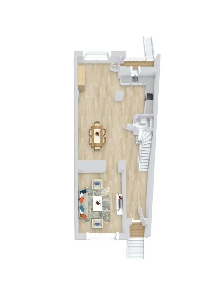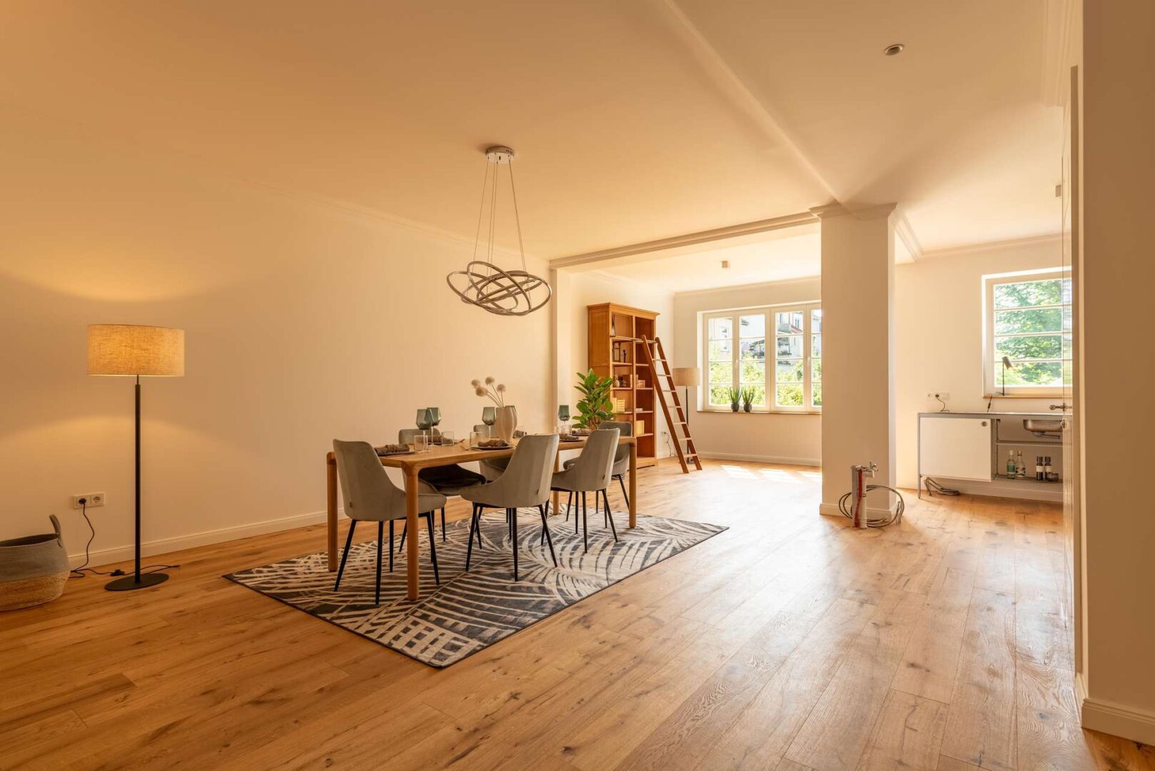 Hochparterre: Das Wohn- und Esszimmer wurde durch einen Wanddurchbruch geschickt miteinander verbunden. Der elektrische Kamin in der Zwischenwand ist von beiden Bereichen aus sichtbar und sorgt für wohnliche Akzente. Alle Anschlüsse für eine exklusive Einbauküche mit Kochinsel sind bereits vorhanden. Vom angrenzenden Balkon führt eine Treppe direkt in den Garten – perfekt für gesellige Sommerabende.
