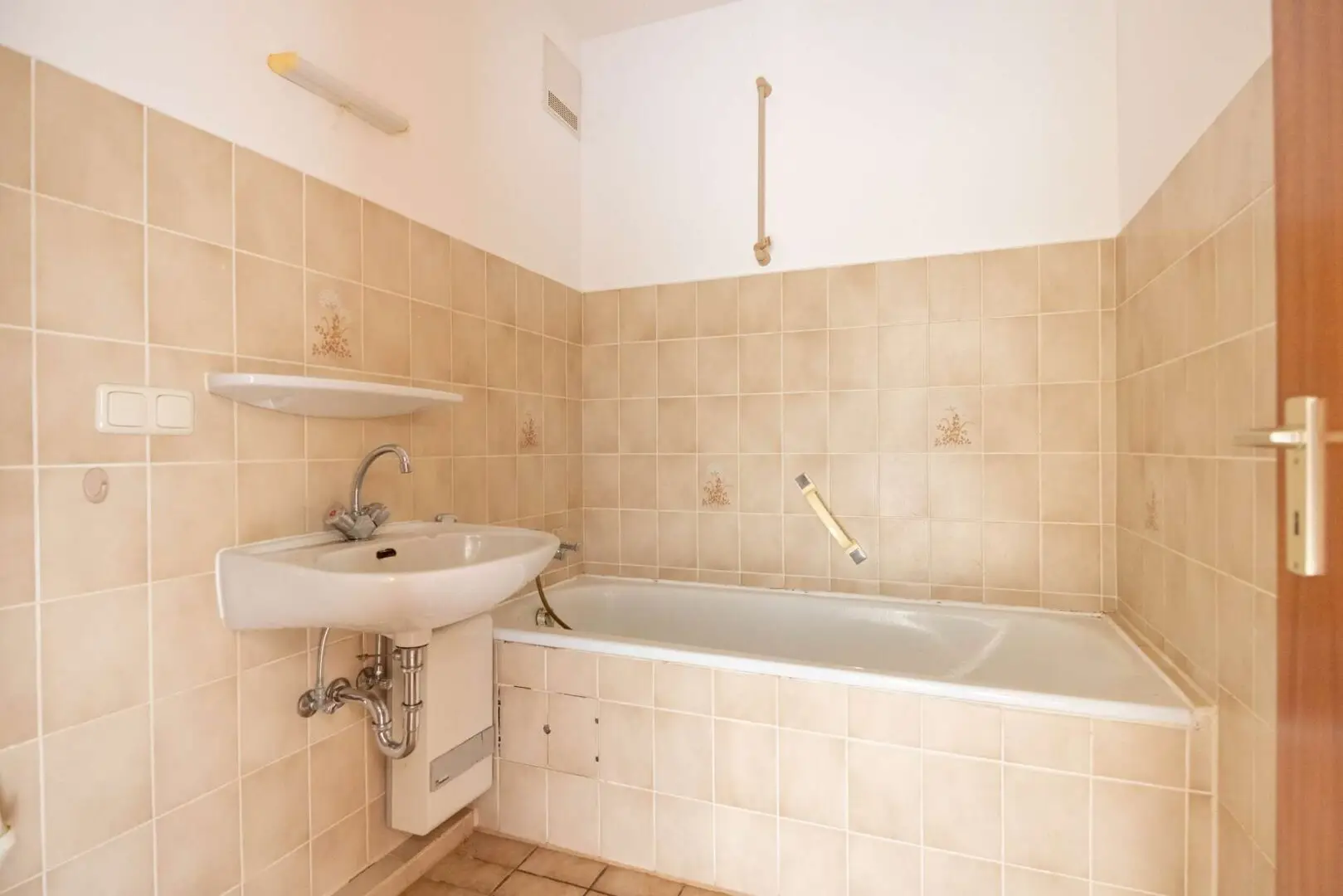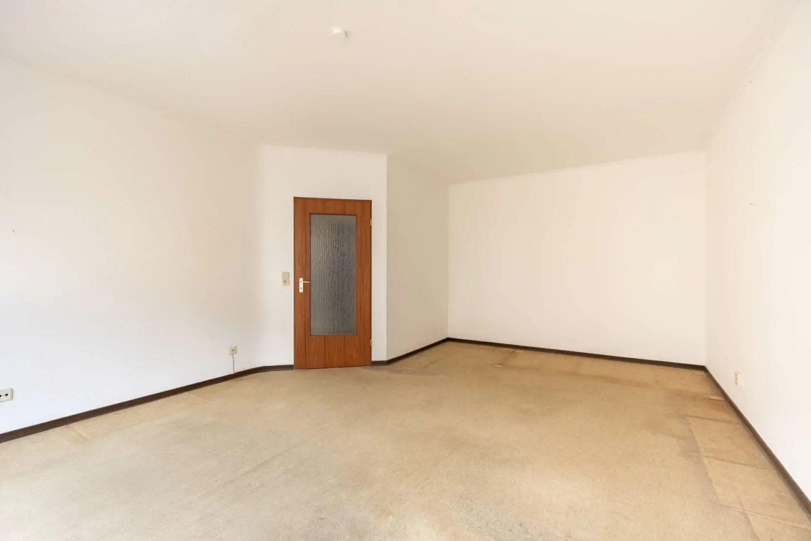 Die beiden Schlafzimmer liegen ruhig auf der gegenüberliegenden Seite. Das Elternschlafzimmer hat 14,78 m², das Kinderzimmer 12,44 m² – beide sind für Bett, Schrank und Schreibtisch groß genug, ohne dass es eng wird. In allen Zimmern liegt noch der originale Teppich aus der Bauzeit. Bad und WC sind ebenfalls original – beides funktionsfähig, beides reif für eine Erneuerung. Wer hier modernisiert, hat freie Hand: Die Raumproportionen passen auch für eine zeitgemäße Neugestaltung.