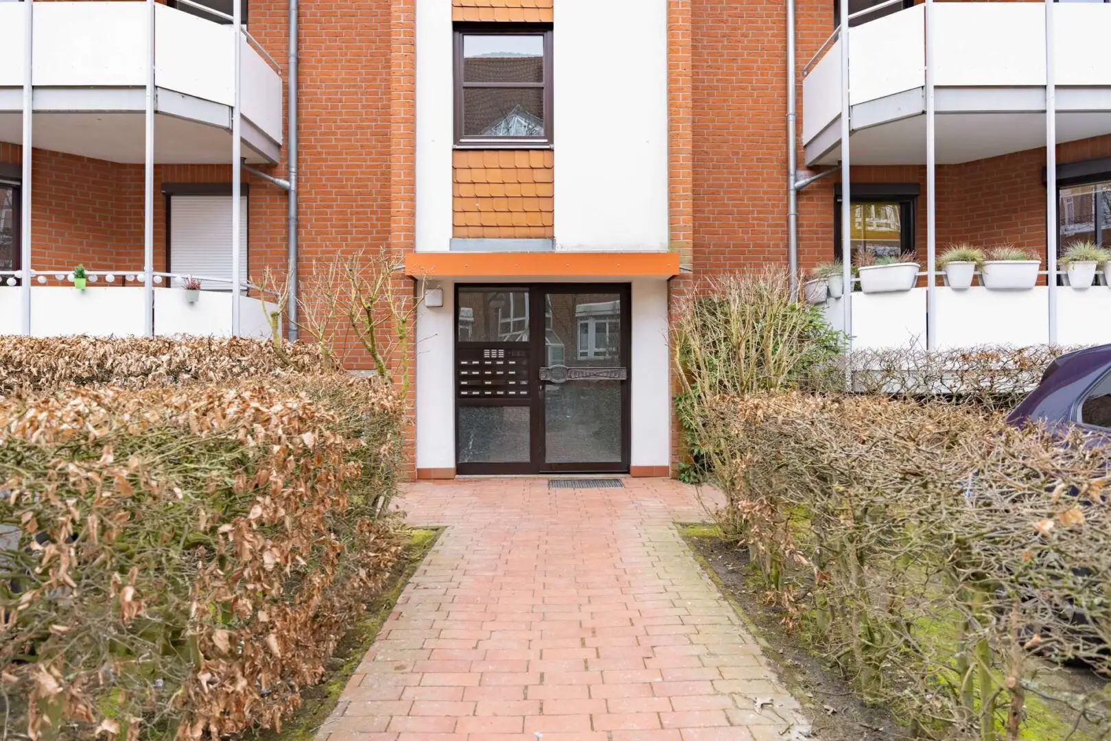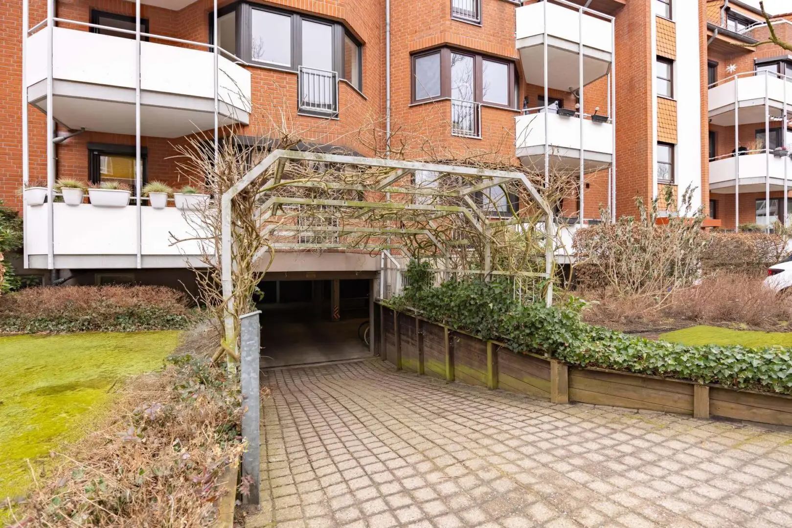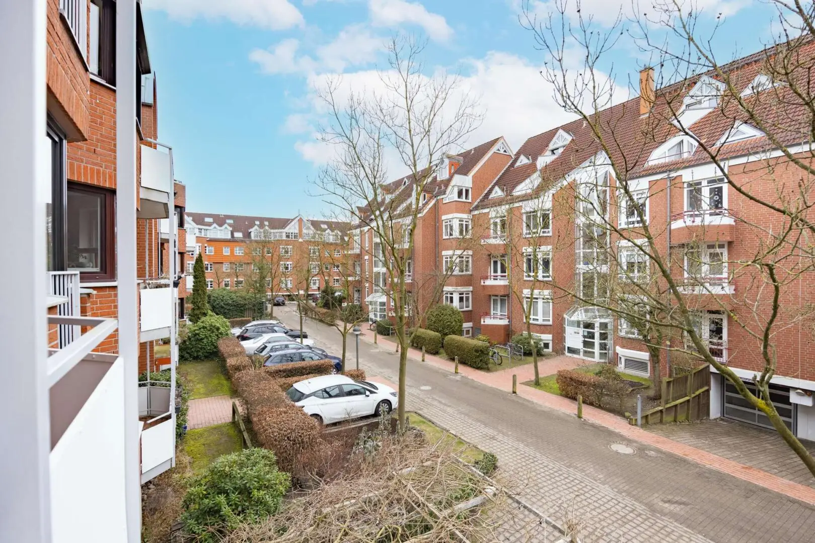 Der Balkon ist überdacht und nach Nordwesten ausgerichtet – keine pralle Mittagssonne, dafür ruhige Abendstunden. Platz für Stühle und ein paar Pflanzen ist da. Die Anlage verfügt über begrünte Innenbereiche.