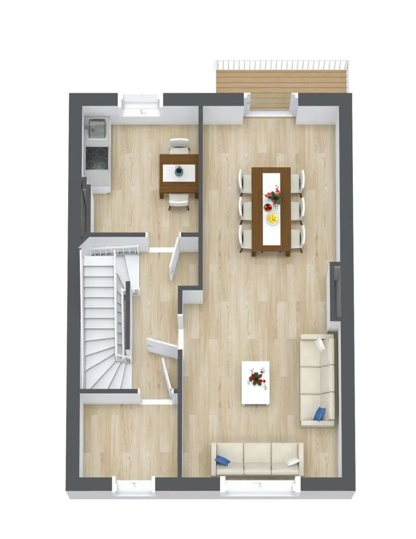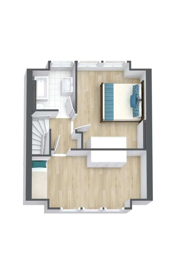 Das Besondere am Wohn- und Esszimmer: Es erstreckt sich über die gesamte Hauslänge und verfügt an beiden Außenwänden über Fenster, die den Raum mit Tageslicht durchfluten. Ein weiterer Pluspunkt ist der Balkon zur Gartenseite in Westausrichtung. Mit einer Grundfläche von ca. 3,11 m² bietet er ausreichend Platz für Tisch und Balkonstühle – perfekt zum Entspannen und Genießen der frischen Luft. Die Dachgeschosszimmer zeichnen sich durch charmante Dachschrägen aus, die mit einer durchdachten Einrichtung optimal genutzt werden können. Der schöne Ausblick rundet das Wohlfühlambiente ab.