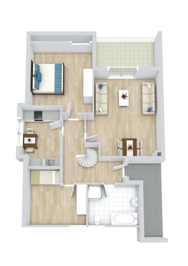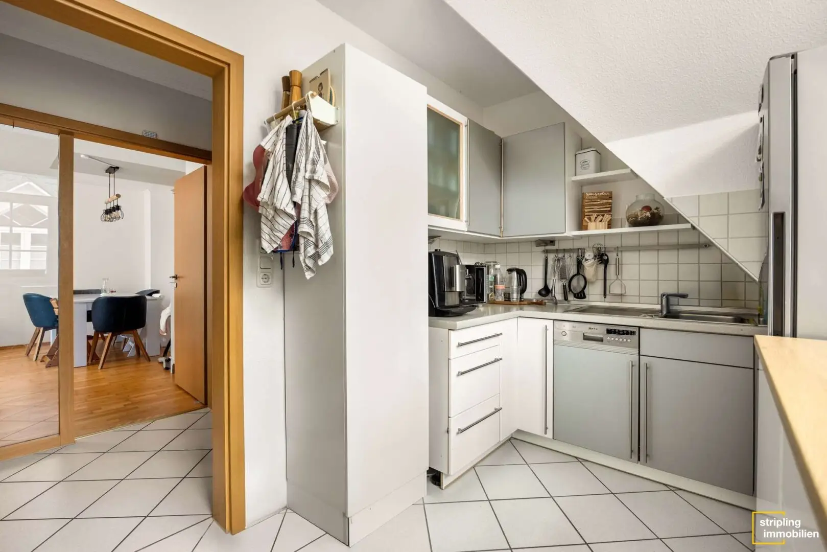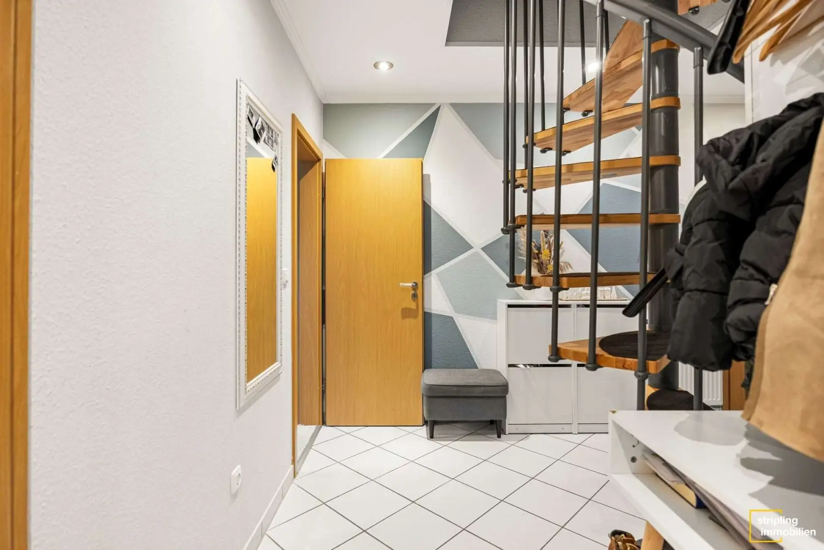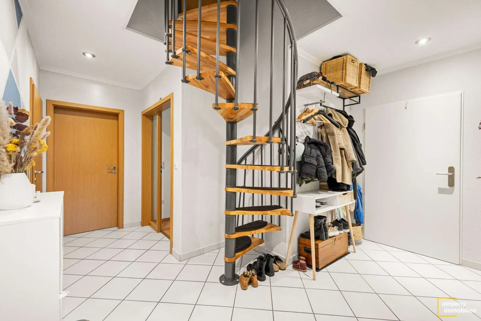 Sobald Sie die Wohnung betreten, gelangen Sie in den L-förmigen Flur. Er ist ebenso wie die Küche und das Badezimmer in Weiß gefliest. Die Türzargen aus Holz sorgen für einen warmen und harmonischen Kontrast. Ein absoluter Blickfang ist die offene Wendeltreppe in der Mitte des Flurs, die zum ausgebauten Spitzboden hinaufführt. Sie ist aus Metall und Holz gefertigt und verleiht dem Raum eine verspielte Eleganz.