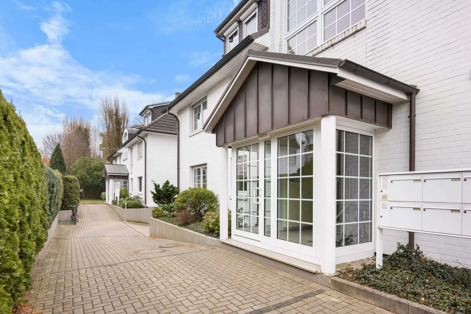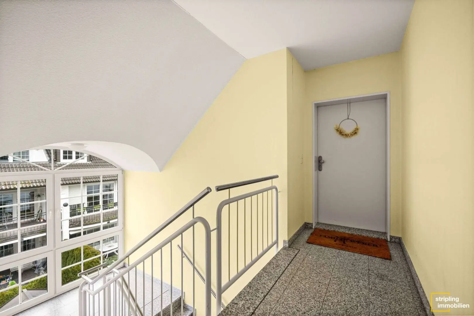 Die Eigentümergemeinschaft erstreckt sich über vier nebeneinanderstehende Häuser. Die dominierenden Farben der Gebäude sind Weiß und Grau. Gepaart mit der Bepflanzung des Vorgartens wirken sie modern und einladend. Gleiches gilt für das Treppenhaus mit seiner zartgelben Wandfarbe und den großen Fensterelementen. Wie Sie bereits aufgrund der Formulierung „Dachgeschosswohnung“ richtig vermuten, sind ein paar Treppen bis zur Wohnungstür zu steigen. Da das Haus allerdings nur aus Erdgeschoss, erstem Obergeschoss und Dachgeschoss besteht, ist die Anzahl überschaubar. Handläufe auf beiden Seiten der Treppe sorgen für Sicherheit und unterstützen bei Bedarf.