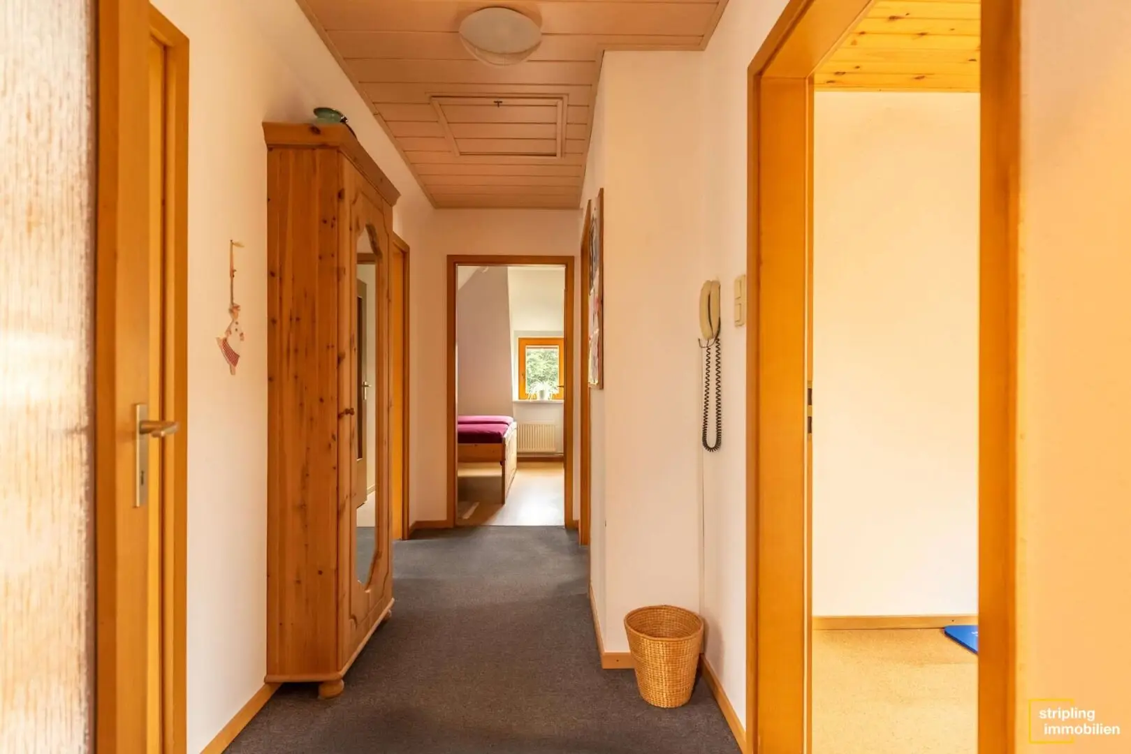 Die erste Tür rechts führt in eines der Schlafzimmer, das sich gut für ein Kind oder für Gäste eignet. Das Elternschlafzimmer ist hinter der zweiten Tür rechts zu finden. Es ist größer und bietet somit viel Raum für ein Doppelbett und einen Schrank. Von hier haben Sie eine schöne Sicht auf den Garten. Links befindet sich ein weiteres Schlafzimmer, das etwas kleiner ausfällt, dafür aber ebenfalls die Gartensicht hat.