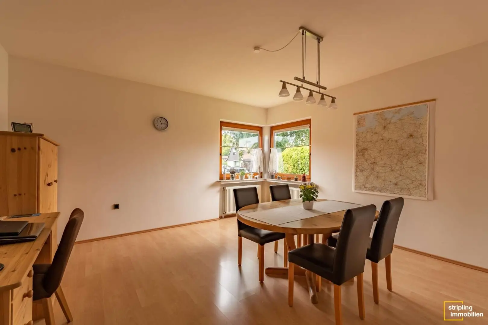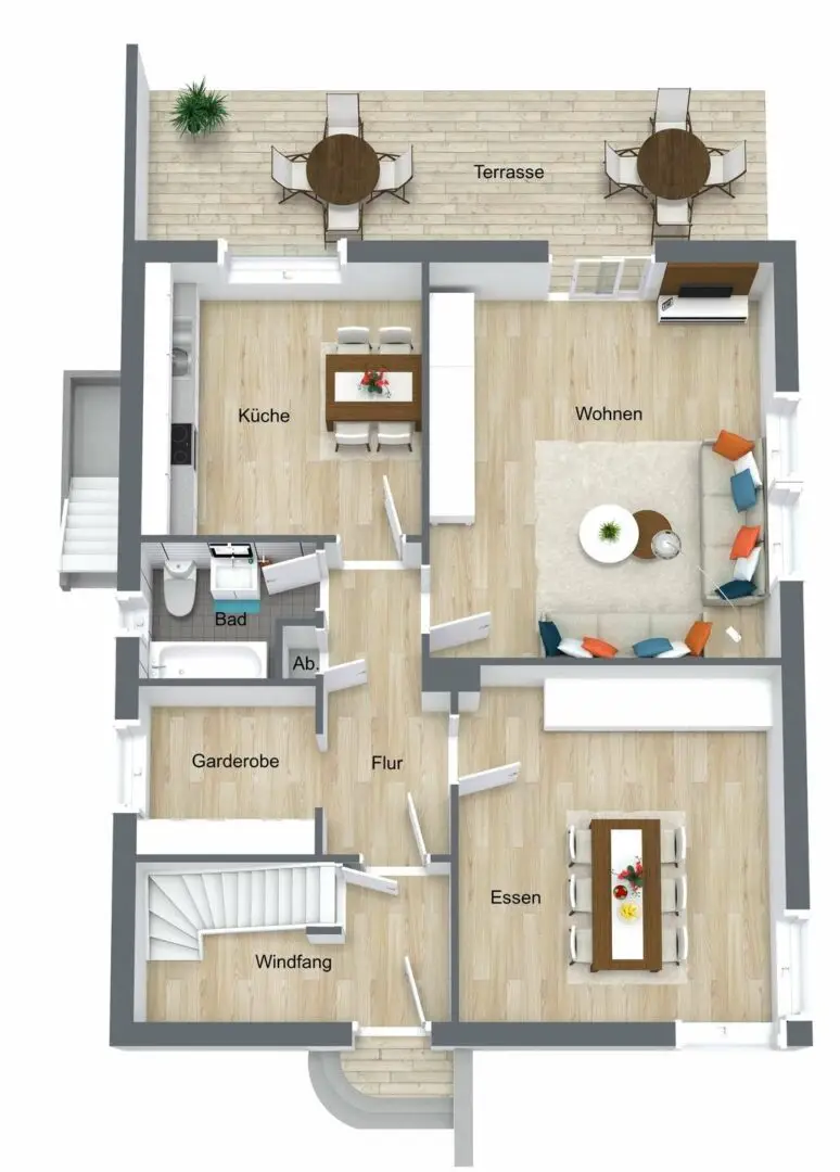 Sie betreten das Einfamilienhaus durch einen praktischen Windfang. Links führt eine Treppe in das Obergeschoss. Geradeaus kommen Sie in den Flur, der viel Platz für eine Garderobe bietet. Hier kann die ganze Familie ihre Jacken, Schuhe, Regenschirme und Taschen aufbewahren. Vom Flur aus kommen Sie in das schöne Esszimmer mit Eckfenster. Ein großer Tisch lädt dazu ein, mit sechs oder mehr Personen auf einmal zu speisen. Zudem ist Platz für praktische Ablagen oder sogar ein Mini-Buffet.